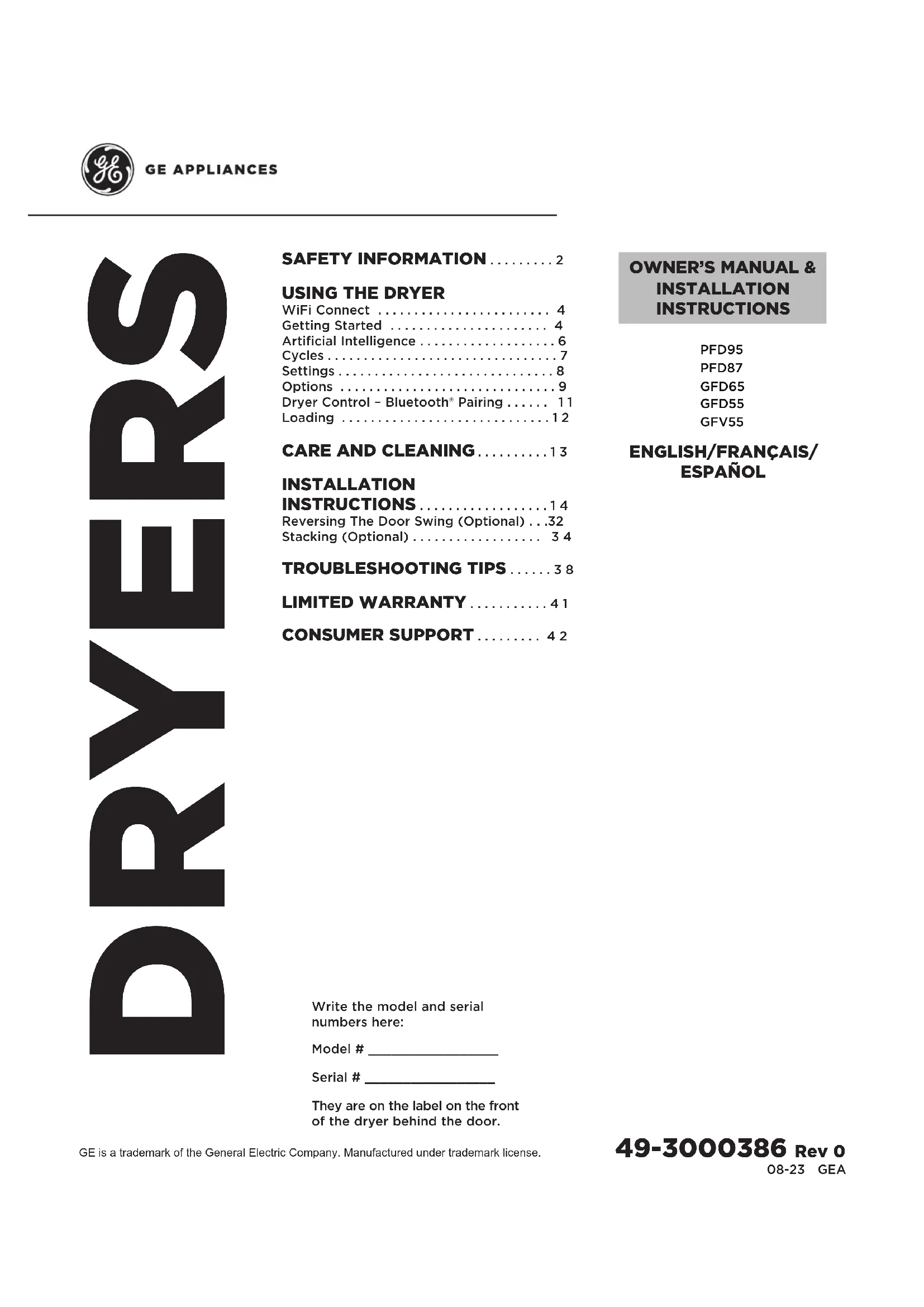 GUIDE DE L’UTILISATEUR ET INSTRUCTION D’INSTALLATION Inscrivez ici les numéros de modèle et de série : Modèle # ________________ Série # __________________ Ces informations figurent sur l’étiquette située à l’avant de la sécheuse, derrière la porte. FRANÇAIS 49-3000386 Rev 0 PFD95 PFD87 GFD65 GFD55 GFV552 49-3000386 Rev 0 LIRE ET