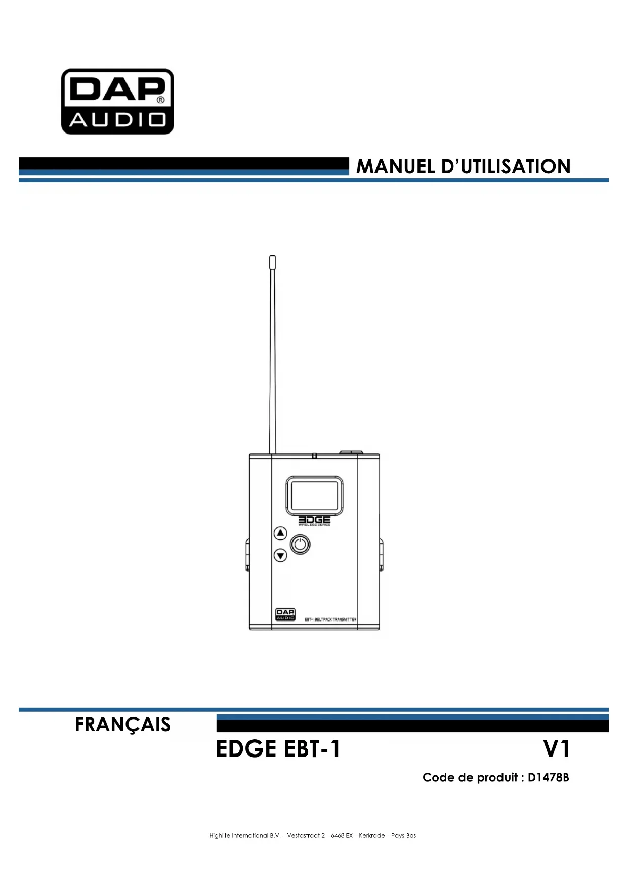 EDGE EBT-1 Code de produit : D1478B Avant-propos Merci d’avoir acheté ce produit DAP. Ce manuel d’utilisation a pour but de fournir des instructions pour une utilisation correcte et sûre de ce produit. Conservez le manuel d’utilisation pour vous y référer ultérieurement car il fait partie intégrante du produit. Le manuel d’utilisation doit être conservé dans un endroit facilement accessible. Ce manuel d’utilisation contient des informations concernant : ● Consignes de sécurité ● Installation et fonctionnement de l’appareil ● Utilisation prévue et non prévue de l’appareil ● Procédures d’entretien ● Résolution des problèmes ● Transport, stockage et mise au rebut de l’appareil Le non-respect des instructions de ce manuel d’utilisation peut entraîner des blessures graves et des dommages matériels.