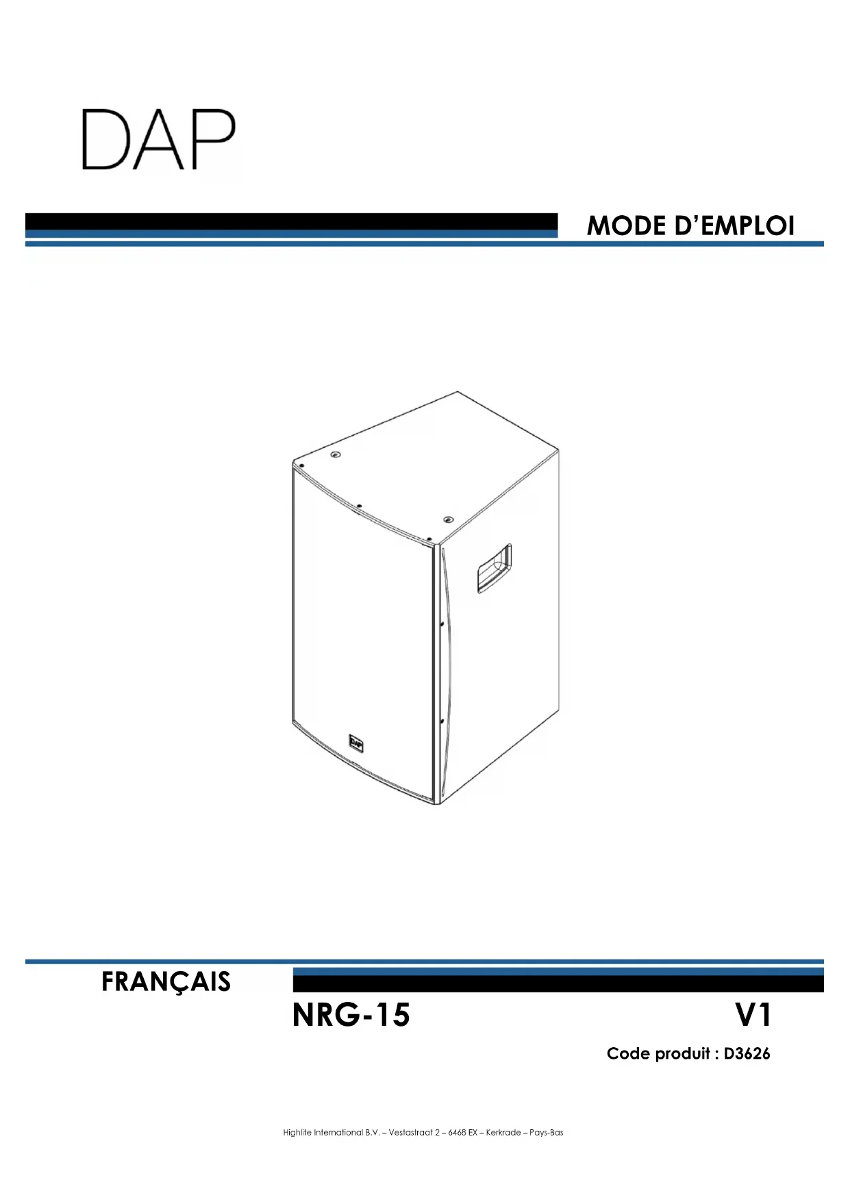 NRG-15 Code produit : D3626 Préface Nous vous remercions d’avoir fait l’acquisition de ce produit DAP. L’objectif de ce mode d’emploi est de vous fournir des instructions pour une utilisation correcte et sûre de ce produit. Conservez le mode d’emploi pour pouvoir le consulter ultérieurement, car il fait partie intégrante du produit. Le mode d’emploi doit être conservé dans un endroit facilement accessible. Ce mode d’emploi contient des informations concernant : ● Consignes de sécurité ● Installation et fonctionnement de l’appareil ● Utilisations conformes et non conformes de l’appareil ● Procédures d’entretien ● Dépannage ● Transport, stockage et élimination de l’appareil Le non-respect des instructions contenues dans ce mode d’emploi peut entraîner des blessures graves et des dommages matériels.