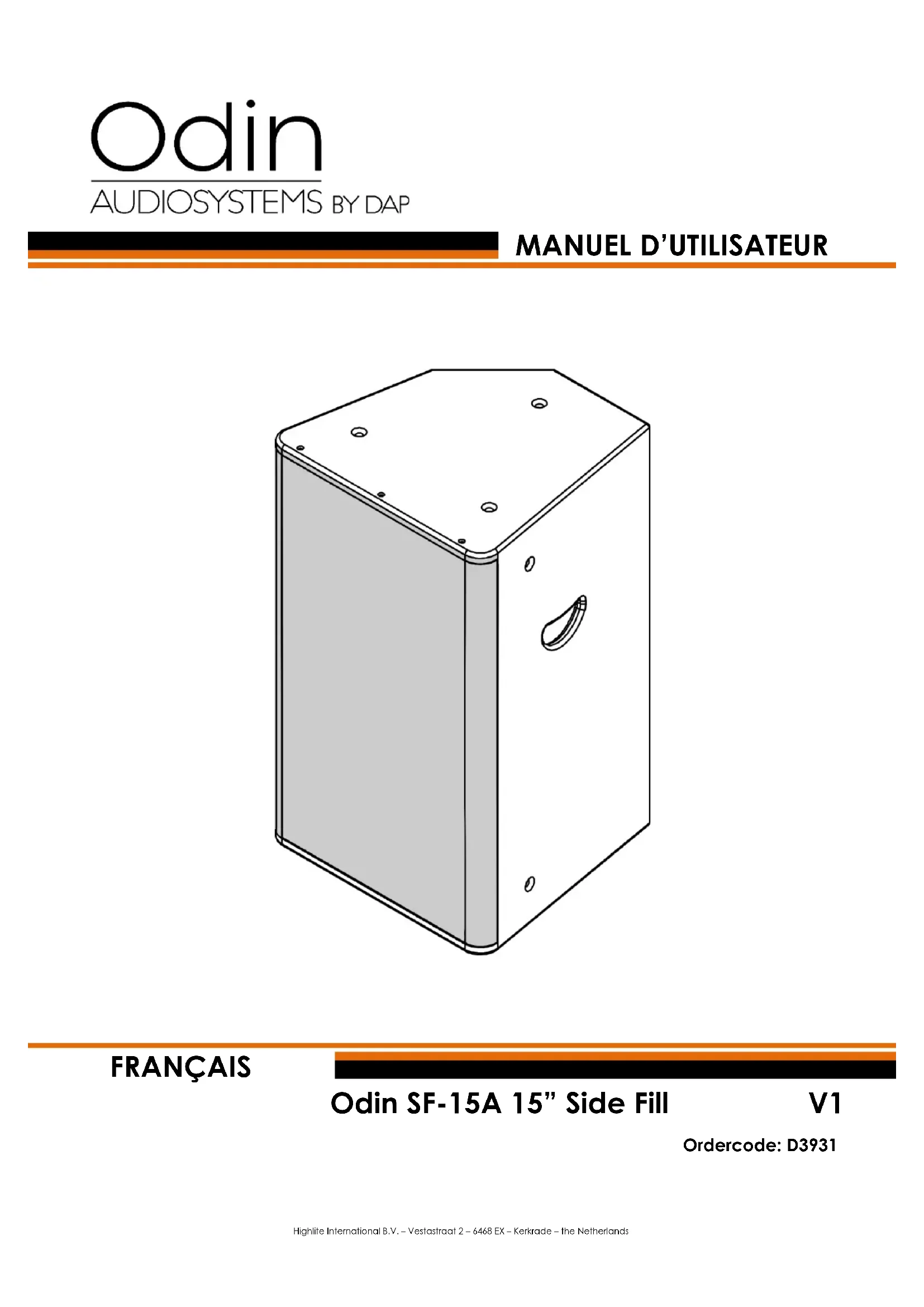 Réclamations Le client est tenu de vérifier les marchandises livrées dès leur réception, afin de détecter tout problème ou défaut visible potentiel. Ces vérifications peuvent également avoir lieu après que nous l’ayons averti de la mise à disposition des marchandises. Le transporteur est responsable de tous les dommages ayant eu lieu durant le transport ; par conséquent, les dommages doivent être signalés au transporteur à réception de la marchandise. En cas de dégât subi lors du transport, le client doit en informer l’expéditeur et lui soumettre toute réclamation. Signaler les dommages résultant du transport dans un délai d’un (1) jour suivant la réception de la livraison. Toujours s’acquitter de l’affranchissement postal des biens retournés. Accompagner les marchandises renvoyées d’une lettre définissant les raisons du renvoi. S’ils ne sont pas affranchis, les biens retournés seront refusés, sauf accord contraire par écrit. Nous faire parvenir toutes les réclamations nous concernant par écrit ou par fax, dans un délai de 10 jours suivant la réception de la facture. Une fois cette période écoulée, les réclamations ne seront plus traitées. Les réclamations signalées dans les délais seront uniquement considérées si le client s’est dûment conformé à toutes les sections du contrat auquel se rapportent les obligations, quelle qu’en soit la nature.6 Ordercode: D3931 Odin SF-15A 15” Side Fill Description de l’appareil Caractéristiques Le Odin SF-15A est un, 2 voies gamme complète, actif, bi-amplifiés, Haut-parleur. Elle est équipée de transducteurs haute performance, robustes, spécialement conçus par Celestion. Ces modèles permettent aux ingénieux du son de délivrer un son de qualité et correctement distribué sur scène. Grâce à des moniteurs de scène distincts, chaque membre du groupe reçoit son propre mixage personnel. Mais en ajoutant les Side Fills autour de la scène, de préférence dans un cadre X-Stage, chaque interprète entend exactement ce qui se passe avec tous les autres instruments sur scène. Cela donne plus de liberté à l'ingénieur du son et donne la possibilité de concevoir une installation scénique plus grande. ● Système: armoire 2 voies gamme complète ● Alimentation: 100–240 V AC, 50/60 Hz ● Consommation: 700 W ● Puissance AMP: 800 W en continu, Bi-AMP(Classe D-350 W LF, Classe AB-130 W HF), crête à 3200 W ● Haut-parleur: Circuit d'attaque à compression de celestion de 1 po, bobine vocale de 1,75 po, 60 W RMS, 240 W crête à crête Woofer 15" Celestion, revêtement résistant à l'eau, bobine vocale 3", 350W-RMS/1400W- Peak ● Réponse en fréquence (+/-3 dB): 50 Hz–19 kHz ● SPL max. à 1 m: 129 dB ● Fréquence de coupure: 1,6 kHz ● Dispersion (-6 dB): 80° Horizontal/60° Vertical (Avertisseur rotatif) ● Refroidissement: Refroidissement passif + refroidissement forcé à l'intérieur ● Connecteur audio: 3-pin Entrées et sorties XLR ● Connecteur de données: RJ45 Connecteur d'entrée de date et de liaison en cascade RJ45 ● Contrôles externes: 9 Preset fixe + 1 Preset modifiable, Interrupteur d'alimentation avec voyants LED pour Clip / SIG / PROT ● Processeur DSP: 32 bit, 24 bit/48 kHz Conversion audio AD/DA ● Protections électroniques: Thermique / Ventilateur de convection / Surcharge / Limiteur numérique / Compresseur ● Connecteur secteur: Connecteur Neutrik PowerCON Entrée et sortie ● Construction de l'armoire: Contreplaqué de bouleau de 15 mm, peinture noire résistante, grille en métal de 1,5 T avec mousse, une poignée sur chaque côté, revêtement résistant à l'eau ● Montage sur poteau: 36 mm ● Boulons à œil filetés: M10 ● Fusibles: T6,3AL/250V ● Dimensions: 439 x 395 x 711 mm (l x L x H) ● Poids: 25,94 kg