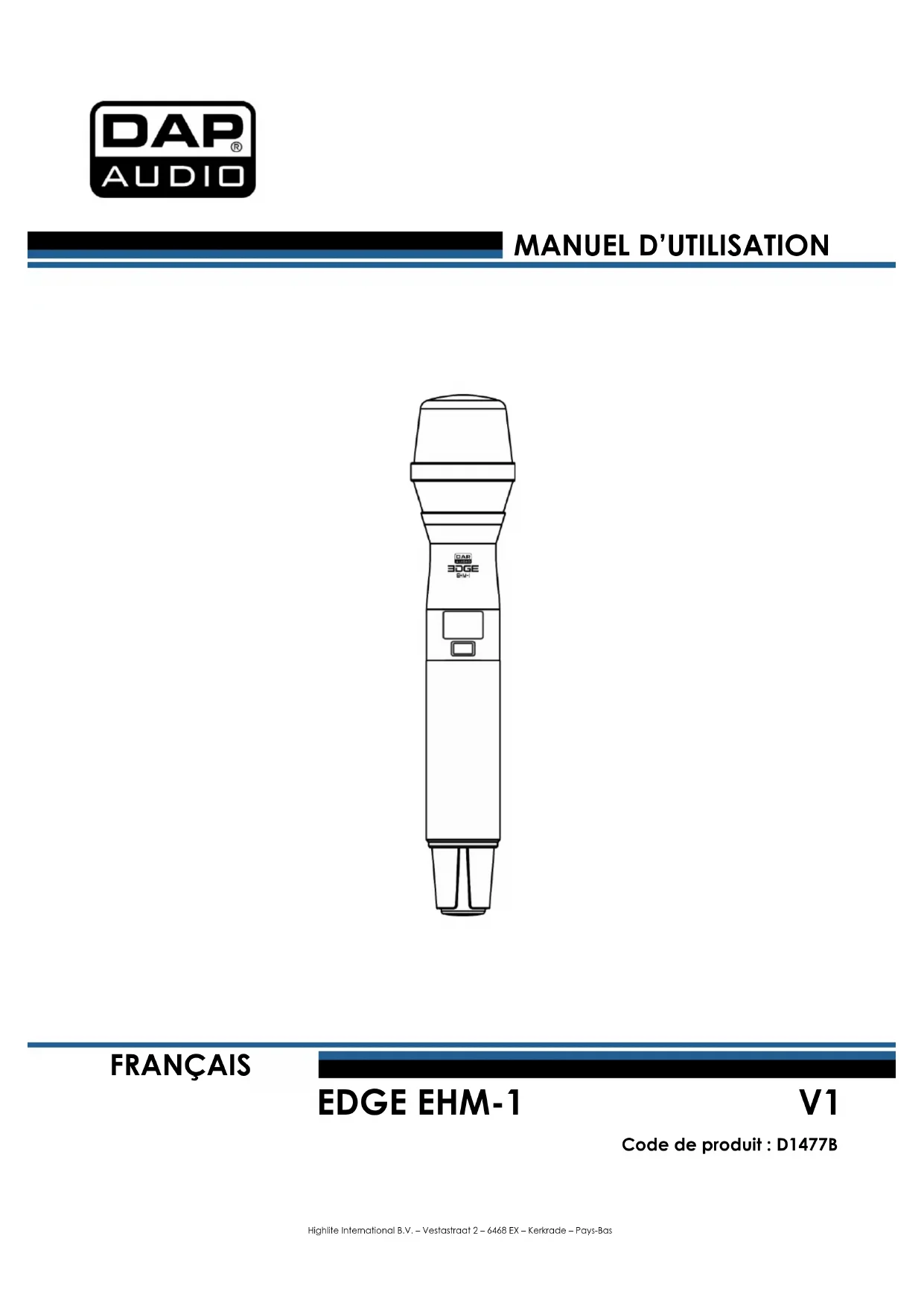 EDGE EHM-1 Code de produit : D1477B Avant-propos Merci d’avoir acheté ce produit DAP. Ce manuel d’utilisation a pour but de fournir des instructions pour une utilisation correcte et sûre de ce produit. Conservez le manuel d’utilisation pour vous y référer ultérieurement car il fait partie intégrante du produit. Le manuel d’utilisation doit être conservé dans un endroit facilement accessible. Ce manuel d’utilisation contient des informations concernant : ● Consignes de sécurité ● Installation et fonctionnement de l’appareil ● Utilisation prévue et non prévue de l’appareil ● Procédures d’entretien ● Résolution des problèmes ● Transport, stockage et mise au rebut de l’appareil Le non-respect des instructions de ce manuel d’utilisation peut entraîner des blessures graves et des dommages matériels.