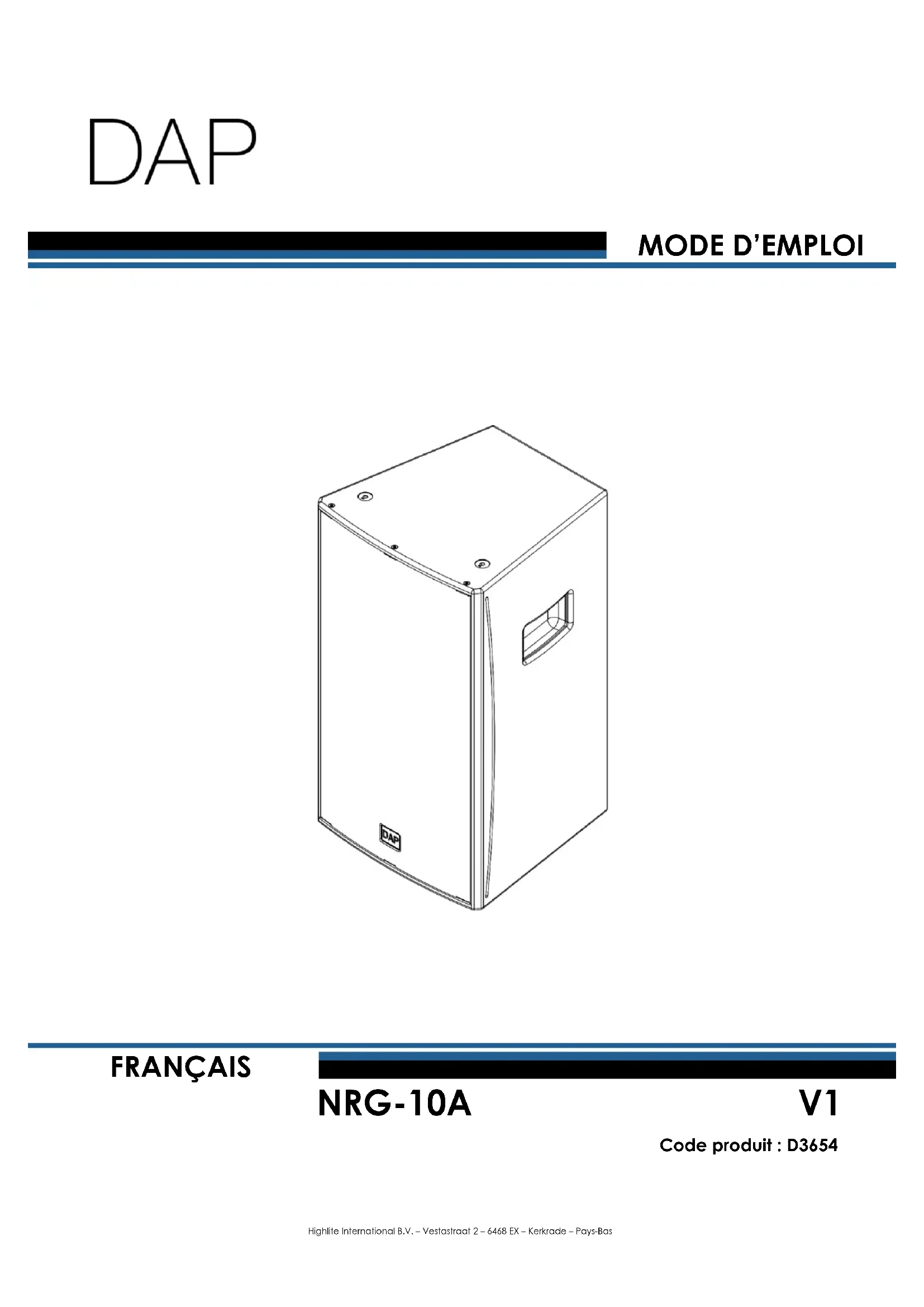 NRG-10A Code produit : D3654 Préface Merci d’avoir fait l’acquisition de ce produit DAP. L’objectif de ce mode d’emploi est de vous fournir des instructions pour une utilisation correcte et sûre de ce produit. Conservez le mode d’emploi pour pouvoir le consulter ultérieurement, car il fait partie intégrante du produit. Le mode d’emploi doit être conservé dans un endroit facilement accessible. Ce mode d’emploi contient des informations concernant : ● Consignes de sécurité ● Installation et fonctionnement de l’appareil ● Utilisations conformes et non conformes de l’appareil ● Procédures d’entretien ● Dépannage ● Transport, stockage et élimination de l’appareil Le non-respect des instructions contenues dans ce mode d’emploi peut entraîner des blessures graves et des dommages matériels.