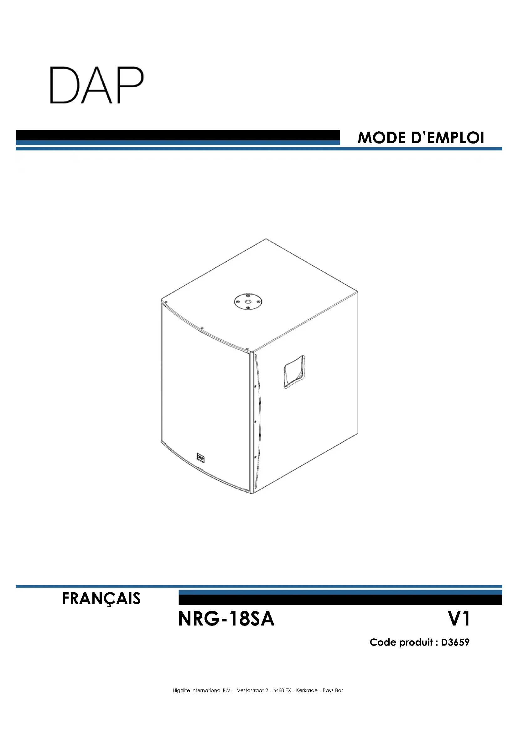 NRG-18SA Code produit : D3659 Préface Nous vous remercions d’avoir fait l’acquisition de ce produit DAP. L’objectif de ce mode d’emploi est de vous fournir des instructions pour une utilisation correcte et sûre de ce produit. Conservez le mode d’emploi pour pouvoir le consulter ultérieurement, car il fait partie intégrante du produit. Le mode d’emploi doit être conservé dans un endroit facilement accessible. Ce mode d’emploi contient des informations concernant : ● Consignes de sécurité ● Installation et fonctionnement de l’appareil ● Utilisations conformes et non conformes de l’appareil ● Procédures d’entretien ● Dépannage ● Transport, stockage et élimination de l’appareil Le non-respect des instructions contenues dans ce mode d’emploi peut entraîner des blessures graves et des dommages matériels.