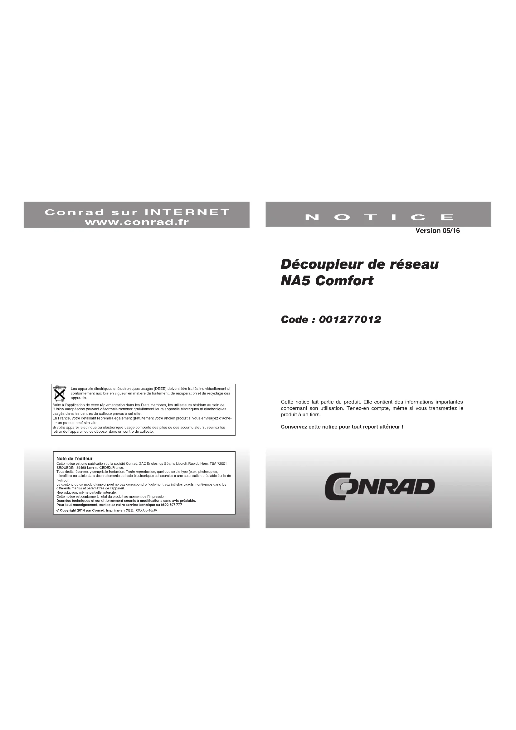 Découpleur de réseau NA5 Comfort Code : 001277012 Cette notice fait partie du produit. Elle contient des informations importantes concernant son utilisation. Tenez-en compte, même si vous transmettez le produit à un tiers. Conservez cette notice pour tout report ultérieur ! NOTICE Conrad sur INTERNET www.conrad.fr Version 05/16 Les appareils électriques et électroniques usagés (DEEE) doivent être traités individuellement et conformément aux lois en vigueur en matière de traitement, de récupération et de recyclage des appareils.Suite à l’application de cette réglementation dans les Etats membres, les utilisateurs résidant au sein de l’Union européenne peuvent désormais ramener gratuitement leurs appareils électriques et électroniques usagés dans les centres de collecte prévus à cet effet. En France, votre détaillant reprendra également gratuitement votre ancien produit si vous envisagez d’ache- ter un produit neuf similaire.Si votre appareil électrique ou électronique usagé comporte des piles ou des accumulateurs, veuillez les retirer de l’appareil et les déposer dans un centre de collecte.Note de l’éditeurCette notice est une publication de la société Conrad, ZAC Englos les Géants Lieu-dit Rue du Hem, TSA 72001 SEQUEDIN, 59458 Lomme CEDEX/France.Tous droits réservés, y compris la traduction. Toute reproduction, quel que soit le type (p.ex. photocopies, microfilms ou saisie dans des traitements de texte électronique) est soumise à une autorisation préalable écrite de l’éditeur.Le contenu de ce mode d'emploi peut ne pas correspondre fidèlement aux intitulés exacts mentionnés dans les différents menus et paramètres de l'appareil.Reproduction, même partielle, interdite.Cette notice est conforme à l’état du produit au moment de l’impression.Données techniques et conditionnement soumis à modifications sans avis préalable.Pour tout renseignement, contactez notre service technique au 0892 897 777 © Copyright 2014 par Conrad. Imprimé en CEE. XXX/05-16/JV2 7 Informations sur le produit Tension réseau / Charge réseau admissible 230 V AC +/- 10 %, 16 A, charge pour lampe à incandescence 3500 W Durée de vie mécanique du relais Environ 15 000 000 cycles de manœuvres Ondulation résiduelle (nominale / typique / maximale) < 4 mV / < 8 mV / < 16 mV Tension de surveillance Tension continue à courant faible biocompatible (max. 8 mA, 230 V DC) Coupure unipolaire pour une protection optimale des personnes et une ondulation résiduelle minimale. Les surcouplages sont détournés grâce à une sortie à fiable impédance. Innovation Cette technique de pointe a fait l’objet de nombreux brevets déposés. Sécurité Les découpleurs Comfort NA1 à NA8 sont les premiers interrupteurs de réseau ayant obtenu la certification VDE, qui garantit le respect de normes de sécurité très strictes (numéro de certification VDE : 40000677). Utilité pratique Les découpleurs de Gigahertz Solutions sont installés par des électriciens confirmés depuis de nombreuses années. Ils sont recommandés par des géobiologues renommés et sont utilisés au quotidien dans des milliers de foyers. Accessoire utile Pour améliorer les propriétés CEM du découpleur et la qualité du réseau, il est possible d’utiliser un simple « filtre réseau 1µF » (à pincer sous les deux entrées). Garantie 2 ans6 3 Notice de montage et d’utilisation Informations produit Veuillez lire attentivement cette notice d’utilisation avant la première mise en service. Elle contient des informations importantes pour la sécurité, le montage et l’utilisation de l’appareil. Exemples : Petits consommateurs permanents (radios-réveils, variateurs sensoriels, amplificateurs d’antenne, détecteurs de mouvement, minuteurs, commande de volets roulants, réfrigérateurs, lave-vaisselle, lits à eau, thermostat pour chauffage électrique, téléphones confort, fax, imprimantes, scanners, etc.) Appareils en charge (rasoirs, brosses à dents, téléphones, consoles de jeu, etc.) Appareils en veille (chaînes hi-fi, téléviseurs, enregistreurs vidéo, etc.) Tous ces appareils consomment du courant même lorsqu’ils sont éteints ; il est donc judicieux de les couper du réseau, par exemple à l’aide d’un bloc multiprise. Veillez à bien respecter la polarité sur les blocs multiprises commutables de manière unipolaire (la phase doit être déconnectée). Des courants de fuite trop élevés dans les murs, des interrupteurs lumineux trop nombreux ou des « mini-lampes » peuvent également empêcher le découplage. La série Comfort « supporte » des résistances d’isolation jusqu’à 47 kOhm environ dans le réseau de distribution. La série ultima permet de découpler en même temps les appareils causant des problèmes évoqués ci-dessus. Pour plus d’informations, consultez notre site Internet : www.gigahertz-solutions.de. Autres indications relatives aux fonctions La technique de commutation utilisée ici est compatible avec tous les consommateurs électroniques courants. Mais il peut toujours exister des exceptions. Dans ce cas, allumez brièvement un consommateur auxiliaire pour la mise en marche (lampe à incandescence par exemple) ou installez une charge de base (disponible comme accessoire) en parallèle au consommateur. Le découpleur peut fonctionner même avec des télérupteurs possédant une tension de commande de 230 Volt. Les télérupteurs de ce type sont utilisés par exemple pour l’éclairage de couloirs ou de cages d’escalier utilisable à partir de plusieurs interrupteurs. Une protection interne contre la surchauffe peut empêcher l’appareil d’effectuer el découplage seul en cas de surtensions de l’extérieur. Dans ce cas, débranchez pendant une minute puis rebranchez le disjoncteur automatique monté en série, puis remettez l’appareil en marche pour le réinitialiser. Le cas échéant, laissez un espace d’un demi-pas d’en