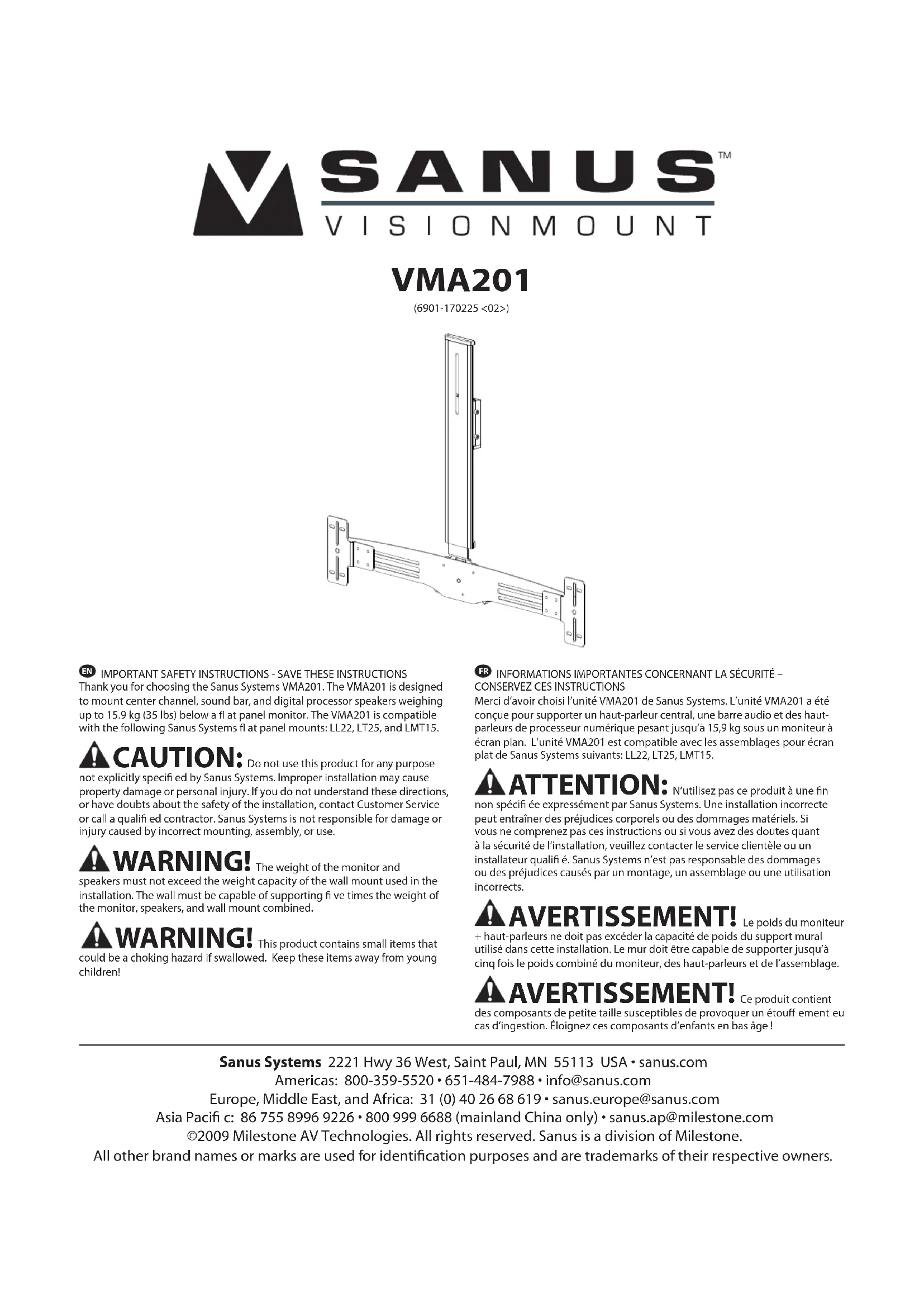 Merci d’avoir choisi l’unité VMA201 de Sanus Systems. L’unité VMA201 a été conçue pour supporter un haut-parleur central, une barre audio et des haut- parleurs de processeur numérique pesant jusqu’à 15,9 kg sous un moniteur à écran plan. L’unité VMA201 est compatible avec les assemblages pour écran plat de Sanus Systems suivants: LL22, LT25, LMT15. ATTENTION: N’utilisez pas ce produit à une n non spéci ée expressément par Sanus Systems. Une installation incorrecte peut entraîner des préjudices corporels ou des dommages matériels. Si vous ne comprenez pas ces instructions ou si vous avez des doutes quant à la sécurité de l’installation, veuillez contacter le service clientèle ou un installateur quali é. Sanus Systems n’est pas responsable des dommages ou des préjudices causés par un montage, un assemblage ou une utilisation incorrects. AVERTISSEMENT! Le poids du moniteur + haut-parleurs ne doit pas excéder la capacité de poids du support mural utilisé dans cette installation. Le mur doit être capable de supporter jusqu’à cinq fois le poids combiné du moniteur, des haut-parleurs et de l’assemblage. AVERTISSEMENT! Ce produit contient des composants de petite taille susceptibles de provoquer un étou ement eu cas d’ingestion. Éloignez ces composants d’enfants en bas âge !6901-170225 <02>
