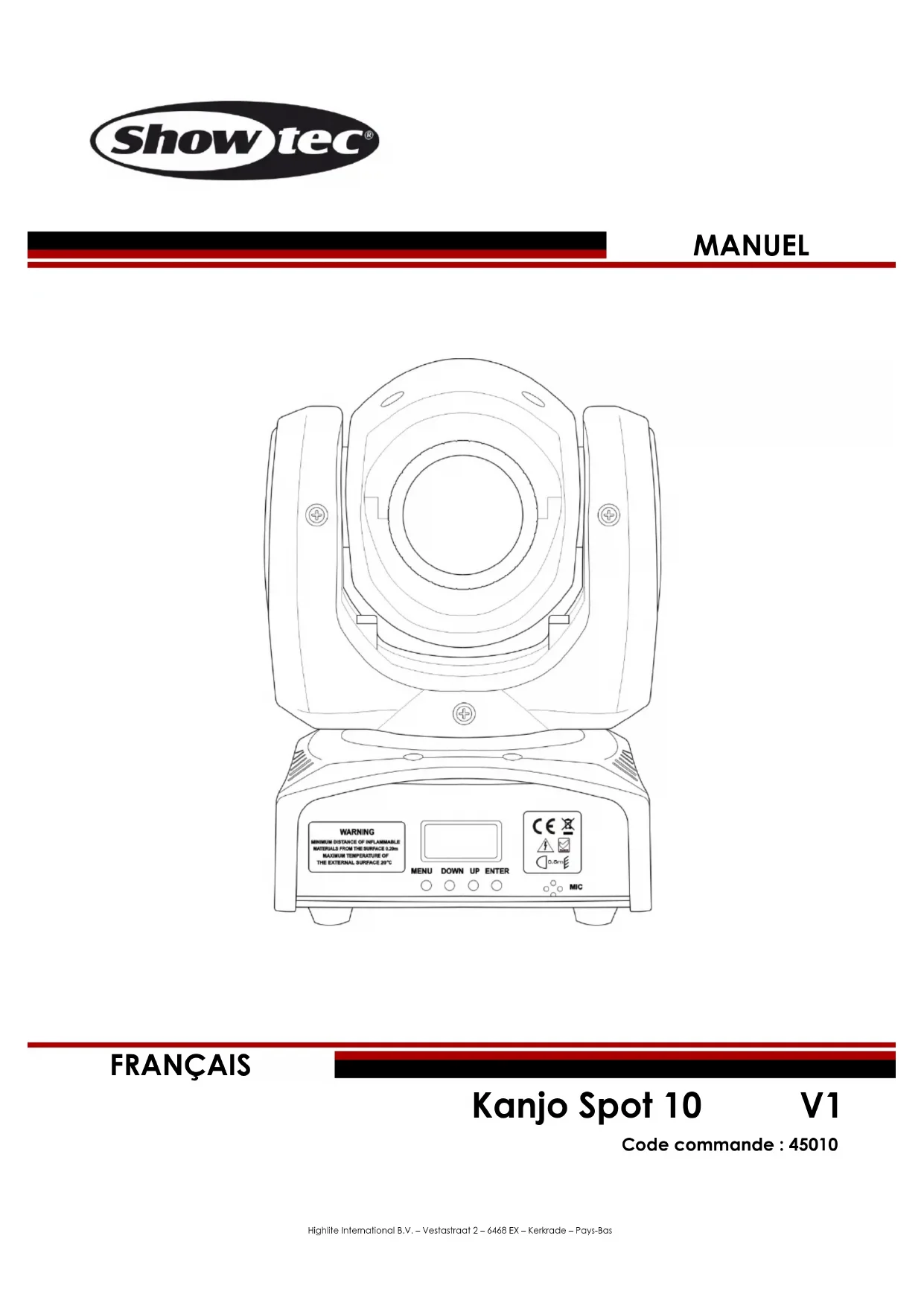 Avant la première mise en marche de votre appareil, assurez-vous qu’aucun dommage n’a été causé pendant le transport. Dans le cas contraire, contactez votre revendeur.3 Code commande : 45010 Kanjo Spot 10 Pour conserver votre matériel en bon état et s’assurer qu’il fonctionne correctement et en toute sécurité, il est absolument indispensable pour l’utilisateur de suivre les consignes et avertissements de sécurité de ce manuel. Veuillez noter que les dommages causés par tout type de modification manuelle apportée à l’appareil ne sont en aucun cas couverts par la garantie. Cet appareil ne contient aucune pièce susceptible d’être réparée par l’utilisateur. Confiez les opérations de maintenance et les réparations à des techniciens qualifiés. IMPORTANT : Le fabricant ne sera en aucun cas tenu responsable des dommages causés par le non-respect de ce manuel ou par des modifications non autorisées de l’appareil.