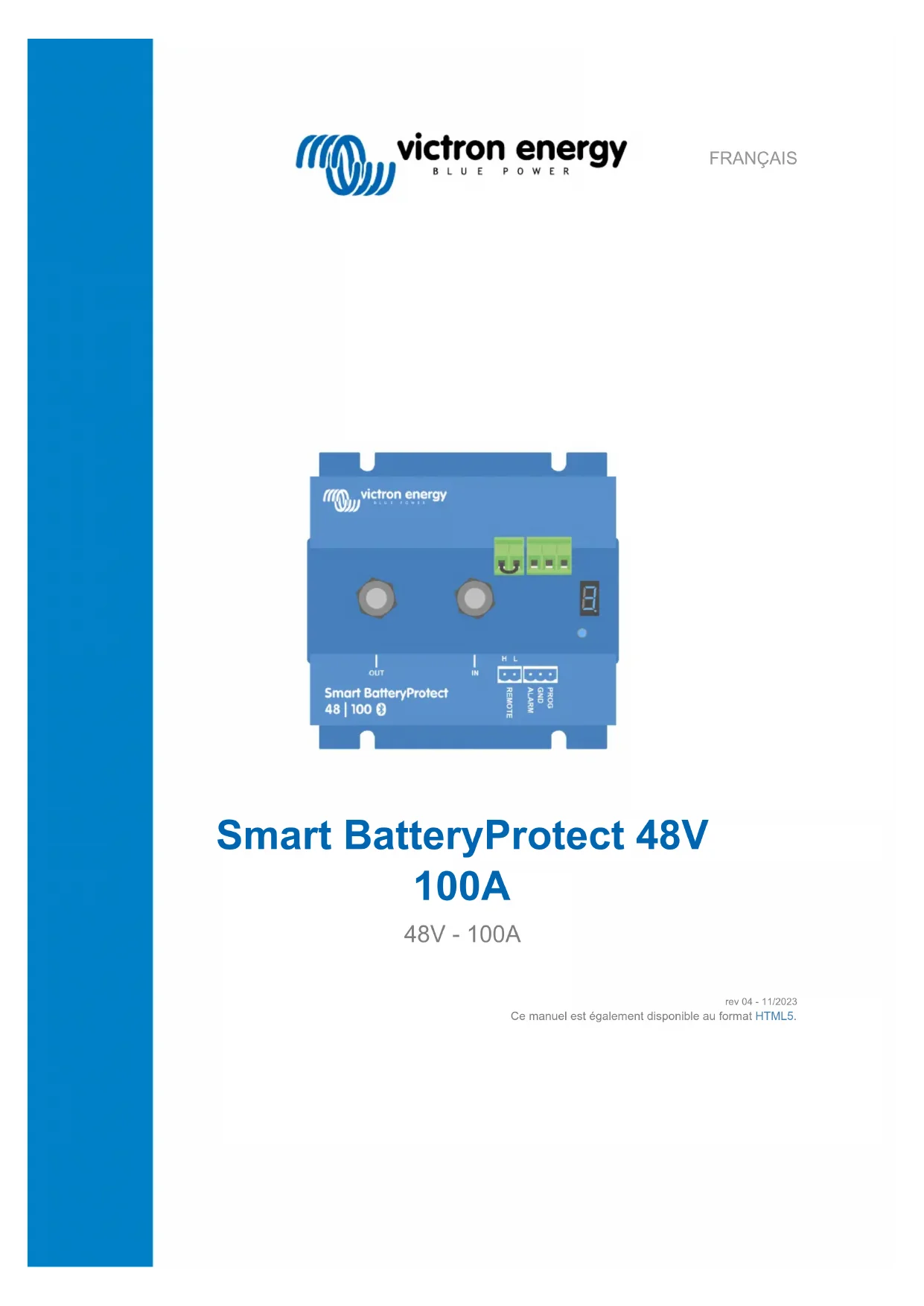 - 7.1. Codes d’erreur et d’avertissement Smart BatteryProtect 48V 100A1. Introduction Le Smart BatteryProtect déconnecte la batterie des consommateurs non essentiels avant qu’elle ne soit complètement déchargée (ce qui l’endommagerait) ou avant qu’il ne lui reste pas suffisamment de puissance pour faire démarrer le moteur. Il offre également une alternative pour désactiver les chargeurs sans port d’allumage/arrêt à distance afin de les protéger contre les surtensions. Par rapport au BatteryProtect, le Smart BatteryProtect peut être programmé de manière pratique via Bluetooth et notre application VictronConnect [11]. Une autre façon de programmer le SBP est de relier la broche PROG à la broche GND [11]. Tous les paramètres nécessaires peuvent être réglés de cette façon. VictronConnect offre également l’option Instant Readout (lecture instantanée), qui permet de lire et d’afficher en temps réel les valeurs clés, y compris les notifications d’avertissements, d’alarmes et d’erreurs, sans nécessiter de connexion couplée avec le Smart BatteryProtect, ce qui permet d’effectuer des diagnostics en un coup d’œil. Le Smart BatteryProtect est un dispositif unidirectionnel. Il ne peut traiter le courant que dans un seul sens : soit le courant vers une charge, soit le courant depuis le chargeur, mais pas les deux en même temps. De plus, le courant ne peut se déplacer que de la borne IN à la borne OUT. Smart BatteryProtect 48V 100A Page 1 Introduction2. Fonctions Le Smart BatteryProtect offre un large éventail de fonctionnalités. Parmi celles-ci : p. 16