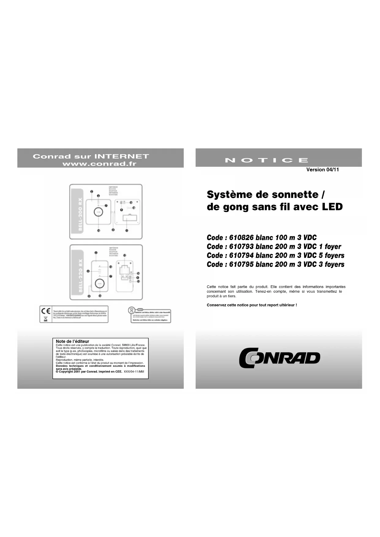 Note de l’éditeur Cette notice est une publication de la société Conrad, 59800 Lille/France.Tous droits réservés, y compris la traduction. Toute reproduction, quel que soit le type (p.ex. photocopies, microfilms ou saisie dans des traitements de texte électronique) est soumise à une autorisation préalable écrite de l’éditeur.Reproduction, même partielle, interdite.Cette notice est conforme à l’état du produit au moment de l’impression.Données techniques et conditionnement soumis à modifications sans avis préalable.© Copyright 2001 par Conrad. Imprimé en CEE. XXX/04-11/MM Système de sonnette / de gong sans fil avec LED Code : 610826 blanc 100 m 3 VDC Code : 610793 blanc 200 m 3 VDC 1 foyer Code : 610794 blanc 200 m 3 VDC 5 foyers Code : 610795 blanc 200 m 3 VDC 3 foyers Cette notice fait partie du produit. Elle contient des informations importantes concernant son utilisation. Tenez-en compte, même si vous transmettez le produit à un tiers.Conservez cette notice pour tout report ultérieur ! N O T I C E Conrad sur INTERNET www.conrad.fr Version 04/112 7 Nous vous remercions pour l’achat de ce système de sonnette/de gong sans fil. Veuillez lire attentivement la notice et conservez-la pour tout report ultérieur. Pour le montage de ce système, aucun câble n’est nécessaire. Si le bouton de sonnette est activé, l’unité extérieure (l’émetteur) émet un signal à l’unité intérieure (récepteur) et déclenche le signal qui a été sélectionné. L’unité intérieure peut être utilisé de façon mobile, par exemple chez vous, dans votre bureau ou jardin. La portée est de 100 à 200 mètres sous des conditions optimales selon le modèle. La portée peut être influencée par différents facteurs, par exemple châssis de porte métallique ou en UPVC, parois ou antres appareils qui fonctionnent sur la même fréquence.