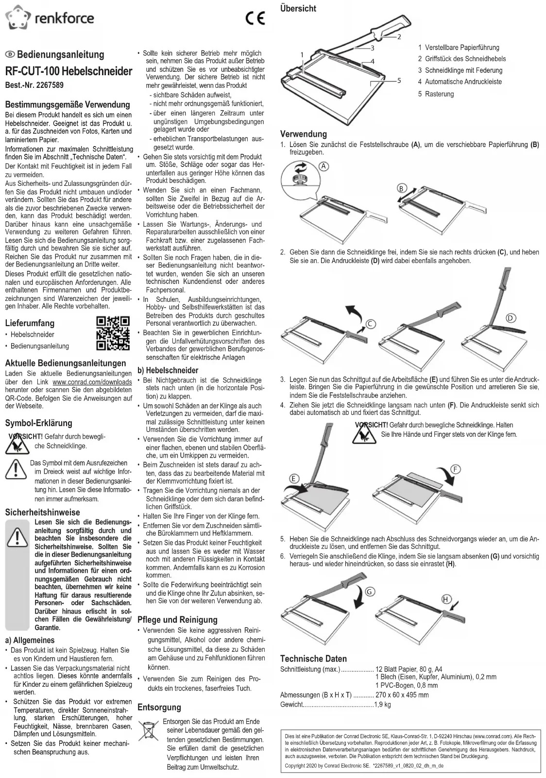 Caractéristiques techniques Capacité de coupe (max.) ............ 12 feuilles de papier, 80 g, A4 Tôles de 1 x 0,2 mm (fer, cuivre, aluminium) 1 feuille de PVC de 0,8 mm Dimensions (l x h x p) ................... 270 x 60 x 495 mm Poids ............................................. 1,9 kg Mode d’emploi RF-CUT-100 Massicot N° de commande 2267589 Utilisation prévue Le produit est une coupeuse à levier. Certains usages comprennent le découpage de pho- tos, de cartes et de papier laminé. Reportez-vous à la section « Données techniques » pour obtenir des informations sur la capacité de coupe maximale. Dans tous les cas, le contact avec l’humidité doit être évité. Pour des raisons de sécurité et d’homologati- on, toute restructuration et/ou modication du produit est interdite. Toute utilisation à des ns autres que celles décrites ci-dessus pourrait endommager le produit. En outre, une mau- vaise utilisation vous expose à d’autres ris- ques. Lisez attentivement les instructions du mode d’emploi et conservez-le dans un end- roit sûr. Ne mettez ce produit à la disposition de tiers qu’avec son mode d’emploi. Ce produit est conforme aux exigences nati- onales et européennes en vigueur. Tous les noms d’entreprises et appellations de produits sont des marques commerciales de leurs pro- priétaires respectifs. Tous droits réservés. Contenu de l’emballage
