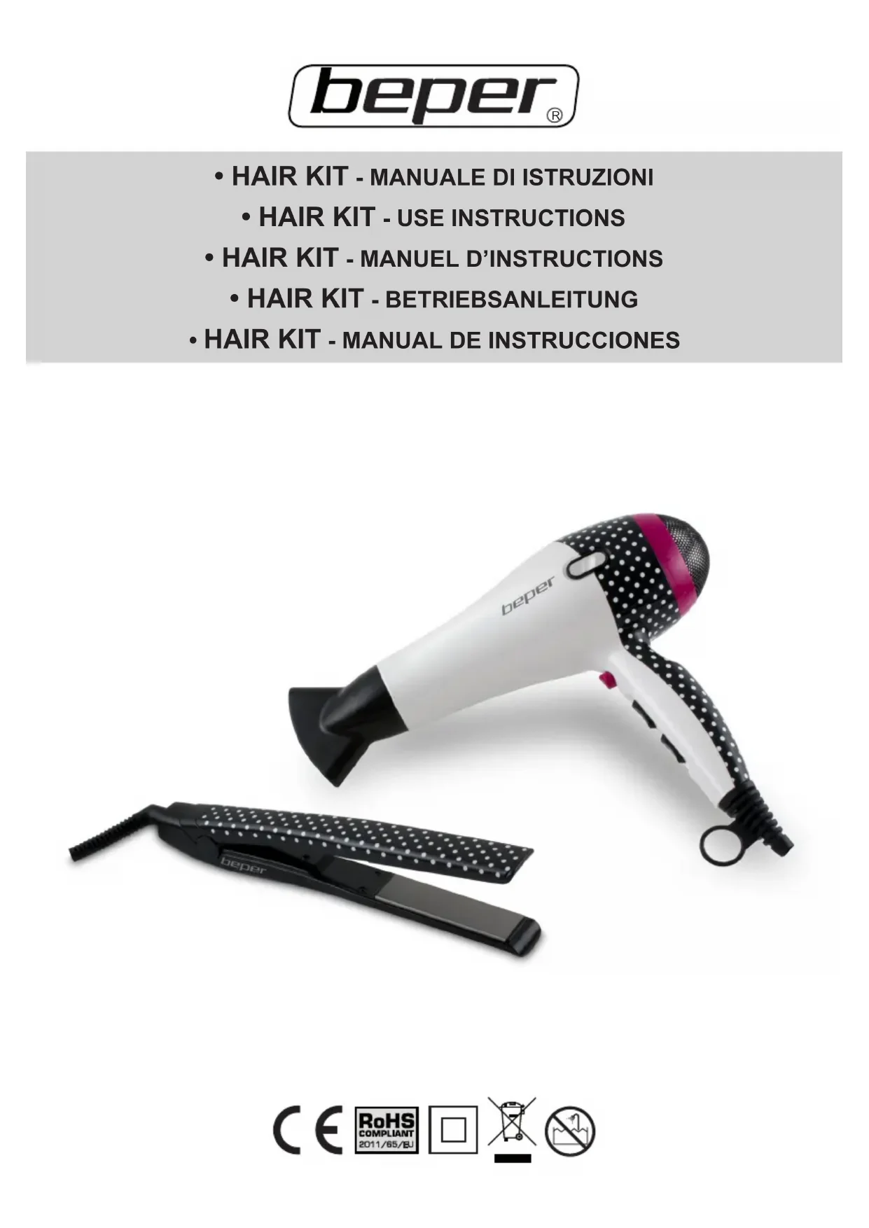 Puissance Lisseur Cheveux 25W Séchecheveux 2000 w Alimentation 220240V 50Hz Dans une optique d’amélioration constante Beper se réserve le droit de modier ou amélio- rer cet appareil sans préavis. TRAITEMENT DES DECHETS DES APPAREILS ELECTRIQUES ET ELECTRONIQUES Le produit en n de vie doit être détruit selon les normes en vigueur relatives à l’élimination des déchets et ne peut être traité comme simple déchet ménagé. Le produit doit être détruit dans un centre d’élimination des déchets adapté ou être restitué au re- vendeur dans le cas d’une substitution avec un autre produit équivalent neuf. Le fabricant prendra à sa charge les frais occasionnés pour la destruction du produit selon les ter- mes de la loi en vigeur. Le produit est composé de pièces non biodégradables et substances qui peuvent polluer l’environ- nement si détruites de façon inapropriée . Par ailleurs, certaines parties de ces matières peuvent être recyclées évitant ainsi toute pollution pour l’environnement. Il est de votre et notre devoir de préserver la santé de l’environnement. Le symbole indique que le produit répond aux normes requises par les nouvelles directives introduites en faveur de l’environnement (2011/65/EU) et que le produit doit être détruit de façon appropriée au terme du cycle de vie. Au besoin, informez-vous auprès des autorités locales compétentes en matière d’élimination des déchets de votre commune. Toute personne qui ne tiendra pas compte de ces règles d’élimination des déchets indiquées dans ce paragraphe en répondra selon la loi en vigueur.LE SERVICE APRÈSVENTE EST EFFECTUÉ PAR VOTRE REVENDEUR OU PAR L’IMPORTATEUR/DISTRIBUTEUR DES PRODUITS BEPER. ÉCRIVEZ UN EMAIL AU assistenza@beper.com POUR CONNAITRE LE CENTRE SERVICE AGRÉE BEPER LE PLUS PROCHE DE CHEZ VOUS.