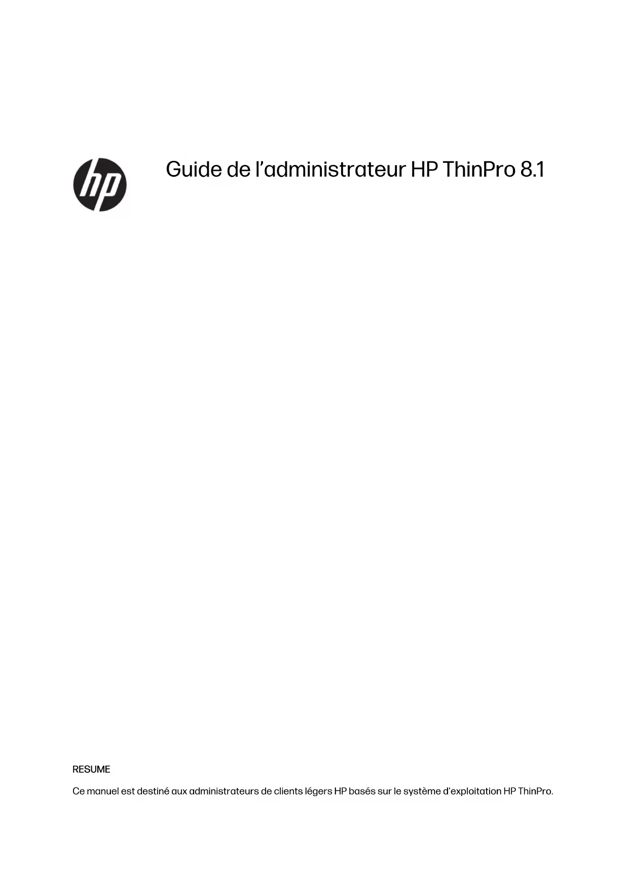 Guide de l’administrateur HP ThinPro 8.1 RESUME Ce manuel est destiné aux administrateurs de clients légers HP basés sur le système d'exploitation HP ThinPro.Informations légales © Copyright 2023 HP Development Company, L.P. AMD et ATI sont des marques commerciales d’Advanced Micro Devices, Inc. Citrix et XenDesktop sont des marques commerciales de Citrix Systems, Inc. et/ou une ou plusieurs de ses filiales ; elles peuvent être déposées auprès du Bureau des brevets et des marques aux États- Unis et dans d'autres pays. Linux est une marque commerciale déposée Linus Torvalds aux États-Unis et dans d'autres pays. Microsoft, Windows, Windows Vista et Windows Server sont des marques de commerce ou des marques déposées de Microsoft Corporation aux États-Unis et/ou dans d’autres pays. NVIDIA est une marque commerciale de NVIDIA Corporation aux États-Unis et dans d'autres pays. UNIX est une marque déposée de The Open Group. VMware, Horizon et View sont des marques commerciales déposées ou des marques commerciales de VMware, Inc. aux États- Unis et/ou dans d'autres juridictions. Logiciel informatique confidentiel. Licence HP valide requise pour possession, utilisation ou copie. Conformément aux clauses FAR 12.211 et 12.212, une licence est accordée au Gouvernement des États- Unis sous les termes de la licence commerciale standard du fournisseur pour le Logiciel informatique commercial, la Documentation du logiciel informatique et les Données techniques concernant les éléments commerciaux. Les informations contenues dans ce document peuvent être modifiées sans préavis. Les garanties relatives aux produits et aux services HP sont décrites dans les textes de garantie limitée expresse qui les accompagnent. Aucun élément du présent document ne peut être interprété comme constituant une garantie supplémentaire. HP ne saurait être tenu pour responsable des erreurs ou omissions de nature technique ou rédactionnelle qui pourraient subsister dans le présent document. Deuxième édition : octobre 2023 Première édition : août 2022 Numéro de référence du document : N81161-051 Logiciels Open Source Ce produit inclut des logiciels sous licence Open Source, notamment la Licence Publique Générale GNU et la Licence Publique Générale GNU Limitée ou d'autres licences Open Source. Si HP en a l'obligation ou, à sa seule discrétion, choisit de rendre le code source disponible dans le cadre de la licence logicielle Open Source applicable, le code source du logiciel peut être obtenu à partir de l'emplacement suivant : https://ftp.hp.com/pub/tcdebian/pool/ThinPro8.1/open-sources.html .Clé de syntaxe du langage d'entrée utilisateur Le texte que vous devez entrer dans une interface utilisateur est indiqué par Police à espacement fixe. Clé de syntaxe du langage d'entrée utilisateur Élément Description Texte sans crochets ni accolades Éléments que vous devez saisir exactement comme illustré <Texte entre chevrons> Un espace réservé pour une valeur que vous devez fournir ; Omettre les crochets [Texte entre crochets] Éléments en option ; Omettre les crochets {Texte entre accolades} Un ensemble d’éléments parmi lesquels vous devez en choisir un seul ; Omettre les accolades