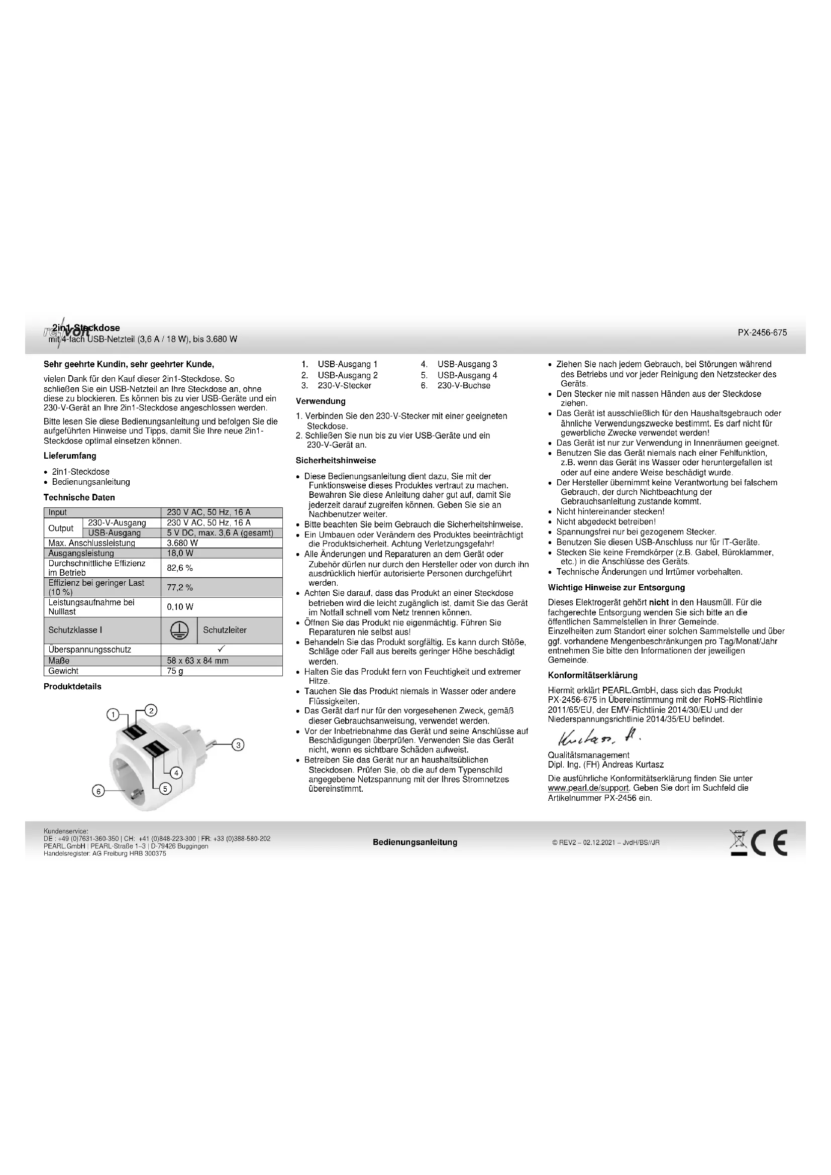 6Adaptateur mural 2 en 1 avec 4 prises USB 3,6 A/18 W/3680 W Mode d'emploi PEARL.GmbH | PEARL-Straße 1–3 | D-79426 Buggingen Service commercial PEARL France : 0033 ( 0 ) 3 88 58 02 02 © REV2 – 02.12.2021 – JvdH/BS//JR PX-2456-675 Chère cliente, cher client, Nous vous remercions d'avoir choisi cet adaptateur mural 2 en 1. Afin d'utiliser au mieux votre nouveau produit, veuillez lire attentivement ce mode d'emploi et respecter les consignes et astuces suivantes. Contenu Prise murale 2 en 1 Mode d'emploi Caractéristiques techniques Entrée 230 V AC / 50 Hz / 16 A Sortie Sortie 230 V 230 V AC / 50 Hz / 16 A Sortie USB 5 V DC, max. 3,6 A (total) Puissance d'alimentation max. 3680 W Puissance de sortie 18,0 W Efficacité moyenne en fonctionnement 82,6 % Efficacité à faible charge (10 %) 77,2 % Puissance absorbée à charge nulle 0,10 W Classe de protection I