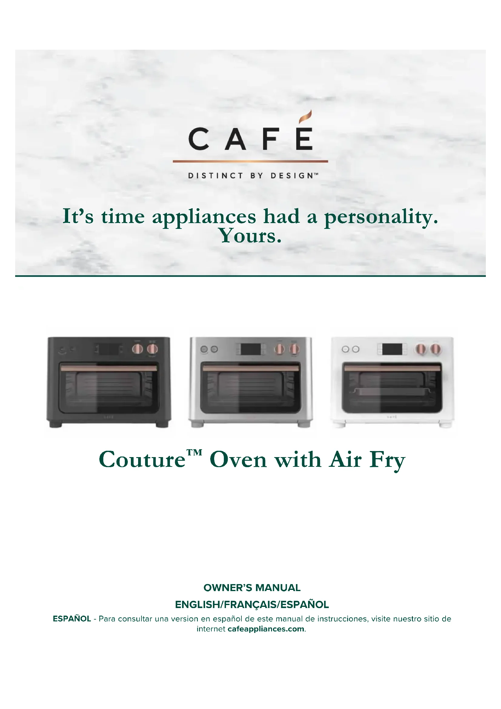 Les personnes ayant les compétences requises pour réparer elles-mêmes leurs appareils peuvent recevoir directement à la maison des pièces ou des accessoires (les cartes VISA, MasterCard et Discover sont acceptées) Commandez en ligne 24 heures par jour en tout temps. cafeappliances.com/parts Au Canada: geappliances.ca/parts-filters-accessories Les instructions contenues dans le présent manuel comportent des procédures que tout utilisateur peut HIIHFWXHU/HVDXWUHVW\SHVGHUpSDUDWLRQGRLYHQWJpQpUDOHPHQWrWUHFRQILpVjXQWHFKQLFLHQTXDOLILp8VH]GH prudence : une réparation ou un entretien mal effectués peuvent rendre l’utilisation de l’appareil dangereuse.Es hora de que los electrodomésticos tengan su personalidad. La Suya. Horno Couture™ con Freidora de Aire