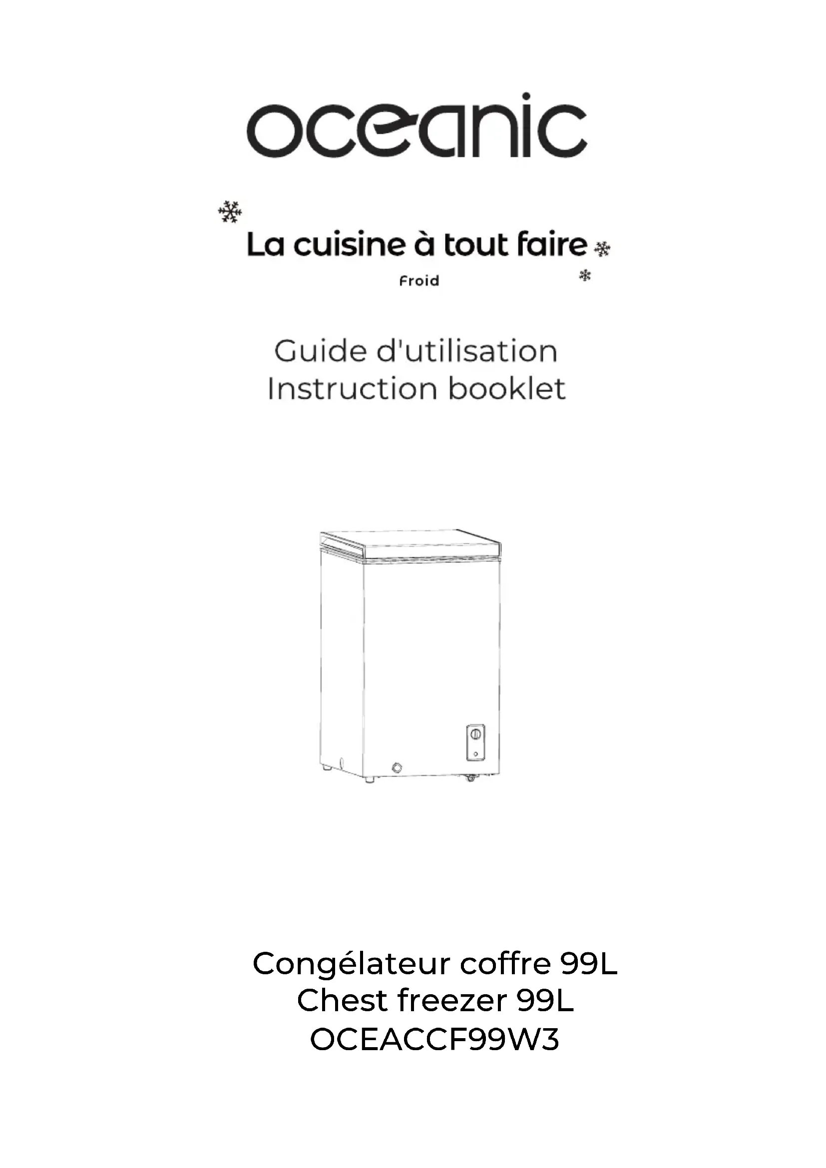 CCongélateur coffre 99L Chest freezer 99L OCEACCF99W3Contenu Content Congélateur coffre Sac plastique avec étiquette énergétique et mode d'emploi Raclette de dégivrage Corbeille Chest freezer Plastic bag with energy label and user manual Freezer ice scraper Basket