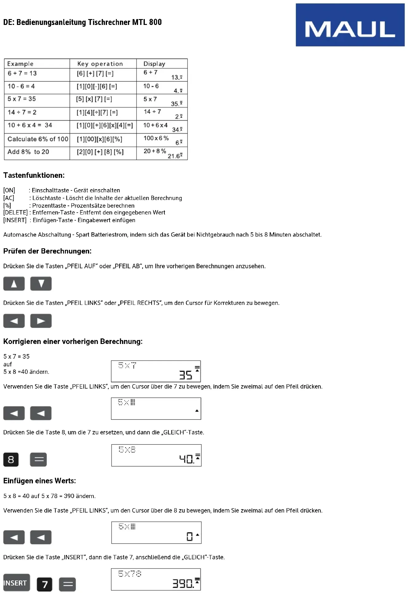 MTL 800 - Calculatrice MAUL - Notice d'utilisation et mode d'emploi gratuit