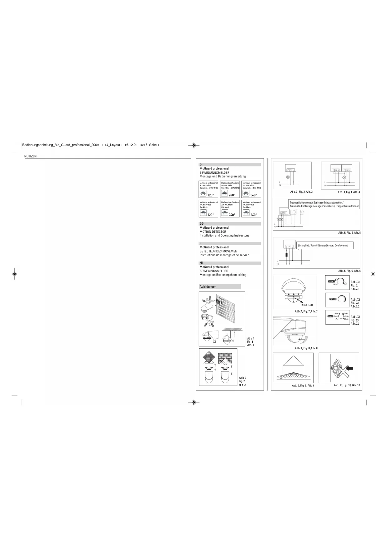 iable. Installation / Montage / Raccordement - La hauteur de montage est de 2,5m. (hauteur minimale 1,80m). - Les détecteurs McGuard professional peuvent être montés au mur ou au pla- fond sans accessoires supplémentaires. Pour le montage au plafond, les deux parties du détecteur doivent être tournées de 180° l’une par rapport à l’autre ( Fig. 1