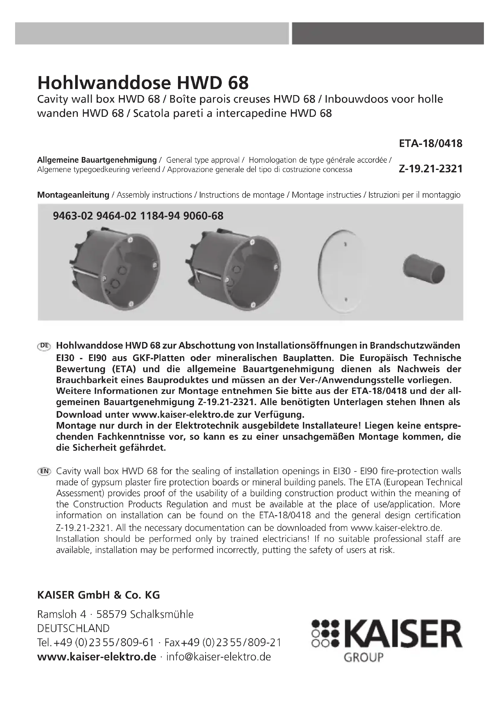 Boîte parois creuses HWD 68 pour le cloisonnement d’orifices d’installation dans des parois pare-feu EI30 – EI90 construites en plaques placoplâtre ou plaques minérales. L‘Agrément Technique Européen (ETA) référence l’aptitude à l’emploi d’un produit au sens de la Directive Communautaire sur les Produits de la Construction et doit être disponible à l’endroit d’utilisation. Pour plus d’informations sur le montage, veuillez-vous reporter à ETA-18/0418 et à l’homologation de type générale Z-19.21- 2321. Tous les documents requis peuvent être téléchargés sur www.kaiser-elektro.de. Seuls des installateurs ayant suivi une formation d’électrotechnicien sont autorisés à effectuer le montage! Si le montage est effectué par un collaborateur ne disposant pas des connaissances spécifiques, l’installation risque d’être non conforme et d’entraîner des risques pour la sécurité de l’utilisateur. Hollewanddoos HWD 68 voor de afscherming van installatieopeningen in brandwerende wanden EI30 - EI90 van GKF-platen (gipskarton) of minerale bouwplaten. De Europese Technische Goedkeuring (ETA) is een bewijs van de geschiktheid van een bouwmateriaal volgens de bouwmaterialenrichtlijn