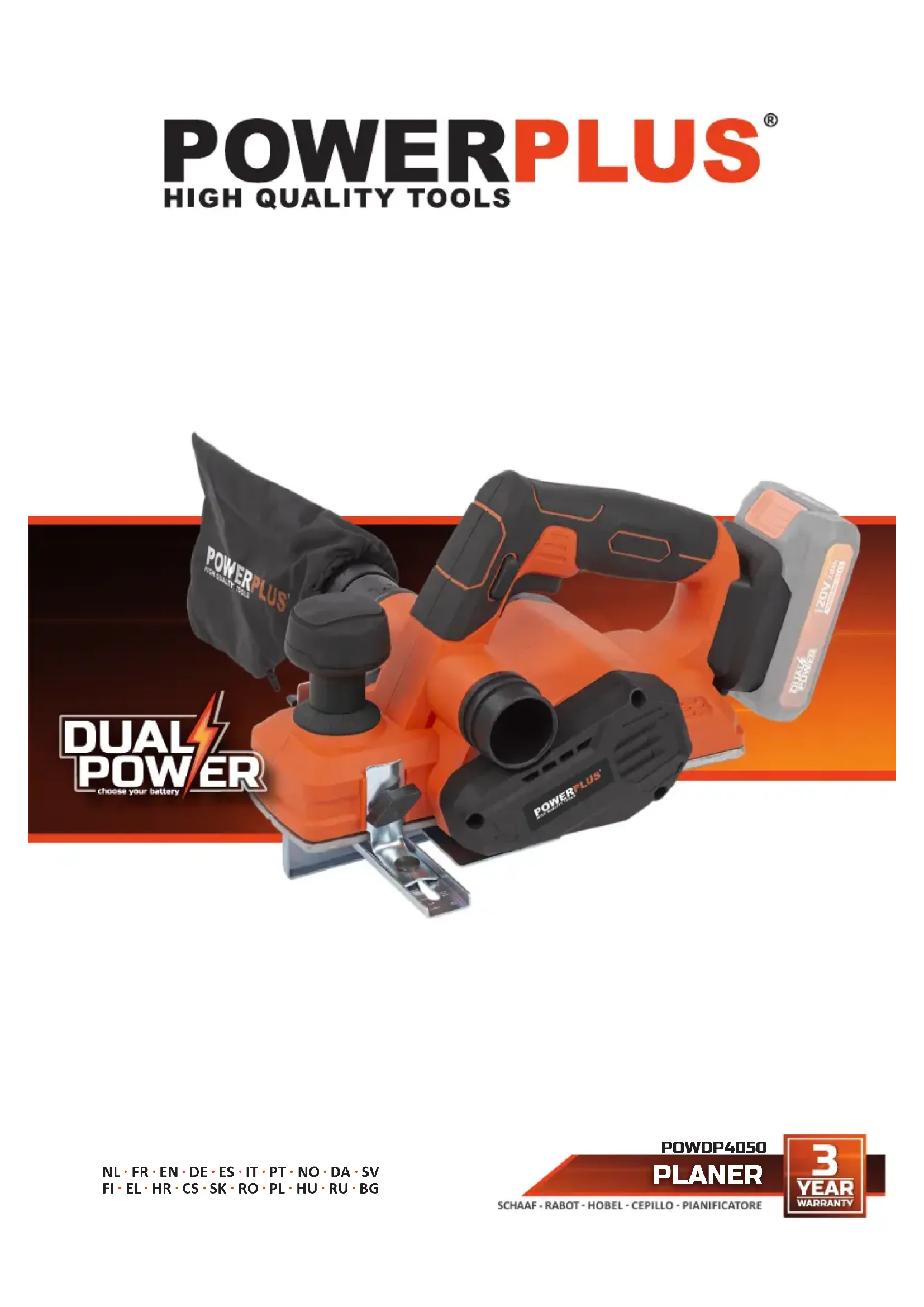 NL · FR · EN · DE · ES · IT · PT · NO · DA · SV FI · EL · HR · CS · SK · RO · PL · HU · RU · BG POWDP4050 PLANER SCHAAF - RABOT - HOBEL - CEPILLO - PIANIFICATORENL NEDERLANDS VERTAALDE VERSIE VAN DE ORIGINELE HANDLEIDING FR FRANÇAIS TRADUCTION DU MODE D’EMPLOI D’ORIGINE