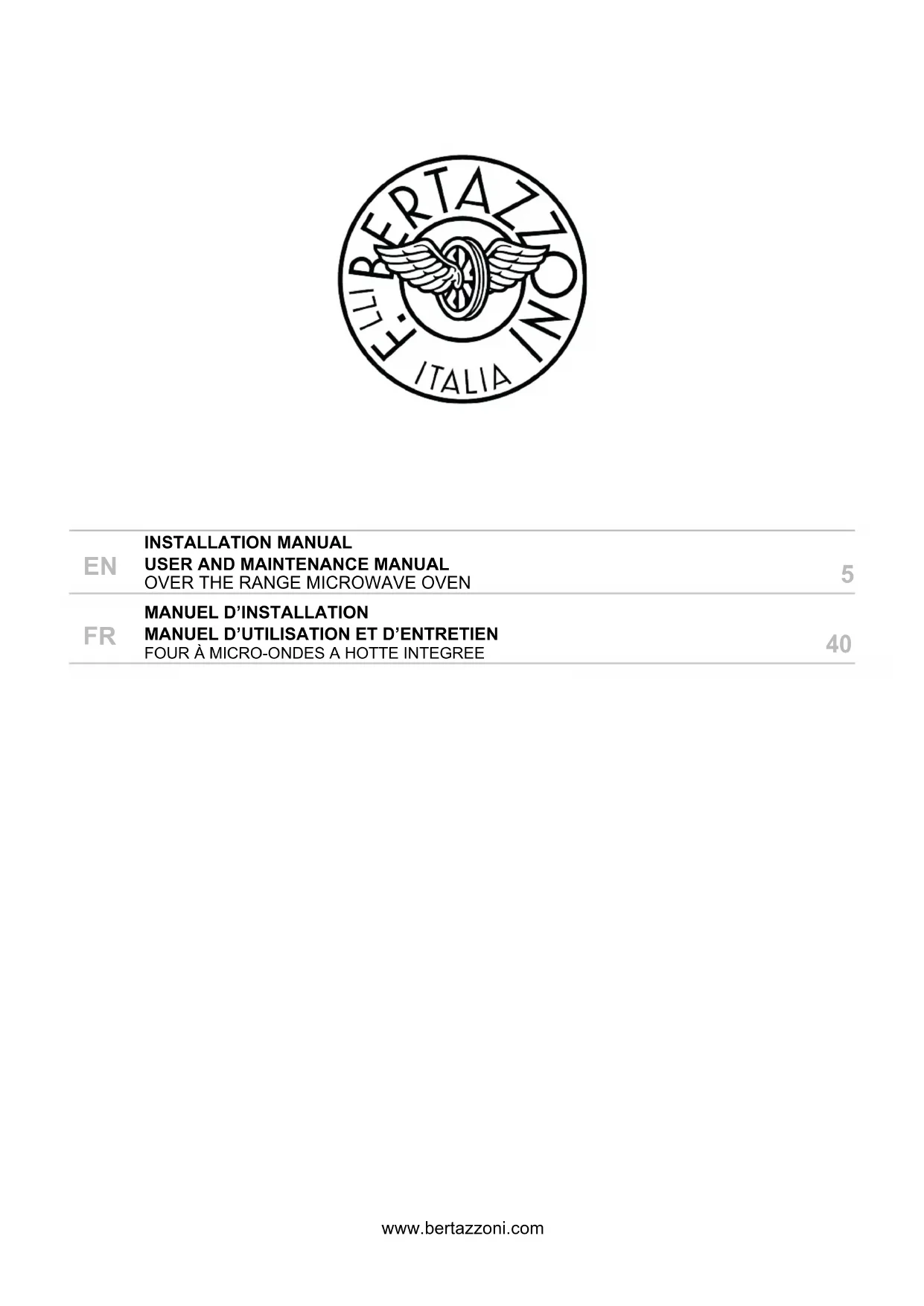 - La procédure d’essai CEI est appliquée pour mesurer la puissance de sortie. ** Il s’agit de la classification des équipements ISM (industriels, scientifiques et médicaux) décrite dans les normes internationales CISPR11 et 14-2. *** La capacité interne est calculée en mesurant la largeur, la profondeur et la hauteur maximales. La quantité réelle d’aliment pouvant être contenue dans le four est inférieure. Dans le respect des normes fixées et autorisées par : FCC - Federal Communications Commission (États-Unis) . DHHS - Conforme à la règle du ministère de la Santé et des Services sociaux (DHHS), CFR, titre 21, chapitre I, sous-chapitre J. - Ce symbole sur la plaque signalétique signifie que le produit est répertorié par Underwriters Laboratories, Inc. pour une utilisation aux États- Unis ou au Canada.DÉCLARATION DE GARANTIE LIMITÉE DE DEUX ANS CE QUE COUVRE CETTE GARANTIE LIMITÉE La couverture de la garantie fournie par Bertazzoni SpA (“Bertazzoni”) dans la présente déclaration s’applique exclusivement à l’appareil Bertazzoni d’origine (“Produit”) vendu au consommateur (“Acheteur”) par un revendeur/ distributeur/détaillant agréé Bertazzoni , installé aux Etats- Unis, District de Columbia, ou au Canada, qui est toujours resté dans le pays d’achat initial (Etats-Unis, District de Columbia, ou Canada). La couverture de la garantie est activée à la date d’ achat d’ origine du Produit et a une durée de deux (2) ans. La couverture de garantie n’est pas transférable. En cas de remplacement de pièces ou de remplacement de l’ensemble du produit, le produit de remplacement (ou les pièces) assumera la garantie d’origine restante activée avec le document d’achat d’origine. Cette garantie ne sera pas prolongée à la suite d’un tel remplacement. Bertazzoni SpA réparera ou remplacera toute pièce qui tombe en panne ou s’avère défectueuse en raison des matériaux et/ou de la fabrication dans les 2 ans suivant la date d’achat d’origine, et dans des conditions d’utilisation résidentielle normale et non commerciale. La réparation ou le remplacement sera gratuit, y compris la main-d’œuvre aux tarifs standard et les frais d’expédition. L’Acheteur est tenu de rendre le Produit raisonnablement accessible pour la réparation. L’intervention de réparation doit être effectuée par une entreprise de services agréée Bertazzoni pendant les heures normales de travail. La main-d’œuvre effectuée à des taux d’heures supplémentaires ou majorés ne sera pas couverte par la garantie. REMARQUE IMPORTANTE Conserver la preuve d’achat d’origine pour établir la période de garantie. La responsabilité de Bertazzoni sur toute réclamation de quelque nature que ce soit, en ce qui concerne les biens et/ ou services fournis, ne peut en aucun cas excéder la valeur des biens ou services ou partie de ceux-ci qui donnent naissance à la réclamation. Garantie pour dommages de nature esthétique de 30 jours L’inspection du produit doit être effectuée par l’Acheteur au moment de la livraison. Bertazzoni garantit que le Produit est exempt de vices de fabrication au niveau des matériaux et de la fabrication pendant une période de trente (30) jours à compter de la date d’achat d’origine du Produit. Cette couverture comprend :