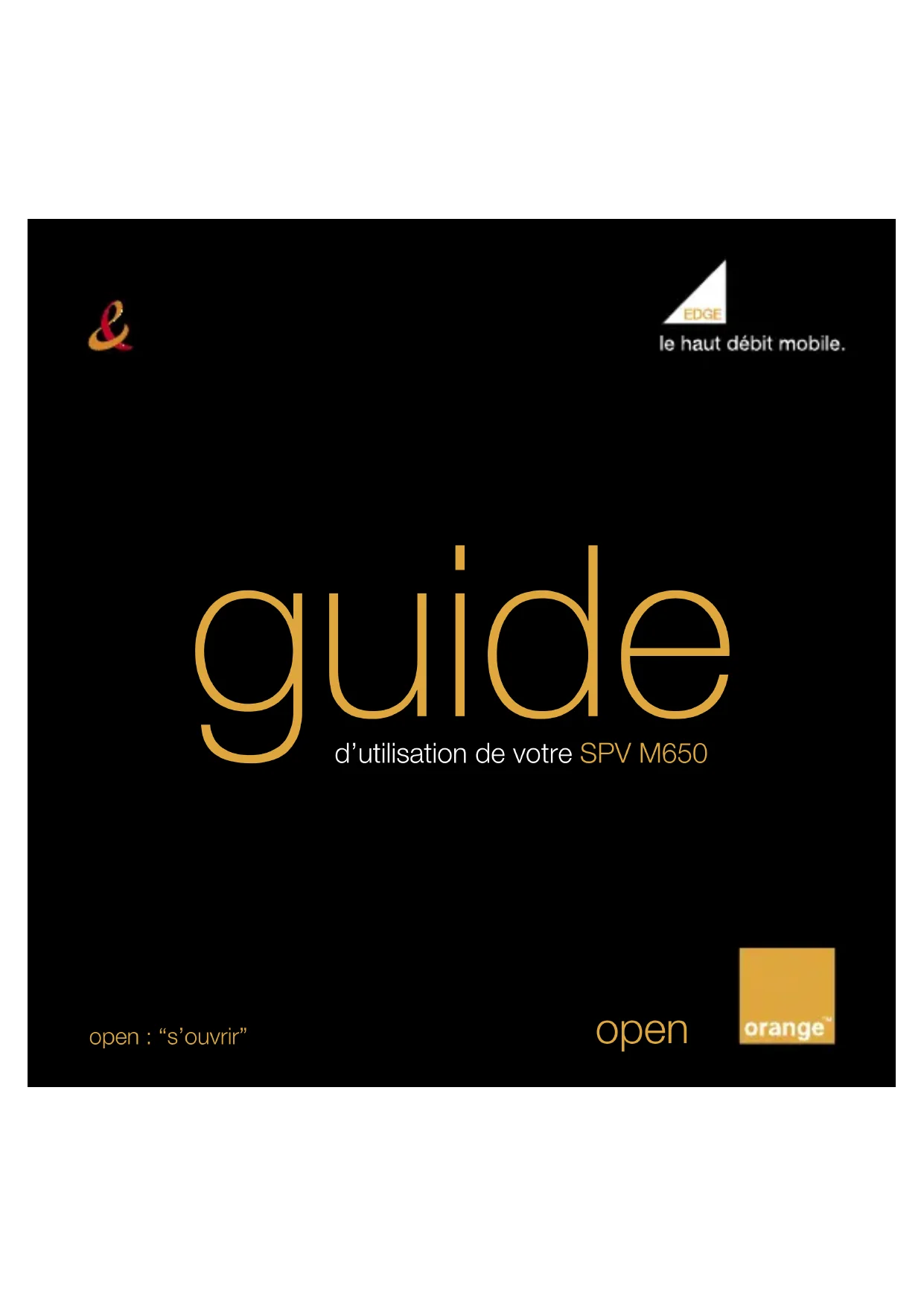 guide open open : “s’ouvrir” d’utilisation de votre SPV M650Ce guide Orange vous permettra de connaître rapidement votre SPV M650. Vous avez choisi un coffret Orange EDGE, nous vous en remercions. Orange a sélectionné pour vous le SPV M650 et vous fait bénéficier d’une large gamme d’options pour vous faciliter son utilisation :