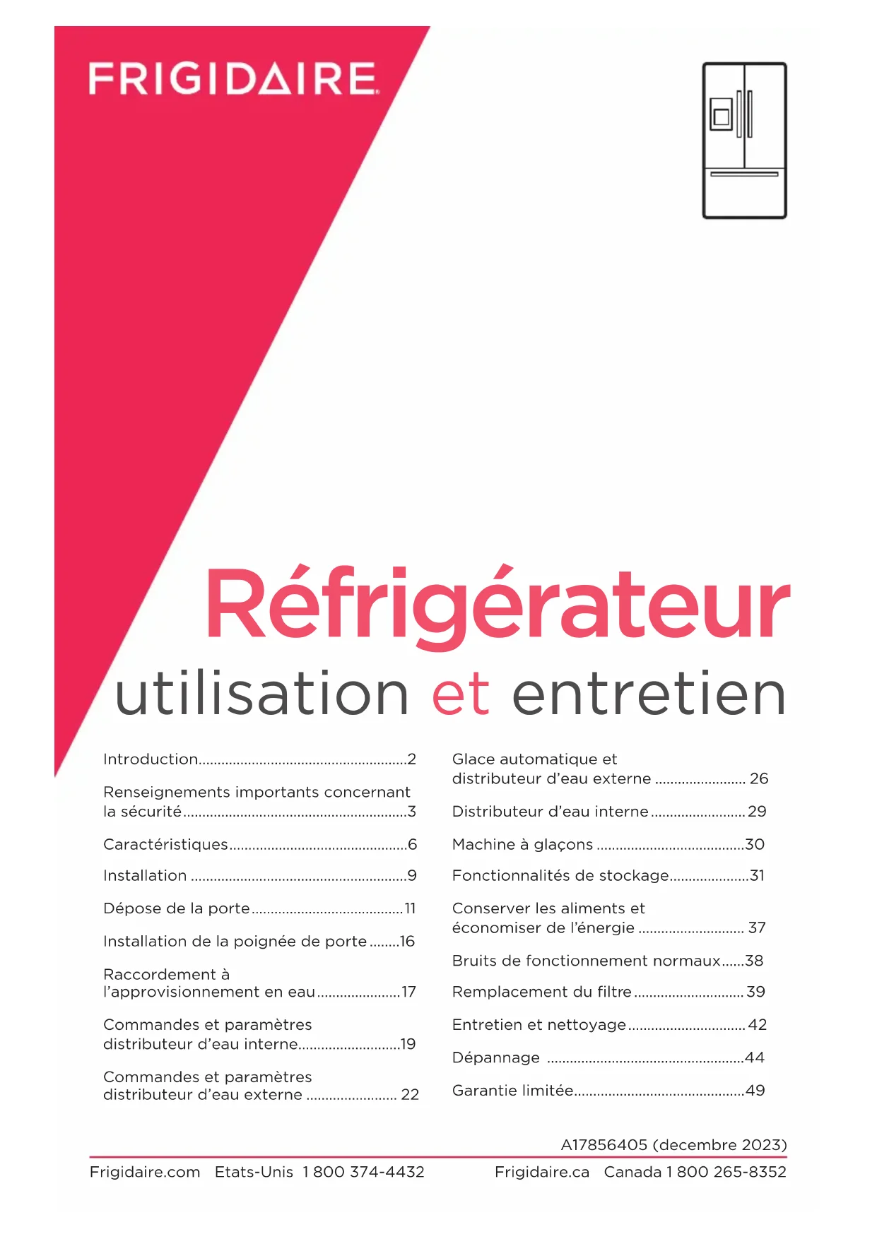 - Frigidaire.com Etats-Unis 1 800 374-4432 Frigidaire.ca Canada 1 800 265-8352 Réfrigérateur utilisation et entretien A17856405 (decembre 2023) Introduction p. 2