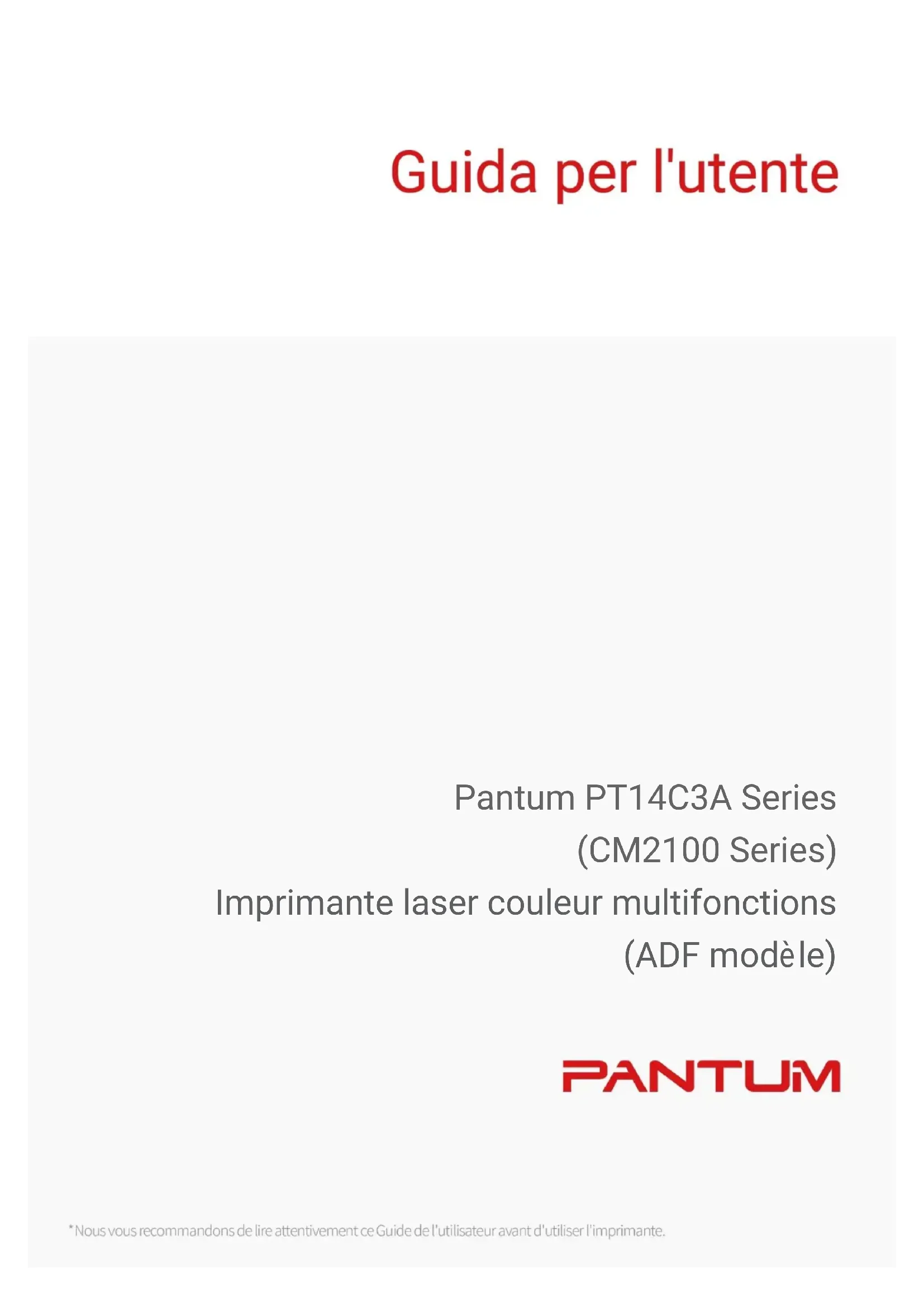 Pantum PT14C3A Series (CM2100 Series) Imprimante laser couleur multifonctions (ADF modèle)I Pré face Bienvenue parmi les produits Pantum Series! Nous vous remercions d'avoir choisi nos produits Pantum Series! Afin de protéger vos intérêts, veuillez lire attentivement les articles suivants: Pour plus d'informations, veuillez consulter notre site officiel (www.pantum.com). Avis juridique Marque commerciale Pantum et les logos Pantum sont des marques déposéesde Zhuhai Pantum Electronics Co., Ltd. Microsoft