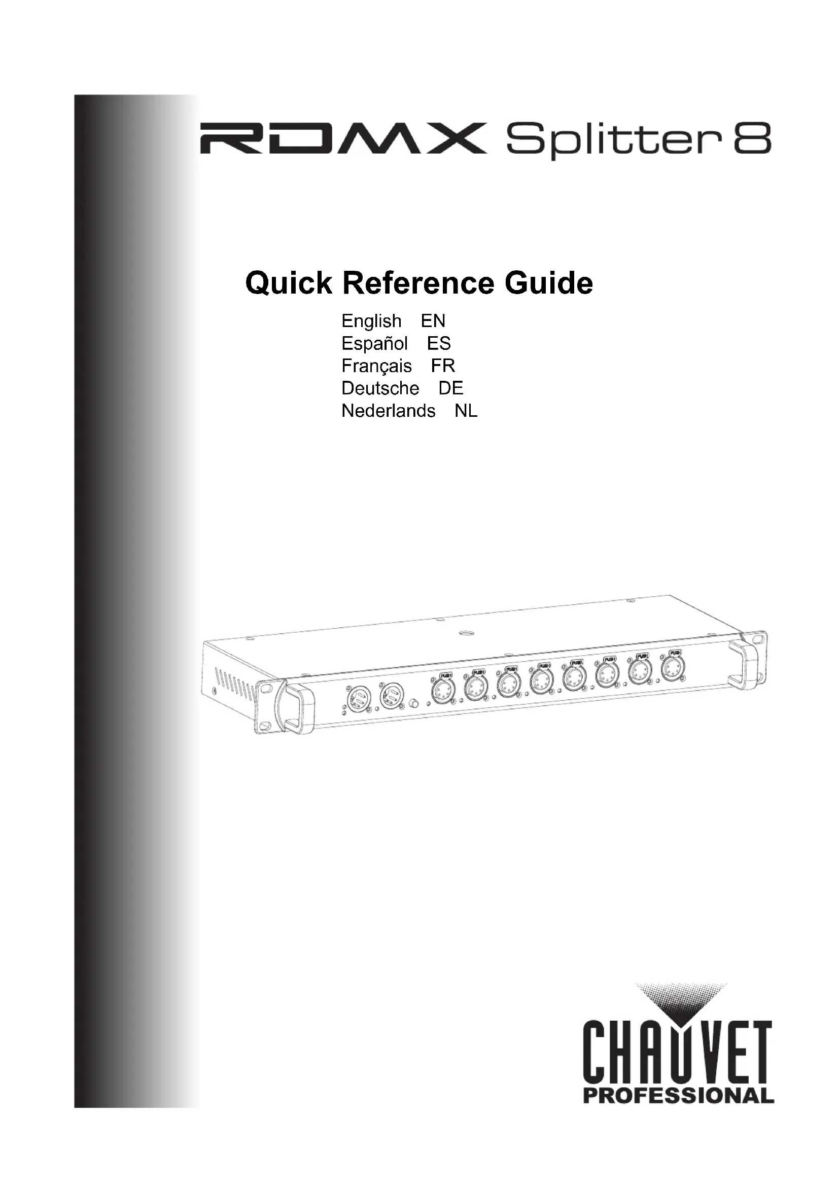 RDMX Splitter 8 QRG Rev. 2 À Propos de ce Manuel Le Manuel de Référence du RDMX Splitter 8 (MR) reprend des informations de base sur cet appareil notamment en matière de connexions, montage, options de menu et valeurs DMX. Télécharger le Manuel d'Utilisation sur www.chauvetprofessional.com pour de plus amples informations. Clause de Non-Responsabilité Les informations et caractéristiques contenues dans ce manuel sont sujettes à changement sans préavis.