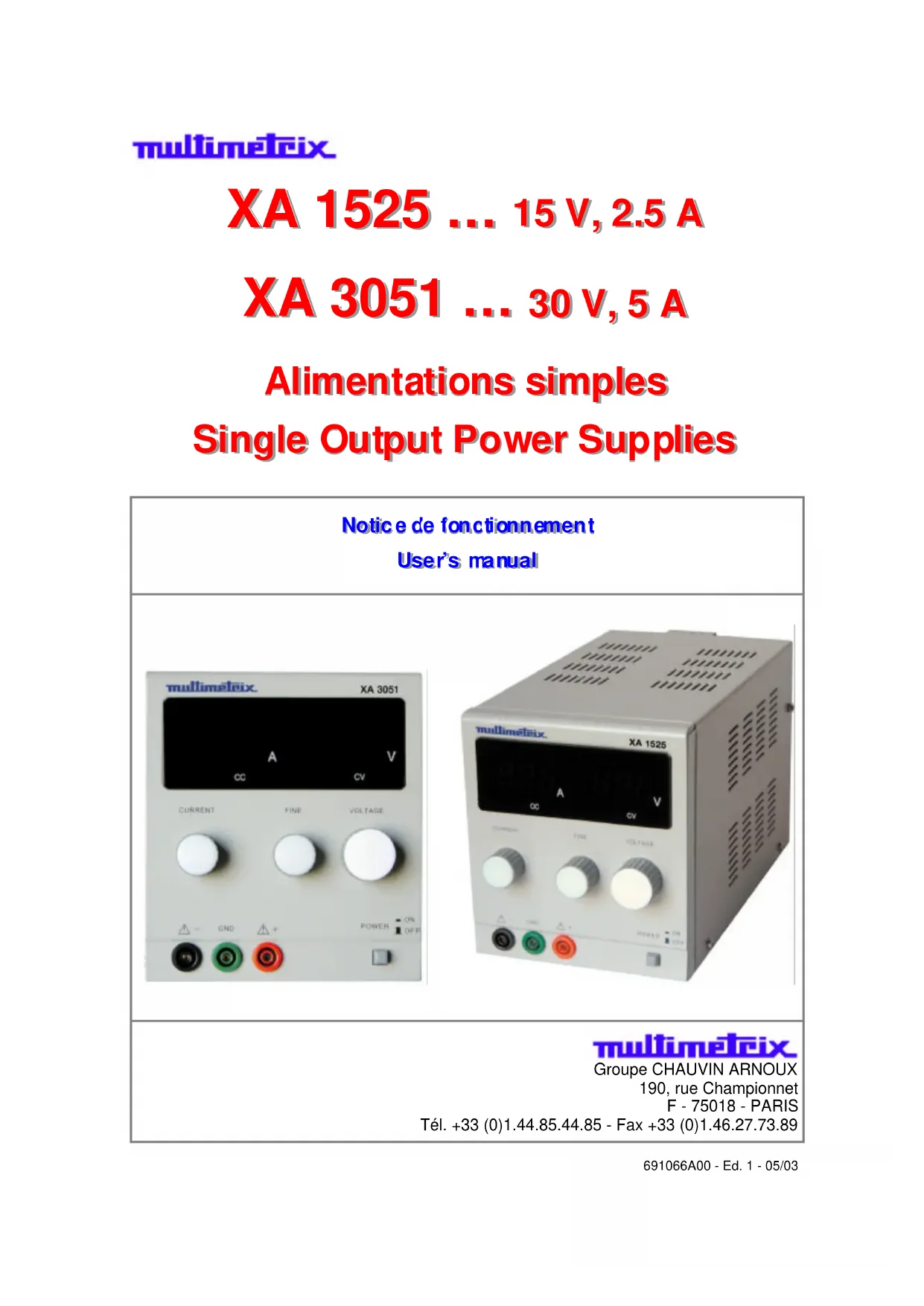 Tél. +33 (0)1.44.85.44.85 - Fax +33 (0)1.46.27.73.89 691066A00 - Ed. 1 - 05/03Français 2 Alimentations simples Instructions générales Introduction Vous venez d'acquérir une alimentation stabilisée de la gamme MULTIMETRIX ; nous vous remercions de votre confiance. Cet instrument est conforme à la norme de sécurité NF EN 61010-1 (2001), isolation simple, relative aux instruments de mesures électroniques. Pour en obtenir le meilleur service, lisez attentivement cette notice et respectez les précautions d’emploi. Le non-respect des avertissements et/ou des instructions d’utilisation peut endommager l’appareil et/ou ses composants et se révéler dangereux pour l’utilisateur. Sécurité Cette alimentation respecte la norme de sécurité EN 61010-1, classe 1, degré de pollution 2. Elle a été conçue pour une utilisation en intérieur, en altitude inférieure à 2000 m, à une température comprise entre 0°C et 50°C avec une humidité relative < 80 % jusqu’à 40°C. XA 1525 XA 3051 Sorties alimentation Catégorie de surtension Tension maximale de sortie CAT II - 15 VDC CAT II - 30 VDC Alimentation secteur Catégorie de surtension Tension d’alimentation Consommation