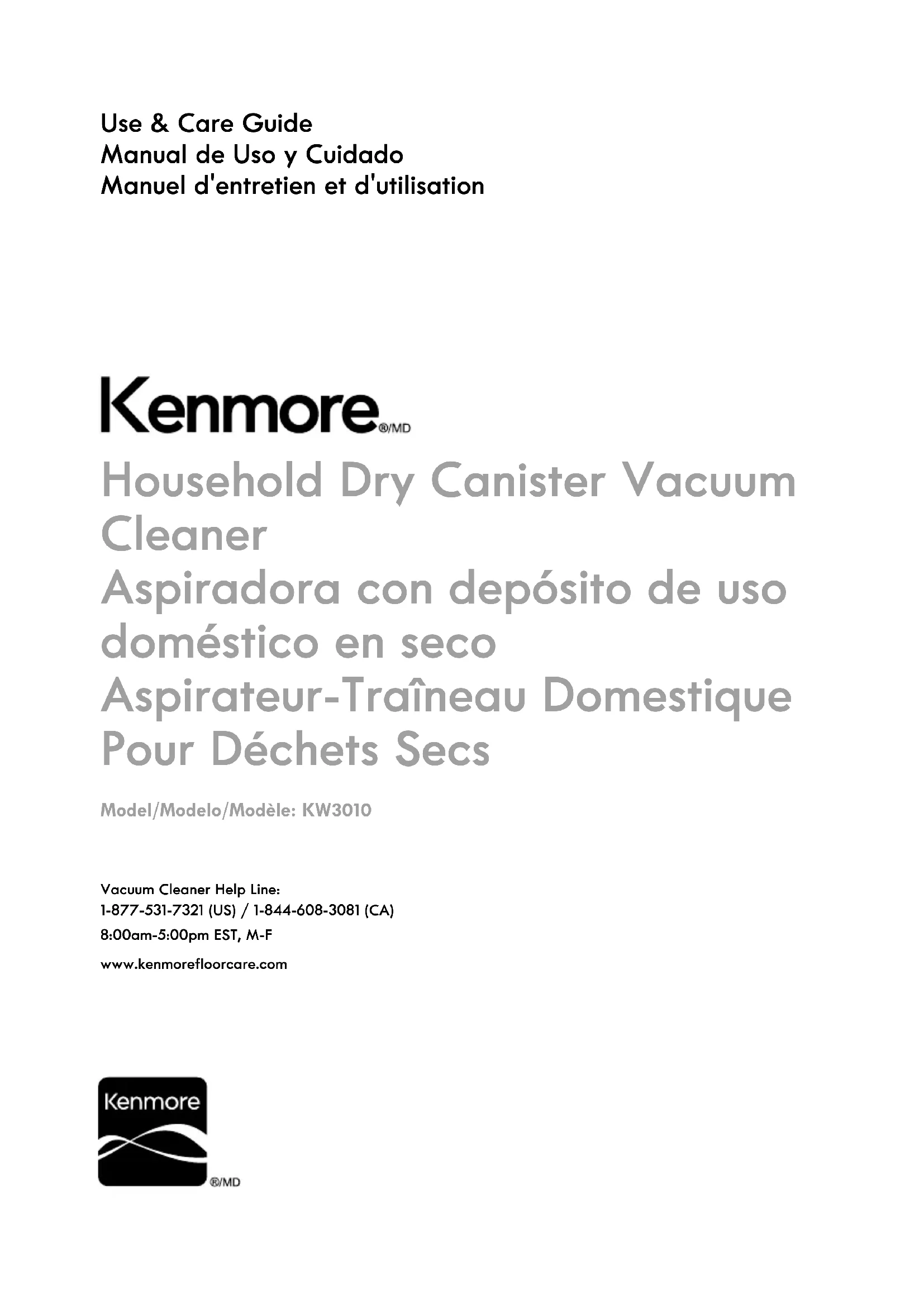 Votre ASPIRATEUR KENMORE est emballé avec les pièces et composants suivants montés séparément dans le carton: 1 Ensemble Aspirateur 1 Tuyau 2 Tubes de rallonge 1 Pré-filtre 3 Sacs À Poussière 1 Suceur Pour Planchers Multi-surfaces 1 Suceur Plat 1 Brosse À Épousseter Ronde 1 Guide D'entretien Et D'utilisation Veuillez lire le présent Guide d'utilisation et d'entretien. Il vous sera utile pour monter et utiliser votre nouvel aspirateur Kenmore en toute sécurité et de la façon la plus efficace possible. Pour de plus amples informations sur l'entretien et l'utilisation de l’aspirateur, veuillez appelez la ligne d'assistance sur les aspirateurs en composant le numéro : 1-877-531-7321 (États- Unis) / 1-844-608-3081 (Canada). Lorsque vous demandez des renseignements, vous devez disposer des numéros de modèle et de série complets du produit. Les numéros de modèle et de série de votre aspirateur figurent sur la plaque signalétique apposée sur le produit. Notez le numéro de modèle et le numéro de série de votre nouvel aspirateur Kenmore dans l’espace ci-dessous. Modèle N°____________________________________________ N° de série ____________________________________________ Date d’achat ______________________________________ Veuillez conserver en lieu sûr le présent manuel ainsi que votre ticket de caisse (reçu) afin de pouvoir vous y référer ultérieurement.