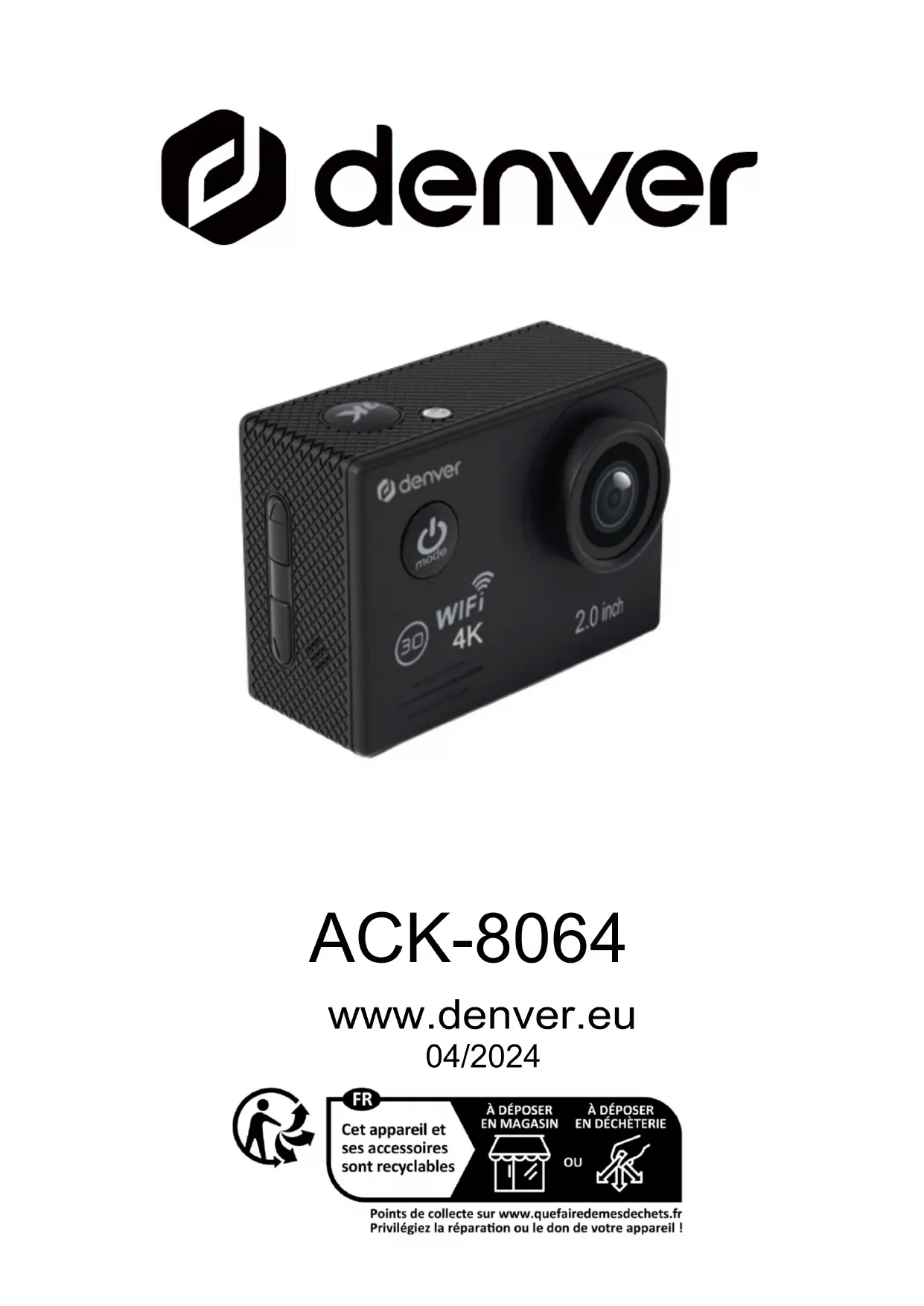 Photo en rafale 3P/S, 5P/S, 10P/S ÉTEINT Enregistrement en boucle OFF/2min/3min/5min Mémoire Micro SD Maximum 64GB Fonction WIFI Soutien USB USB2.0 Batterie 1050mAh10 ENG Remarque - Tous les produits sont susceptibles d'être modifiés sans préavis. Nous prenons des réserves pour les erreurs et les omissions dans le manuel. TOUS DROITS RÉSERVÉS, COPYRIGHT DENVER A/S Les équipements électriques et électroniques et les piles incluses contiennent des matériaux, des composants et des substances qui peuvent être dangereux pour la santé et l'environnement si les déchets (équipements électriques et électroniques et piles mis au rebut) ne sont pas traités correctement. Les équipements électriques et électroniques et les piles sont marqués par le symbole de la poubelle barrée, visible ci-dessus. Ce symbole signifie que les équipements électriques et électroniques et les piles ne doivent pas être jetés avec les autres déchets ménagers, mais doivent être éliminés séparément. En tant qu'utilisateur final, il est important que vous remettiez vos piles usagées à l'installation appropriée et désignée. Vous vous assurez ainsi que les piles sont recyclées conformément à la législation et11 ENG qu'elles ne nuisent pas à l'environnement.12 ENG Toutes les villes ont mis en place des points de collecte, où les équipements électriques et électroniques et les piles peuvent être déposés gratuitement dans les stations de recyclage et autres sites de collecte, ou être collectés auprès des ménages. Des informations supplémentaires sont disponibles auprès du service technique de votre ville. Par la présente, D e n v e r A/S déclare que l'équipement radio de type ACK-8064 est conforme à la directive 2014/53/UE. Le texte intégral de la déclaration de conformité de l'UE est disponible à l'adresse internet suivante : w ww . d e n v e r . e u et cliquez ensuite sur le bouton rechercher ICON sur la page d'accueil du site web. Inscrivez le numéro de modèle : ACK-8064 . Entrez maintenant dans la page du produit, et la directive ROUGE se trouve sous téléchargements/autres téléchargements. Gamme de fréquences de fonctionnement : 2,412-2,472 GHz Puissance de sortie maximale : 16dbm