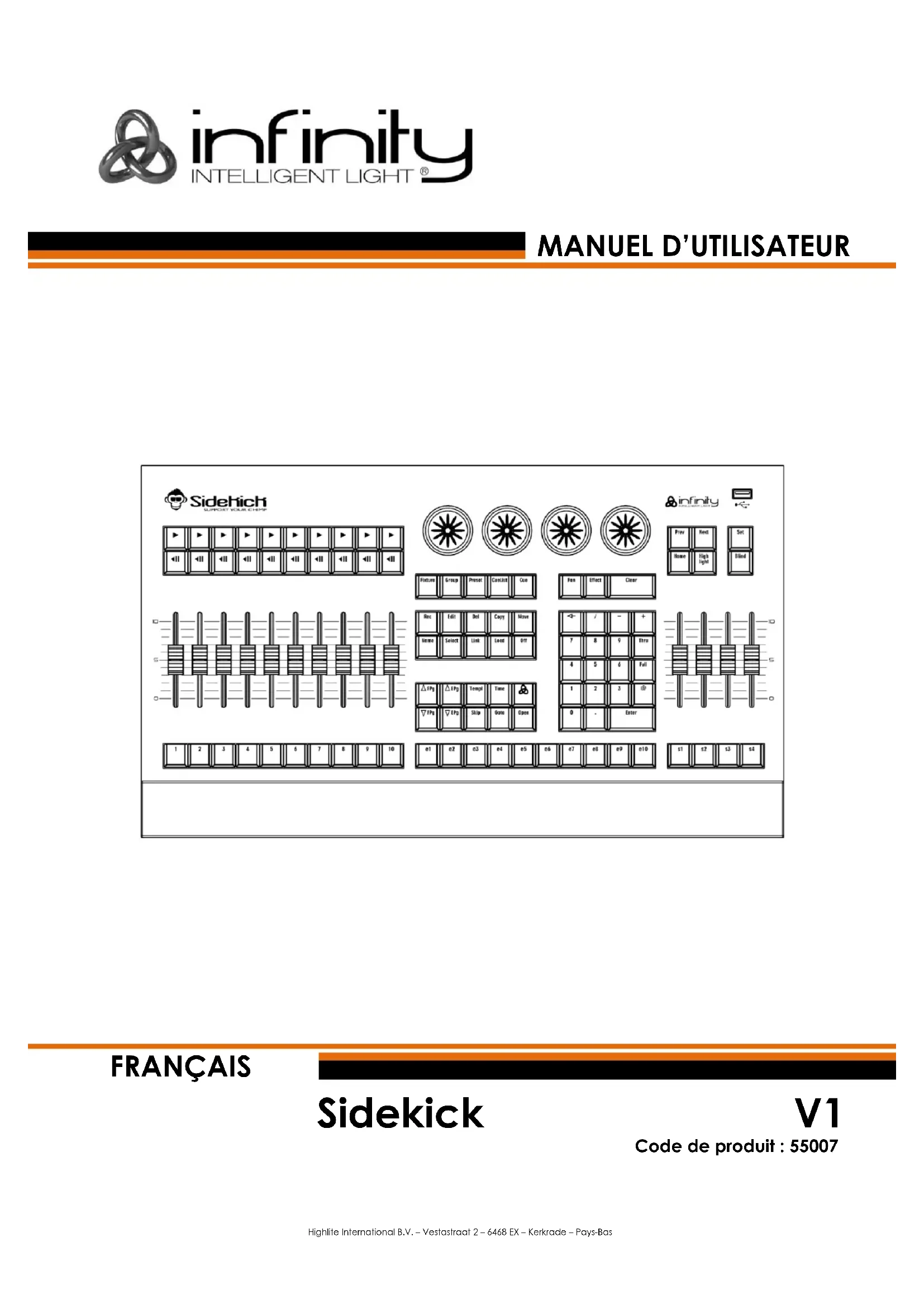Important Lisez et suivez les instructions de ce manuel d’utilisateur avant d’installer, d’utiliser ou de réparer ce produit. Le fabricant ne sera en aucun cas tenu responsable des dommages causés par le non-respect de ce manuel. Après le déballage, vérifiez le contenu de la boîte. Si des pièces sont manquantes ou endommagées, contactez votre revendeur Highlite International. Le contenu expédié comprend : ● Infinity Sidekick ● Manuel d’utilisateur