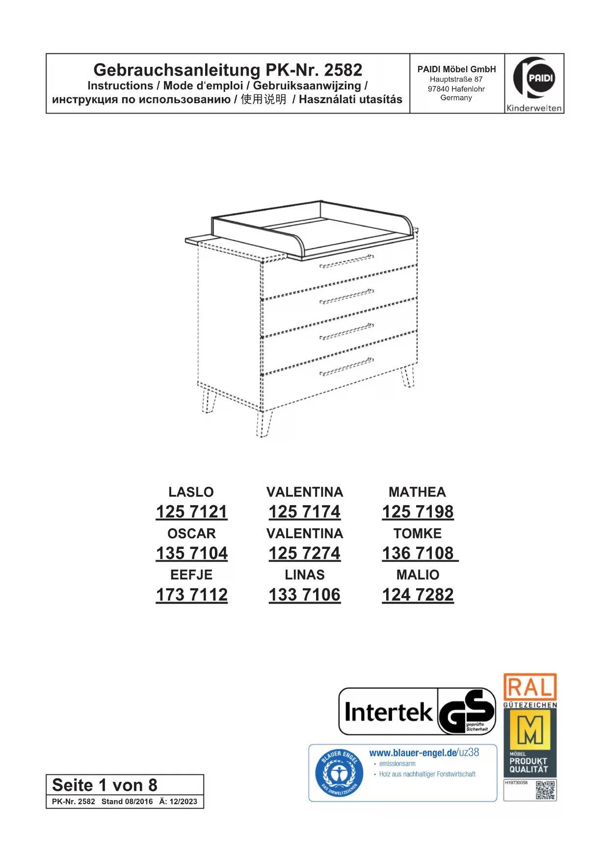 ATTENTION ! Ne laissez pas votre enfant couché sur la planche à langer sans surveillance quand vous le langez !Ne placez pas la commode à langer à proximité directe de fortes sources de chaleur. Attention aux risques émanant de fortes sources de chaleur comme des radiateurs électriques, fours à gaz etc. se trouvant à proximité directe de la commode à langer. N’utilisez pas de matelas à langer de plus de 3 cm d’épaisseur. La largeur et la profondeur maximales du matelas à langer sont les suivantes : 846 x 684 mm.AVERTISSEMENT ! Ne laissez pas votre enfants sans surveillance ! AVERTISSEMENT ! N’utilisez plus la commode à langer s’il manque des pièces ou si des pièces individuelles sont cassées, déchirées ou endommagées. Utilisez uniquement des pièces détachées recommandées par le fabricant. ATTENTION ! Pour la sécurité de votre enfant, il est très important que tous les raccords à vis soient bien serrés. Vériez régulièrement les raccords. Si des raccords sont desserrés, resserrez-les pour éviter que votre enfant ne se blesse, reste coincé ou accroché. ATTENTION ! Conservez les instructions de montage ci-jointes pour un usage futur et des questions ultérieures. ATTENTION ! Ne pas soulever la commode en la tenant par la planche à langer. Indication sur l’entretien: Pour nettoyer les surfaces, utiliser un chion légèrement humide ou un nettoyant pour meubles en vente dans le commerce.