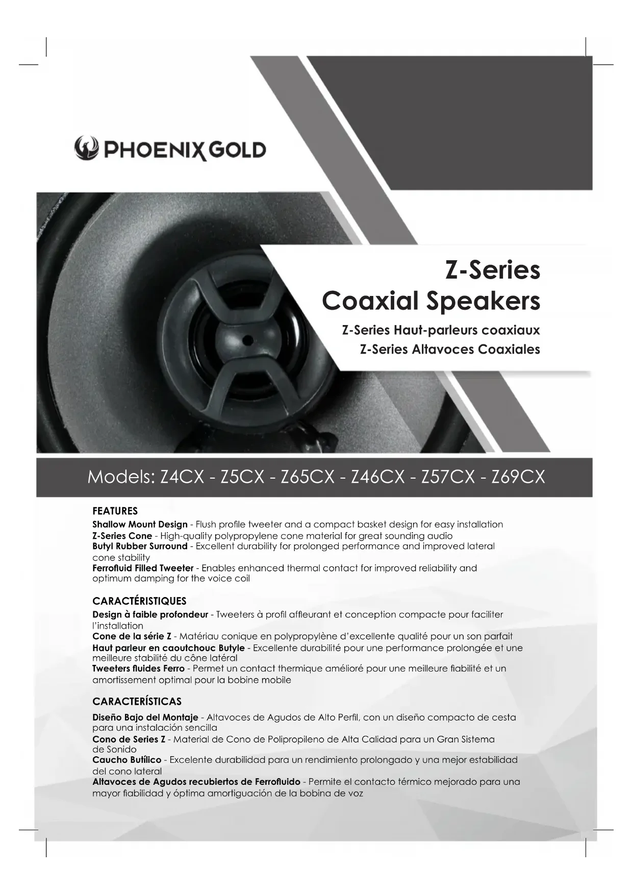 6. Terminez l’installation en remplaçant la grille dans le châssis de la grille.© 2017 Phoenix Gold • www.phoenixgold.com Z-Series Haut-parleurs coaxiaux Z4CX - Z5CX - Z65CX - Z46CX - Z57CX - Z69CX AVERTISSMENT Ne percez pas de trous de montage si le haut-parleur est en place. Cela pourrait permettre aux copeaux de forage d’endommager la bobine de voix et annulerait votre garantie.
