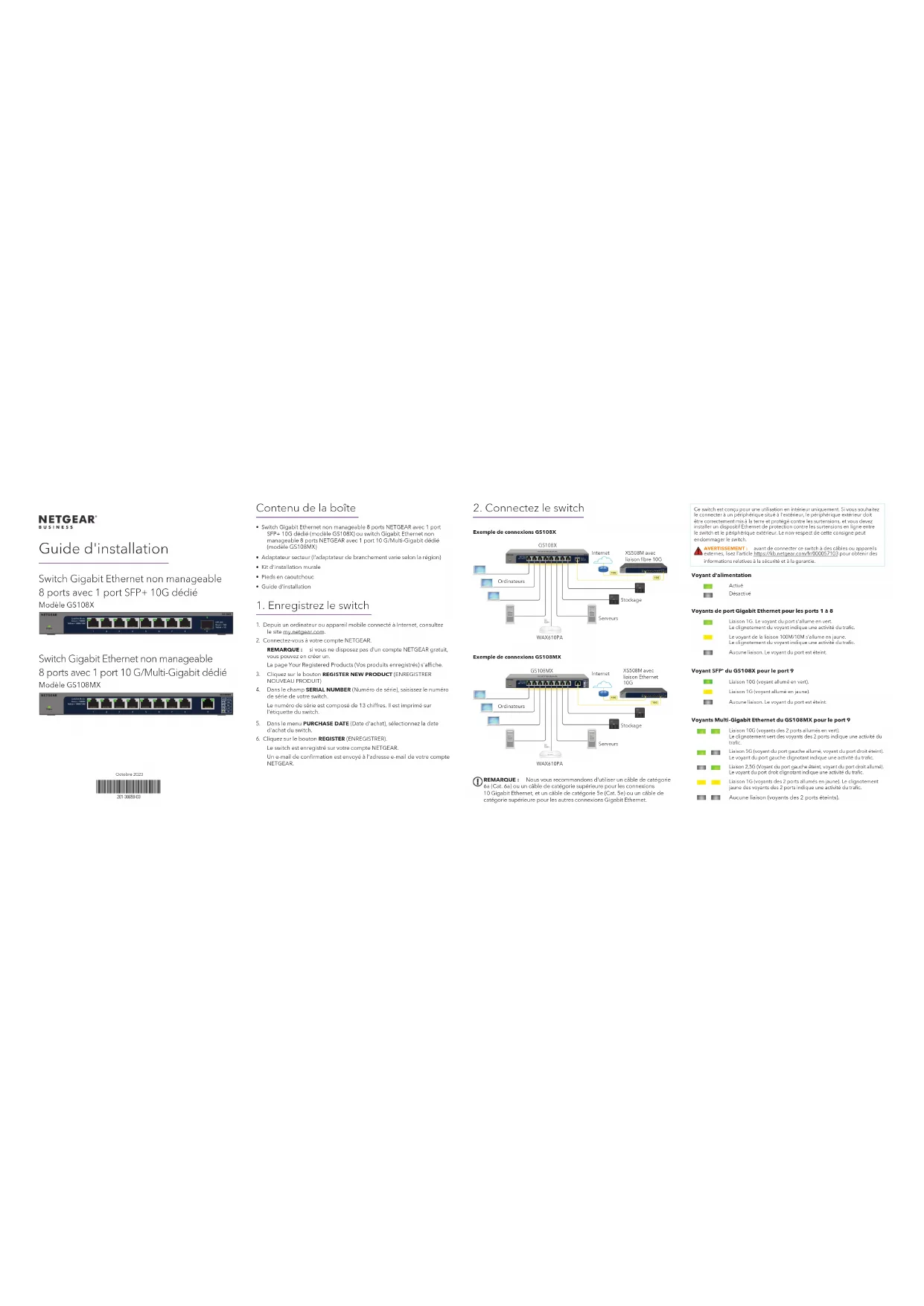 Exemple de connexions GS108X REMARQUE: Nous vous recommandons d'utiliser un câble de catégorie 6a (Cat. 6a) ou un câble de catégorie supérieure pour les connexions 10Gigabit Ethernet, et un câble de catégorie 5e (Cat. 5e) ou un câble de catégorie supérieure pour les autres connexions Gigabit Ethernet. AVERTISSEMENT: avant de connecter ce switch à des câbles ou appareils externes, lisez l’article https://kb.netgear.com/fr/000057103 pour obtenir des informations relatives à la sécurité et à la garantie. Ce switch est conçu pour une utilisation en intérieur uniquement. Si vous souhaitez le connecter à un périphérique situé à l'extérieur, le périphérique extérieur doit être correctement mis à la terre et protégé contre les surtensions, et vous devez installer un dispositif Ethernet de protection contre les surtensions en ligne entre le switch et le périphérique extérieur. Le non-respect de cette consigne peut endommager le switch. Switch Gigabit Ethernet non manageable 8ports avec 1port 10G/Multi-Gigabit dédié Modèle GS108MX Octobre2023 Voyant d'alimentation ActivéDésactivé Voyants de port Gigabit Ethernet pour les ports 1 à 8 Liaison 1G. Le voyant du port s'allume en vert. Le clignotement du voyant indique une activité du trac.Le voyant de la liaison 100M/10M s'allume en jaune. Le clignotement du voyant indique une activité du trac.Aucune liaison. Le voyant du port est éteint. Voyant SFP