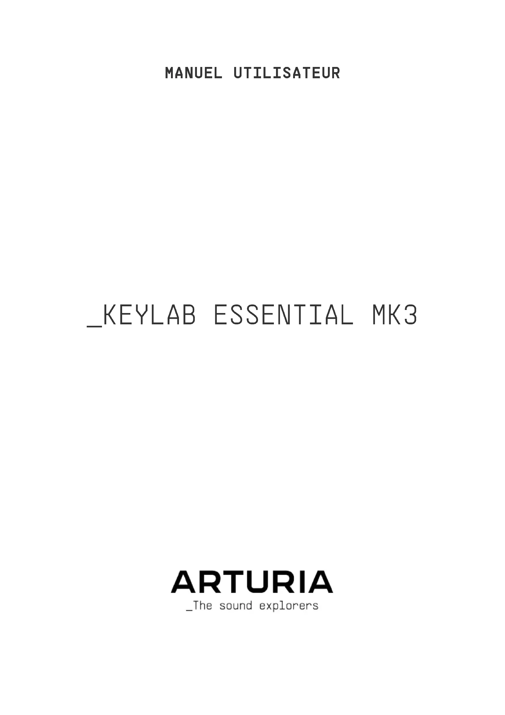 Charles Capsis IV Richard Courtel Adrian Dybowski Andrew Henderson Are Leistad Andrew Macaulay Terry Marsden Paolo Apollo Negri Grégory Roudgé TJ Trifeletti © ARTURIA SA – 2024 – Tous droits réservés. 26 avenue Jean Kuntzmann 38330 Montbonnot-Saint-Martin FRANCE www.arturia.com Les informations présentes dans ce manuel sont susceptibles d’être modifiées sans préavis et n’engagent aucunement la responsabilité d’Arturia. Le logiciel décrit dans ce manuel est fourni selon les termes d’un contrat de licence ou d’un accord de non-divulgation. Le contrat de licence logiciel spécifie les termes et conditions de son utilisation licite. Ce manuel ne peut être reproduit ou transmis sous n’importe quelle forme ou dans un but autre que l’utilisation personnelle de l’utilisateur, sans la permission écrite de la société ARTURIA S.A. Tous les autres produits, logos ou noms de sociétés cités dans ce manuel sont des marques ou des marques déposées appartenant à leurs propriétaires respectifs. Product version: 1.1.6 Revision date: 22 February 2024Félicitations pour l’achat de l’ Arturia KeyLab Essential mk3 ! Préparez-vous à entamer votre voyage musical. Le KeyLab Essential est un contrôleur MIDI universel pris en charge nativement, capable d’exploiter la puissance de la quasi-totalité des instruments logiciels et DAW. Il a été conçu pour améliorer votre workflow, vous permettre de passer moins de temps sur votre clavier et votre souris pour créer de la musique, et s’intègre parfaitement à Analog Lab V d’Arturia. Ce manuel utilisateur passe en revue l’utilisation et les fonctions générales du KeyLab Essential et vous détaille les aspects techniques du contrôleur, de sorte que vous puissiez profiter au maximum de ses fonctionnalités avancées. Ce pack comprend :