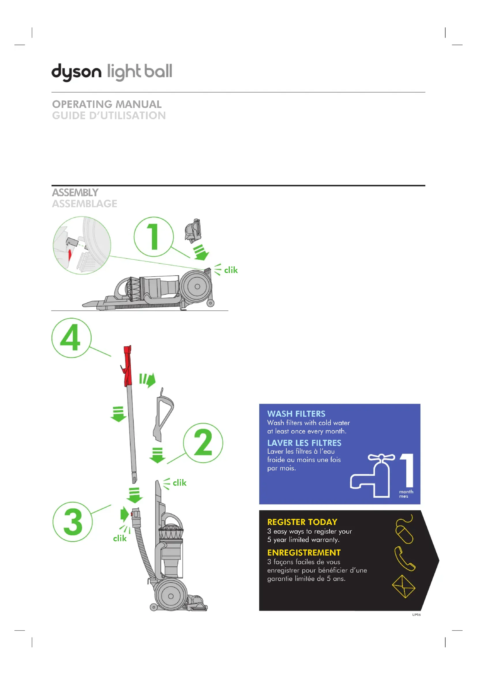 clik clik clik clik clik Wash filters with cold water at least once every month.The filters may require more frequent washing if vacuuming fine dust. Laver les filtres à l’eau froide au moins une fois par mois.Les filtres doivent être nettoyés plus souvent si l’appareil est utilisé pour aspirer de fines poussières. IMPORTANT! WASH FILTERS IMPORTANT!