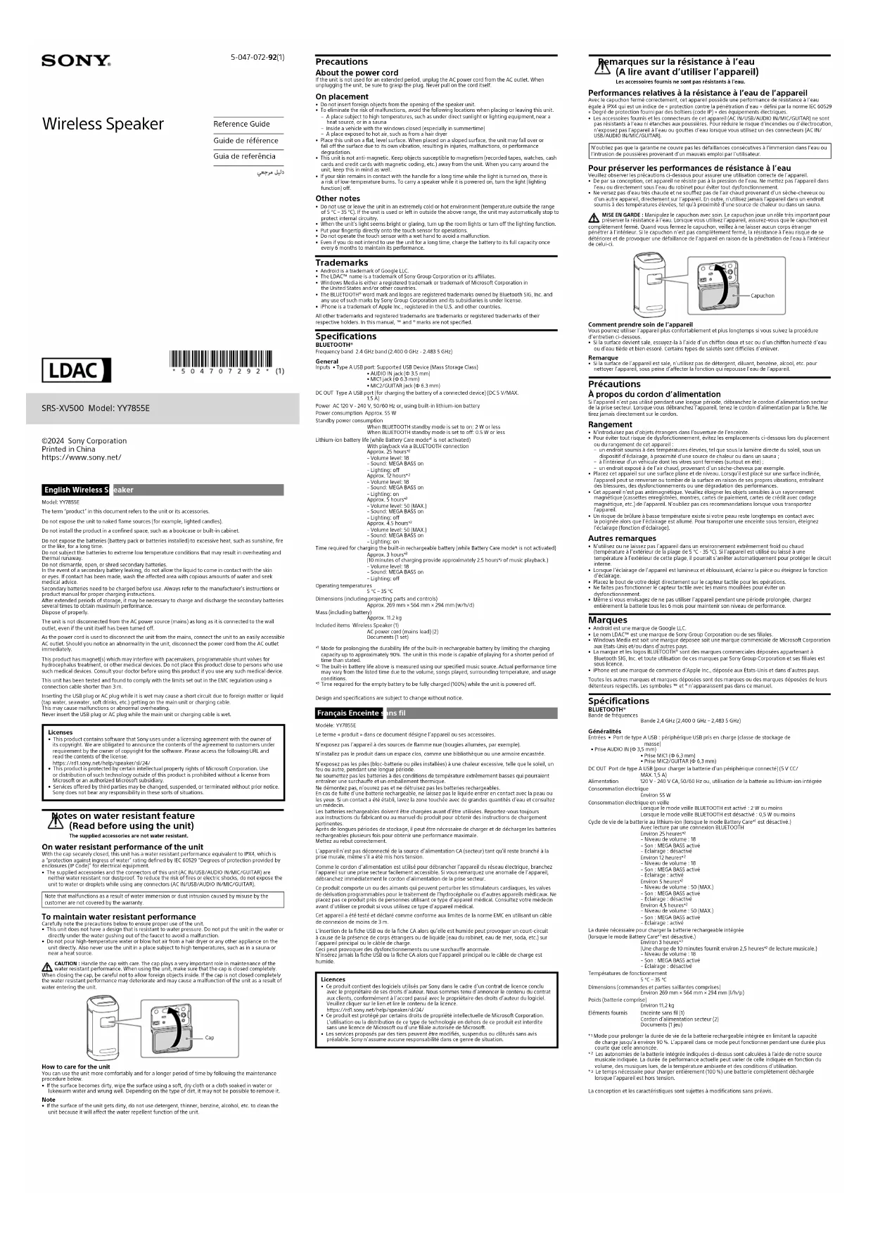 Time required for the empty battery to be fully charged (100%) while the unit is powered off.Design and specifications are subject to change without notice. Français Enceinte sans fil Modèle: YY7855ELe terme « produit » dans ce document désigne l’appareil ou ses accessoires.N’exposez pas l’appareil à des sources de flamme nue (bougies allumées, par exemple).N’installez pas le produit dans un espace clos, comme une bibliothèque ou une armoire encastrée.N’exposez pas les piles (bloc-batterie ou piles installées) à une chaleur excessive, telle que le soleil, un feu ou autre, pendant une longue période.Ne soumettez pas les batteries à des conditions de température extrêmement basses qui pourraient entraîner une surchauffe et un emballement thermique.Ne démontez pas, n’ouvrez pas et ne détruisez pas les batteries rechargeables.En cas de fuite d’une batterie rechargeable, ne laissez pas le liquide entrer en contact avec la peau ou les yeux. Si un contact a été établi, lavez la zone touchée avec de grandes quantités d’eau et consultez un médecin.Les batteries rechargeables doivent être chargées avant d’être utilisées. Reportez-vous toujours aux instructions du fabricant ou au manuel du produit pour obtenir des instructions de chargement pertinentes.Après de longues périodes de stockage, il peut être nécessaire de charger et de décharger les batteries rechargeables plusieurs fois pour obtenir une performance maximale.Mettez au rebut correctement.L’appareil n’est pas déconnecté de la source d’alimentation CA (secteur) tant qu’il reste branché à la prise murale, même s’il a été mis hors tension.Comme le cordon d’alimentation est utilisé pour débrancher l’appareil du réseau électrique, branchez l’appareil sur une prise secteur facilement accessible. Si vous remarquez une anomalie de l’appareil, débranchez immédiatement le cordon d’alimentation de la prise secteur.Ce produit comporte un ou des aimants qui peuvent perturber les stimulateurs cardiaques, les valves de dérivation programmables pour le traitement de l’hydrocéphalie ou d’autres appareils médicaux. Ne placez pas ce produit près de personnes utilisant ce type d’appareil médical. Consultez votre médecin avant d’utiliser ce produit si vous utilisez ce type d’appareil médical.Cet appareil a été testé et déclaré comme conforme aux limites de la norme EMC en utilisant un câble de connexion de moins de 3 m.L’insertion de la fiche USB ou de la fiche CA alors qu’elle est humide peut provoquer un court-circuit à cause de la présence de corps étrangers ou de liquide (eau du robinet, eau de mer, soda, etc.) sur l’appareil principal ou le câble de charge. Ceci peut provoquer des dysfonctionnements ou une surchauffe anormale.N’insérez jamais la fiche USB ou la fiche CA alors que l’appareil principal ou le câble de charge est humide.Licences• Ce produit contient des logiciels utilisés par Sony dans le cadre d’un contrat de licence conclu avec le propriétaire de ses droits d’auteur. Nous sommes tenu d’annoncer le contenu du contrat aux clients, conformément à l’accord passé avec le propriétaire des droits d’auteur du logiciel. Veuillez cliquer sur le lien et lire le contenu de la licence. https://rd1.sony.net/help/speaker/sl/24/• Ce produit est protégé par certains droits de propriété intellectuelle de Microsoft Corporation. L’utilisation ou la distribution de ce type de technologie en dehors de ce produit est interdite sans une licence de Microsoft ou d’une filiale autorisée de Microsoft.• Les services proposés par des tiers peuvent être modifiés, suspendus ou clôturés sans avis préalable. Sony n’assume aucune responsabilité dans ce genre de situation. Remarques sur la résistance à l’eau (A lire avant d’utiliser l’appareil) Les accessoires fournis ne sont pas résistants à l'eau. Performances relatives à la résistance à l’eau de l’appareil Avec le capuchon fermé correctement, cet appareil possède une performance de résistance à l’eau égale à IPX4 qui est un indice de « protection contre la pénétration d’eau » défini par la norme IEC 60529 « Degré de protection fourni par des boîtiers (code IP) » des équipements électriques.• Les accessoires fournis et les connecteurs de cet appareil (AC IN/USB/AUDIO IN/MIC/GUITAR) ne sont pas résistants à l’eau ni étanches aux poussières. Pour réduire le risque d’incendies ou d’électrocution, n’exposez pas l’appareil à l’eau ou gouttes d’eau lorsque vous utilisez un des connecteurs (AC IN/USB/AUDIO IN/MIC/GUITAR).N’oubliez pas que la garantie ne couvre pas les défaillances consécutives à l’immersion dans l’eau ou l’intrusion de poussières provenant d’un mauvais emploi par l’utilisateur. Pour préserver les performances de résistance à l’eau Veuillez observer les précautions ci-dessous pour assurer une utilisation correcte de l’appareil.• De par sa conception, cet appareil ne résiste pas à la pression de l’eau. Ne mettez pas l’appareil dans l’eau ou directement sous l’eau du robinet pour éviter tout dysfonctionnement.• Ne versez pas d’eau très chaude et ne soufflez pas de l’air chaud provenant d’un sèche-cheveux ou d’un autre appareil, directement sur l’appareil. En outre, n'utilisez jamais l'appareil dans un endroit soumis à des températures élevées, tel qu'à proximité d'une source de chaleur ou dans un sauna.MISE EN GARDE : Manipulez le capuchon avec soin. Le capuchon joue un rôle très important pour préserver la résistance à l’eau. Lorsque vous utilisez l’appareil, assurez-vous que le capuchon est complètement fermé. Quand vous fermez le capuchon, veillez à ne laisser aucun corps étranger pénétrer à l’intérieur. Si le capuchon n’est pas complètement fermé, la résistance à l’eau risque de se détériorer et de provoquer
