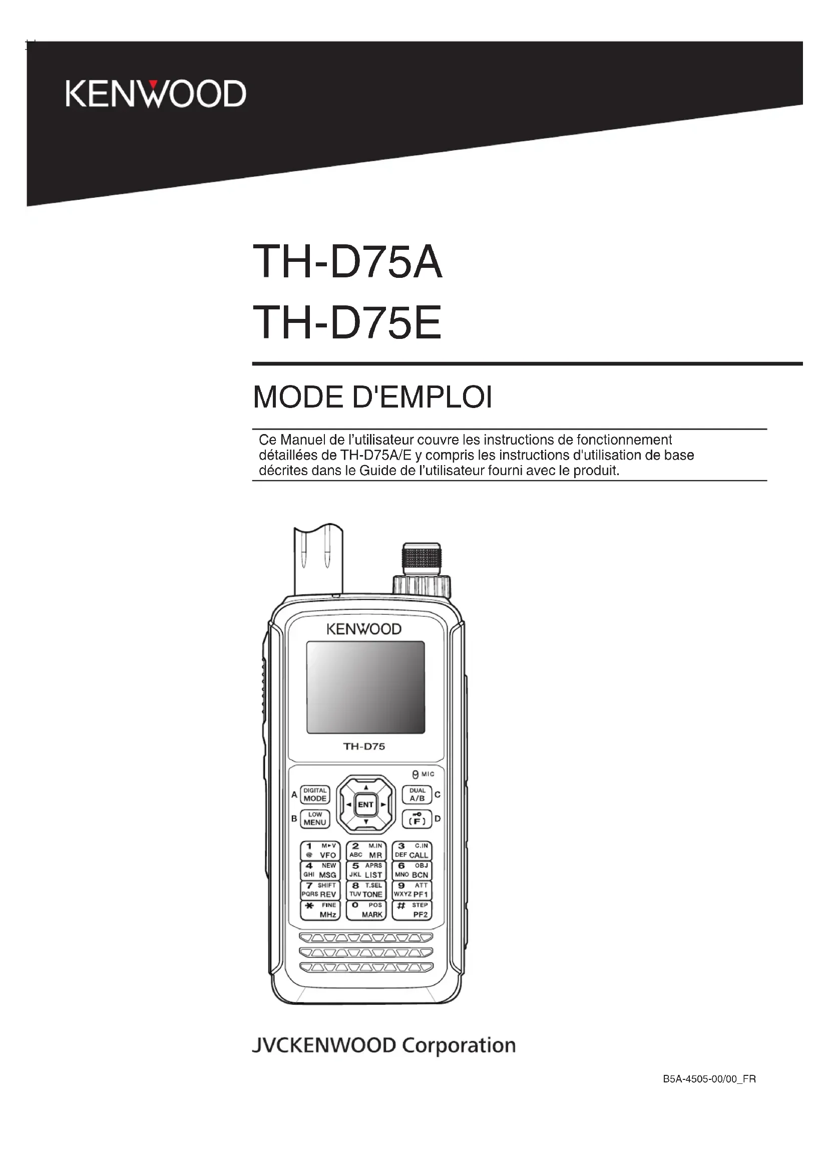 B5A-4505-00/00_FR MODE D'EMPLOI Ce Manuel de l’utilisateur couvre les instructions de fonctionnement détaillées de TH-D75A/E y compris les instructions d'utilisation de base décrites dans le Guide de l’utilisateur fourni avec le produit. TH-D75A TH-D75E1-1