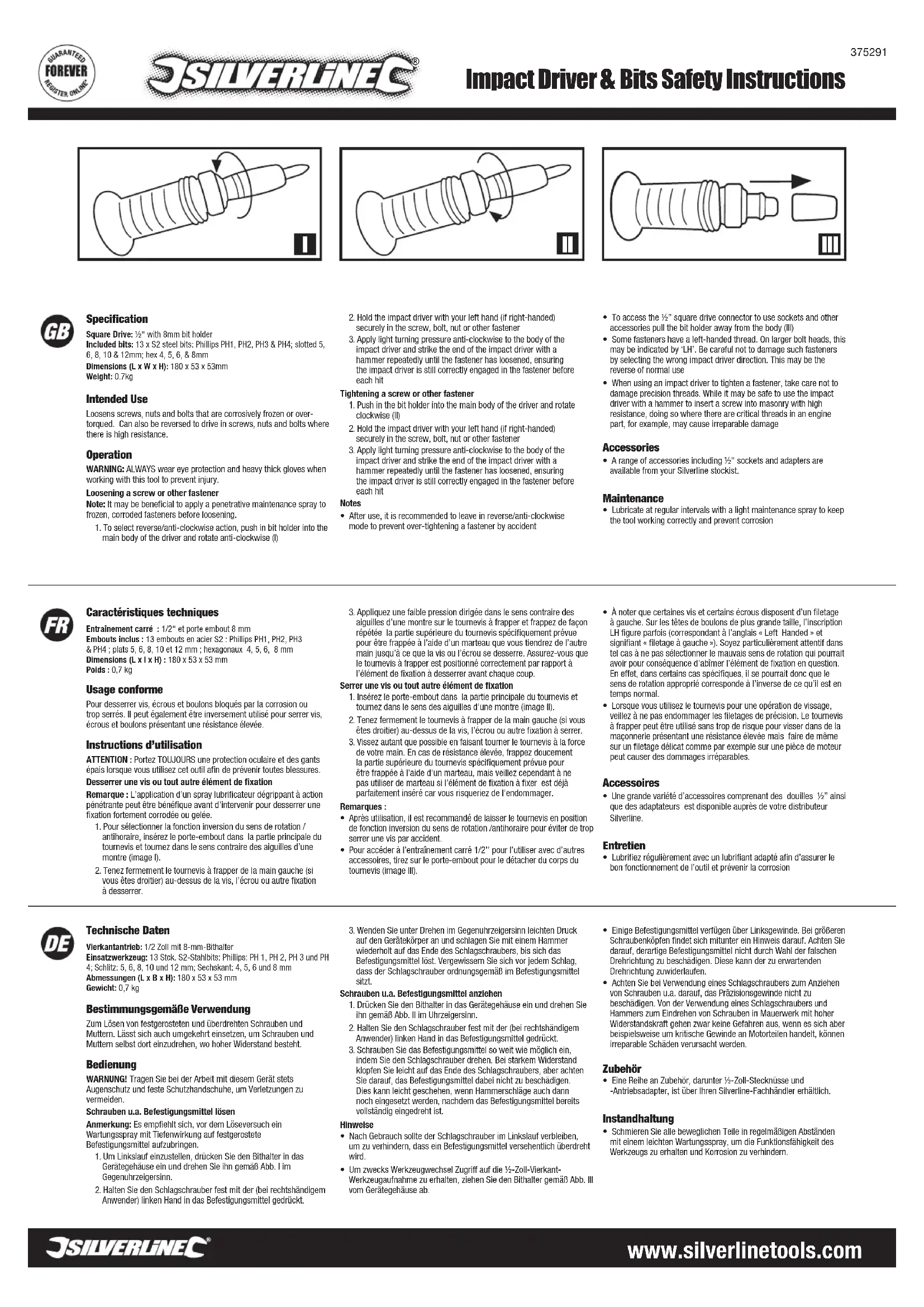 - Lubricate at regular intervals with a light maintenance spray to keep the tool working correctly and prevent corrosion Usage conforme Pour desserrer vis, écrous et boulons bloqués par la corrosion ou trop serrés. Il peut également être inversement utilisé pour serrer vis, écrous et boulons présentant une résistance élevée. Instructions d’utilisation ATTENTION : Portez TOUJOURS une protection oculaire et des gants épais lorsque vous utilisez cet outil afin de prévenir toutes blessures.Desserrer une vis ou tout autre élément de fixation Remarque : L’application d’un spray lubrificateur dégrippant à action pénétrante peut être bénéfique avant d’intervenir pour desserrer une fixation fortement corrodée ou gelée. 1. Pour sélectionner la fonction inversion du sens de rotation / antihoraire, insérez le porte-embout dans la partie principale du tournevis et tournez dans le sens contraire des aiguilles d’une montre (image I). 2. Tenez fermement le tournevis à frapper de la main gauche (si vous êtes droitier) au-dessus de la vis, l’écrou ou autre fixation à desserrer. 3. Appliquez une faible pression dirigée dans le sens contraire des aiguilles d’une montre sur le tournevis à frapper et frappez de façon répétée la partie supérieure du tournevis spécifiquement prévue pour être frappée à l’aide d’un marteau que vous tiendrez de l’autre main jusqu’à ce que la vis ou l’écrou se desserre. Assurez-vous que le tournevis à frapper est positionné correctement par rapport à l’élément de fixation à desserrer avant chaque coup. Serrer une vis ou tout autre élément de fixation 1. Insérez le porte-embout dans la partie principale du tournevis et tournez dans le sens des aiguilles d’une montre (image II).2. Tenez fermement le tournevis à frapper de la main gauche (si vous êtes droitier) au-dessus de la vis, l’écrou ou autre fixation à serrer. 3. Vissez autant que possible en faisant tourner le tournevis à la force de votre main. En cas de résistance élevée, frappez doucement la partie supérieure du tournevis spécifiquement prévue pour être frappée à l’aide d’un marteau, mais veillez cependant à ne pas utiliser de marteau si l’élément de fixation à fixer est déjà parfaitement inséré car vous risqueriez de l’endommager. Remarques : • Après utilisation, il est recommandé de laisser le tournevis en position de fonction inversion du sens de rotation /antihoraire pour éviter de trop serrer une vis par accident.• Pour accéder à l’entraînement carré 1/2’’ pour l’utiliser avec d’autres accessoires, tirez sur le porte-embout pour le détacher du corps du tournevis (image III). Caractéristiques techniques Entraînement carré : 1/2" et porte embout 8 mmEmbouts inclus : 13 embouts en acier S2 : Phillips PH1, PH2, PH3 & PH4 ; plats 5, 6, 8, 10 et 12 mm ; hexagonaux 4, 5, 6, 8 mmDimensions (L x l x H) : 180 x 53 x 53 mmPoids : 0,7 kg • À noter que certaines vis et certains écrous disposent d’un filetage à gauche. Sur les têtes de boulons de plus grande taille, l’inscription LH figure parfois (correspondant à l’anglais « Left Handed » et signifiant « filetage à gauche »). Soyez particulièrement attentif dans tel cas à ne pas sélectionner le mauvais sens de rotation qui pourrait avoir pour conséquence d’abîmer l’élément de fixation en question. En effet, dans certains cas spécifiques, il se pourrait donc que le sens de rotation approprié corresponde à l’inverse de ce qu’il est en temps normal. • Lorsque vous utilisez le tournevis pour une opération de vissage, veillez à ne pas endommager les filetages de précision. Le tournevis à frapper peut être utilisé sans trop de risque pour visser dans de la maçonnerie présentant une résistance élevée mais faire de même sur un filetage délicat comme par exemple sur une pièce de moteur peut causer des dommages irréparables. Accessoires