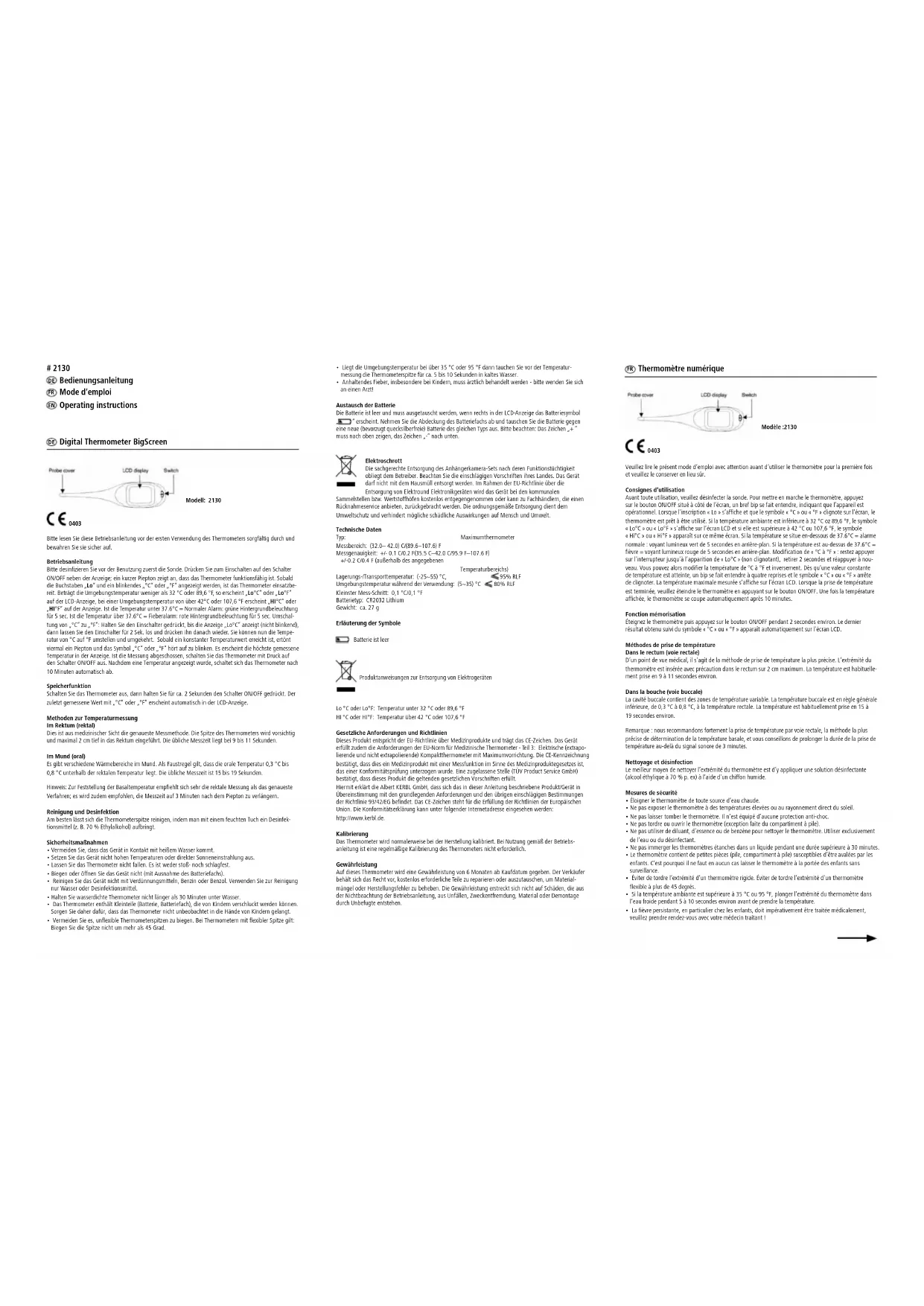 Operating instructionsRemplacement de la pile Lorsque le symbole d’une pile, « » s’affiche sur la droite de l’écran LCD, cela signifie que la pile est vide et qu’il convient de la remplacer. Retirer le couvercle du compartiment à pile et remplacer la pile par une pile du même type (de préférence sans mercure). Note: le signe «+» doit être orienté vers le haut, le signe «-» vers le bas. Mise au rebut des composants électroniques du produit La mise au rebut du produit en fin de vie incombe à l’utilisateur. Veuillez consulter la régle- mentation nationale en vigueur. L’appareil ne doit pas être jeté dans les ordures ménagères. Conformément aux dispositions de la directive européenne DEEE (Déchets d’équipements électriques et électroniques), l’appareil peut être éliminé gratuitement auprès des points de collecte ou des centres de recyclage locaux. Le produit peut également être renvoyé aux revendeurs qui proposent un service de collecte. L’élimination correcte des composants de ce produit permet d’œuvrer à la protection de l’environnement et de prévenir tout effet néfaste sur la santé ou sur l’écosystème. Caractéristiques techniques Type: thermomètre à maximum Plage de mesure: (32.0~ 42.0) C/(89.6~107.6) F Précision de mesure: +/- 0.1 C/0.2 F(35.5 C~42.0 C/95.9 F~107.6 F) +/-0.2 C/0.4 F(pour la plage de mesure considérée) Température de conservation/transport: (-25 ~ 55) °C, 95% Hr Température ambiante pendant l’utilisation: (5 ~ 35) °C, 80% Hr Graduation min.: 0,1 °C/0,1 °F Type de pile: CR2032 Lithium Poids: env. 27 g Signification des symboles la pile est vide consignes relatives à l’élimination des appareils électroniques Lo °C ou Lo°F: température inférieure à 32 °C HI °C ou Hi°F: température supérieure à 42 °C Directives et dispositions légales Ce produit est conforme à la directive européenne 93/42/CEE relative aux dispositifs médicaux et porte le label CE. Ce produit est également conforme aux directives de la norme européenne sur les thermomètres médicaux - partie 3: thermomètres compacts électroniques (extrapolants et non-extrapolants) avec fonction de mesure à maxima. Le label CE signifie qu’il s’agit d’un dispositif médical doté d’une fonction de mesure au sens de la loi sur les dispositifs médicaux et que ce produit a été soumis à une évaluation de conformité. Un organisme notifié (TÜV Produkt Service GmbH) confirme que ce produit remplit toutes les conditions légales s‘y reportant. Par la présente, la société Albert KERBL GmbH déclare que le produit/l’appareil décrit dans le présent mode d’emploi est conforme aux dispositions fondamentales et à toute autre condition en vigueur de la directive 93/42/CEE. Le label CE signifie que le produit satisfait aux exigences des directives européennes. La décla- ration de conformité peut être consultée à l’adresse suivante: http://www.kerbl.de Contrôle d’étalonnage Ce thermomètre est initialement taré au moment de la fabrication. Si ce thermomètre est utilisé conformé- ment aux consignes d’utilisation, un réglage périodique n’est pas nécessaire. Garantie Ce thermomètre est couvert par la garantie pendant 6 mois à compter de la date d’achat. Le revendeur se réserve le droit de remplacer ou de réparer à titre gracieux les pièces nécessaires à l’élimination du défaut du matériau ou relatif à la mise en œuvre. La garantie ne s’applique pas aux dommages résultant du non respect des consignes d’utilisation, d’une chute accidentelle, d’une utilisation incorrecte, de l’utilisation de matériels non autorisés ou de toute manipulation effectuée par des personnes non habilitées.