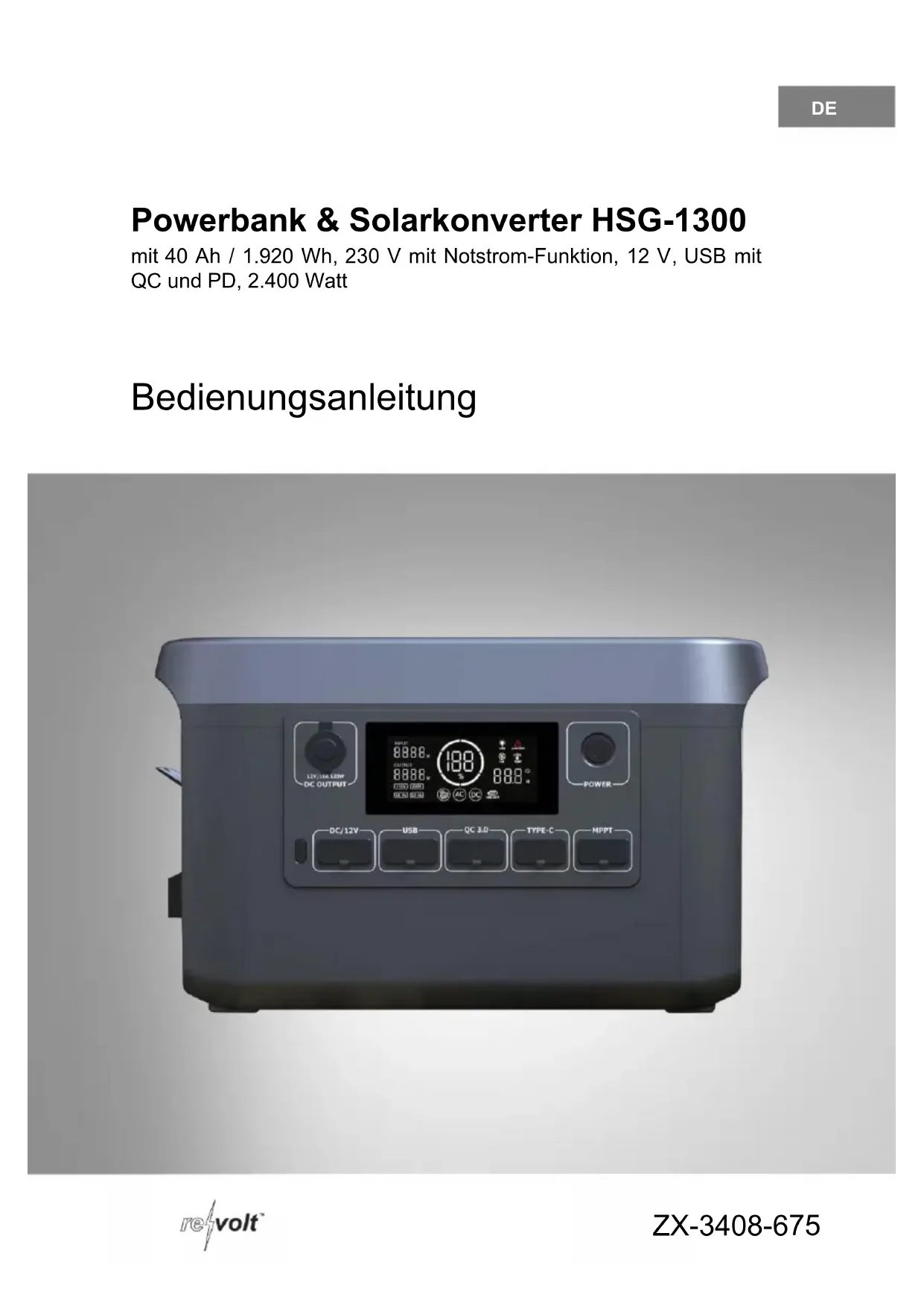 - HSG-1300 Batterie nomade et convertisseur solaire 40 Ah / 1920 Wh / 230 V avec fonction UPS / 12 V / USB Quick Charge et Power Delivery / 2400 W Mode d'emploiFR 2 revolt – www.re-volt.fr Table des matières Votre nouvelle batterie nomade et convertisseur solaire p. 3