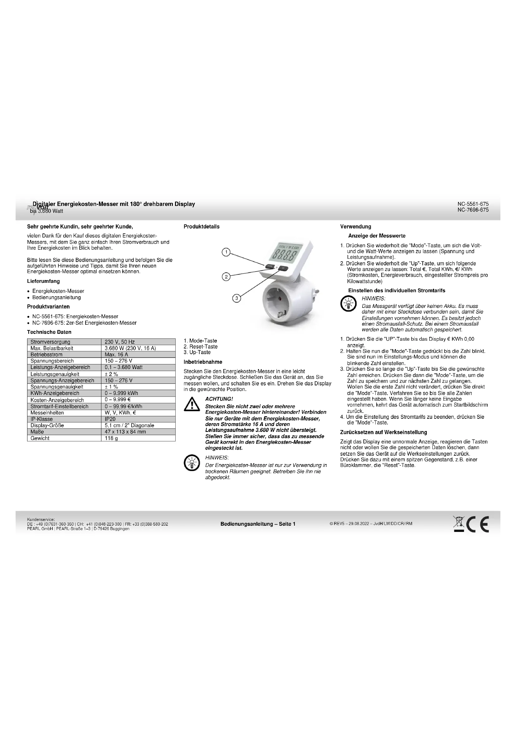Informationen und Antworten auf häufige Fragen (FAQs) zu vielen unserer Produkte sowie ggfs. aktualisierte Handbücher finden Sie auf der Internetseite: www.revolt-power.de Geben Sie dort im Suchfeld die Artikelnummer oder den Artikelnamen ein.Appareil de mesure énergétique numérique 3680 W avec écran LCD rotatif Mode d'emploi – page 1 PEARL GmbH | PEARL-Straße 1–3 | D-79426 Buggingen Service commercial PEARL France : 0033 (0) 3 88 58 02 02 © REV5 – 29.08.2022 – JvdH/LW/DD/CR//RM NC-5561-675 NC-7696-675 Chère cliente, cher client, Nous vous remercions d'avoir choisi cet appareil de mesure énergétique numérique. Ce dernier vous indique votre consommation et les coûts en résultant sur son écran LCD rotatif. Afin d'utiliser au mieux votre nouveau produit, veuillez lire attentivement ce mode d'emploi et respecter les consignes et astuces suivantes. Contenu Appareil de mesure énergétique Mode d'emploi Variantes du produit NC5661 : appareil de mesure NC7696 : 2 appareils de mesure Caractéristiques techniques Alimentation 230 V / 50 Hz Charge maximale supportée 3680 W (230 V, 16 A) Courant de fonctionnement 16 A max. Plage de mesure de la tension 150 ‒ 276 V Plage d'affichage de la puissance 0,1 ‒ 3680 W Précision d'affichage de la puissance ± 2 % Plage d'affichage de la tension 150 ‒ 276 V Précision d'affichage de la tension ± 1 % Plage d'affichage de la consommation 0 ‒ 9999 kWh Plage d'affichage des coûts 0 ‒ 9999 € Plage de fixation des coûts de l'électricité 0 ‒ 99,99 €/kWh Unités de mesure W, V, KWh, € Classe de protection IP20 Taille de l'écran Diagonale 5,1 cm / 2" Dimensions 47 x 113 x 84 mm Poids 118 g Description du produit