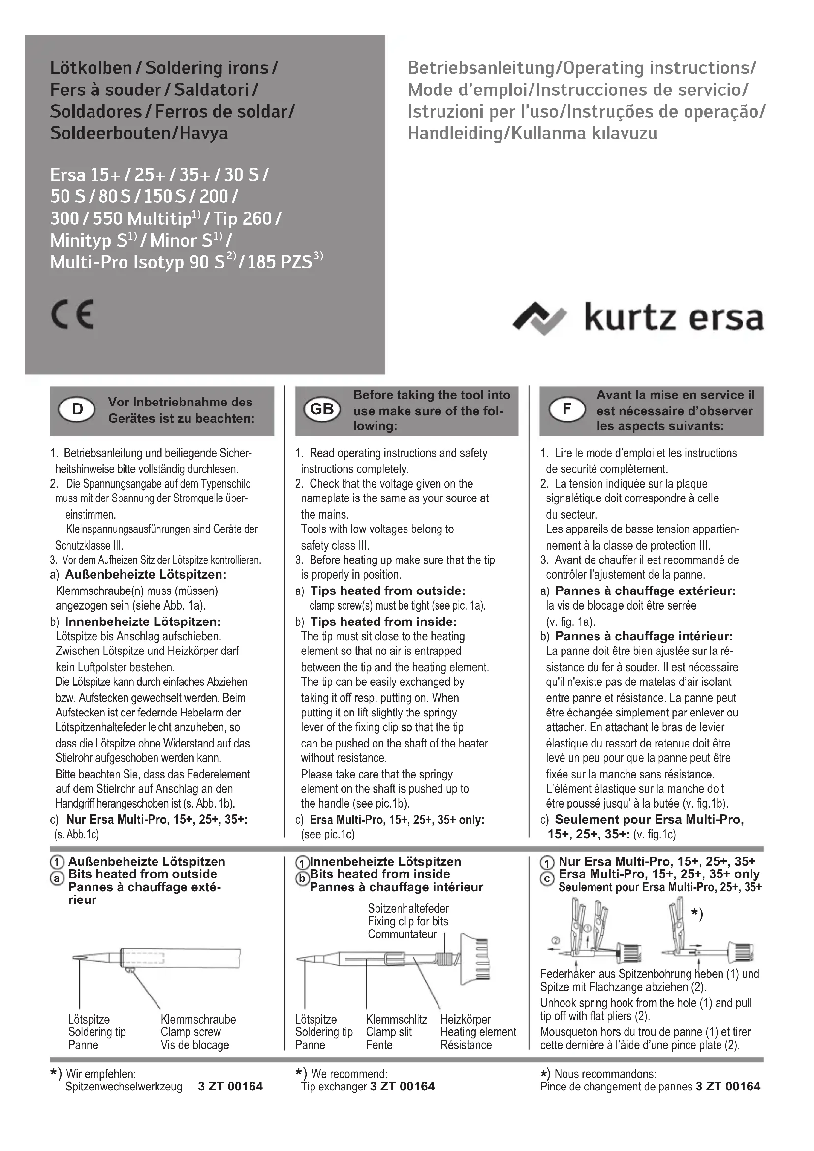 Do not open the soldering iron! For safety reasons repairs can only be carried out by the manufacturer. Only for Minor S/Minityp S/15+/25+/35+ The change of heating elements is not possible with this equipment. Attention: Vous ne devez en aucun cas intervenir sur le fer à souder ou y apporter des modifications. Les réparations doivent être effectuées par Ersa ou des électricienes qualifiés et autorisés. Les appareils contiennent des pièces conductrices du courant ou sous tension. Danger de mort en cas d’intervention inadéquate. Seulement pour Isotyp 90S