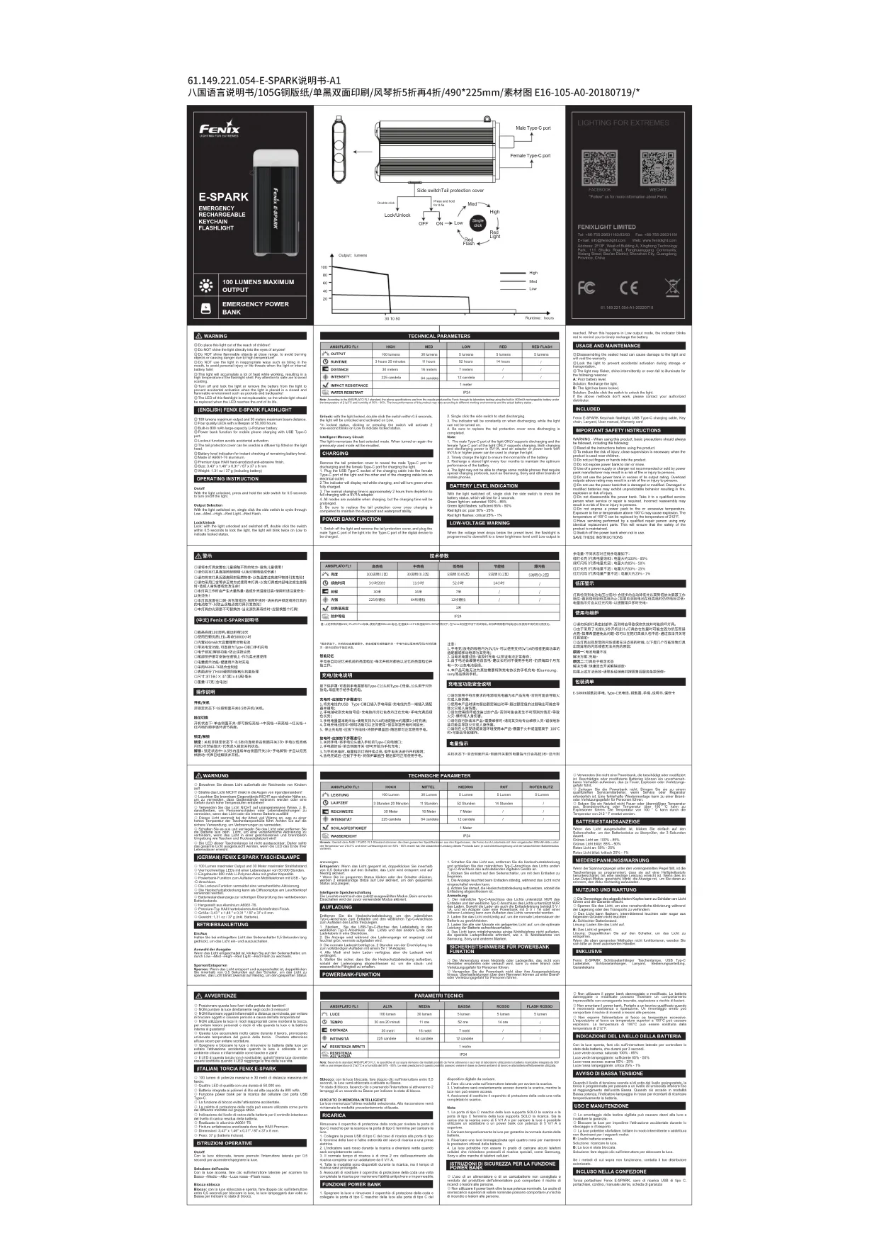 ◎ Le démontage de la tête scellée peut causer des dommages à la lampe et annule la garantie. ◎ Verrouillez la lampe pour éviter une activation accidentelle pendant le stockage ou le transport. ◎ La luminosité de la lampe peut vaciller, briller par intermittence ou même ne pas s’allumer pour les raisons suivantes : A : Faible niveau de la batterie. Solution : Rechargez la lampe. B : La lampe a été verrouillée. Solution : Double-cliquez sur l’interrupteur pour déverrouiller la lampe. Si les recommandations ci-dessus ne fonctionnent pas, veuillez contacter votre distributeur agréé. CONTENU Lampe torche Fenix E-SPARK, câble de rechargement USB Type-C, chaînette porte-clés, dragonne, manuel d’utilisation, carte de garantie