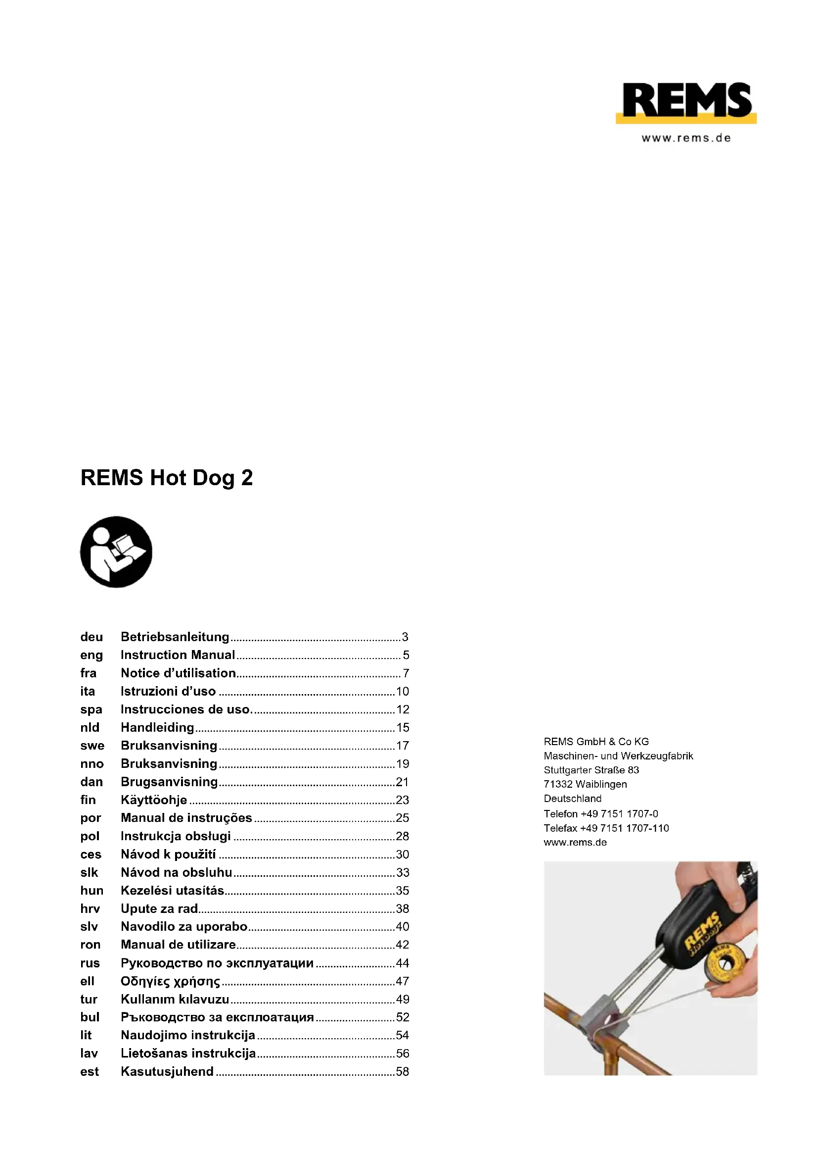 Utilisationconforme AVERTISSEMENT REMS Hot Dog 2 est prévu pour la soudure à l'étain de tubes cuivre. Toute autre utilisation est non conforme et donc interdite. 1.1. Fourniture Pince à souder électrique, alliage de soudure, pâte, brosse de nettoyage, notice d'utilisation, coffret métallique avec insertion ignifuge. 1.2. Codes REMS Hot Dog 2 dans coffret métallique 163020 REMS Lot Cu 3 160200 REMS Paste Cu 3 160210 REMS Cu-Vlies 160300 Coffret métallique REMS Hot Dog 2 163350 REMS CleanM 140119 1.3. Domained’utilisation Tubescuivreécrouietrecuit10–28mm/⅜–1⅛" 1.4. Caractéristiquesélectriques 230 V~, 50 – 60 Hz, 440 W 100 / 110 V~, 50 – 60 Hz, 440 W Degré de protection IP 20 Classe de protection I 1.5. Niveau sonore Nuisance acoustique au poste de travail 70 dB(A), K 3 dB(A) 1.6. Vibrations Valeur effective pondérée de l’accélération 2,5 m/s² Le niveau moyen de vibrations a été mesuré au moyen d’un protocole d’essai normalisé et peut servir pour effectuer une comparaison avec un autre appareil. ATTENTION Le niveau moyen de vibrations est susceptible de varier en fonction des condi