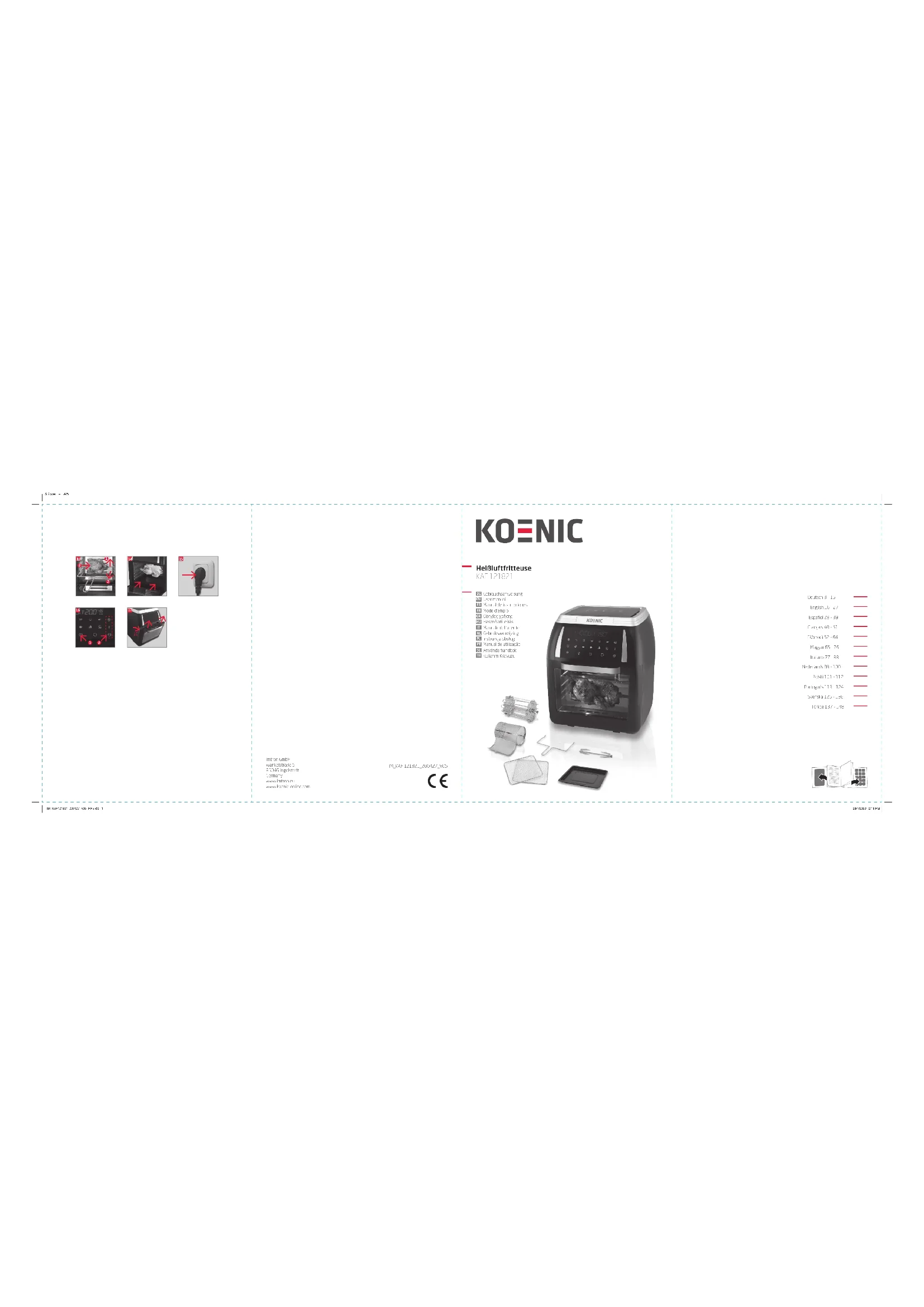 - L’huile et la graisse s’enflamment facilement. L’huile et la graisse ne doivent pas goutter sur les éléments chauants. IM_KAF121821_200427_V05_HR.indb 43IM_KAF121821_200427_V05_HR.indb 43 28/4/2020 2:18 PM28/4/2020 2:18 PM44 Français Size - A5 Félicitations!! Merci d’avoir acheté un produit KOENIC. Veuillez lire soigneusement ce manuel et le conserver pour une consultation future. Usage prévu Ce produit convient uniquement à la préparation des aliments. Toute autre utilisation peut provoquer l’endommagement de l’appareil ou des blessures. Imtron GmbH n’assume aucune responsabilité quant à des dommages au produit, à des dommages matériels ou à des blessures corporelles dus à une négligence ou un usage inapproprié du produit, ou à un usage du produit non indiqué par le fabricant. Avant de l’utiliser pour la Premiere fois Retirez soigneusement le produit et les accessoires de leur emballage d’origine. Il est conseillé de conserver l’emballage d’origine pour le rangement. Si vous souhaitez disposer de l’emballage d’origine, veuillez respecter les recommandations légales en vigueur. Si vous avez des questions concernant le rebut approprié, contactez le service de déchetterie local. Vérifiez que le contenu est complet et qu’il n’est pas endommagé. Si le contenu livré est incomplet ou endommagé, contactez immédiatement votre revendeur. Après avoir déballé, veuillez consulter la section Nettoyage et entretien. Pour éliminer les résidus de fabrication, faites fonctionner le produit pendant environ 10minutes sans aucun aliment. Veuillez consulter la section Utilisation. Assurez-vous qu’il y a une ventilation susante dans la mesure où le produit peut émettre une légère odeur ainsi que de la fumée. Cela est sans danger et disparaîtra rapidement. Mise au rebut Ne pas éliminer cet appareil dans les déchets ménagers municipaux non triés. Les retourner au point de collecte désigné pour le recyclage des WEEE. Se conduire ainsi aidera à préserver les ressources et à protéger l’environnement. Contacter votre revendeur ou les autorités locales pour de plus amples informations. Contenu 1 x Friteuse à air chaud 3 x Grilles de cuisson 1 x Plaque de cuisson / récupérateur de graisses 1 x Panier rotatif 1 x Ensemble de la rôtissoire 1 x Poignée de la rôtissoire 1 x Ensemble de brochettes à viande 1 x Mode d’emploi Données techniques Tension nominale : 220 - 240 V~ Puissance nominale : 1800 W Fréquence nominale : 50/60 Hz Contrôle et composants