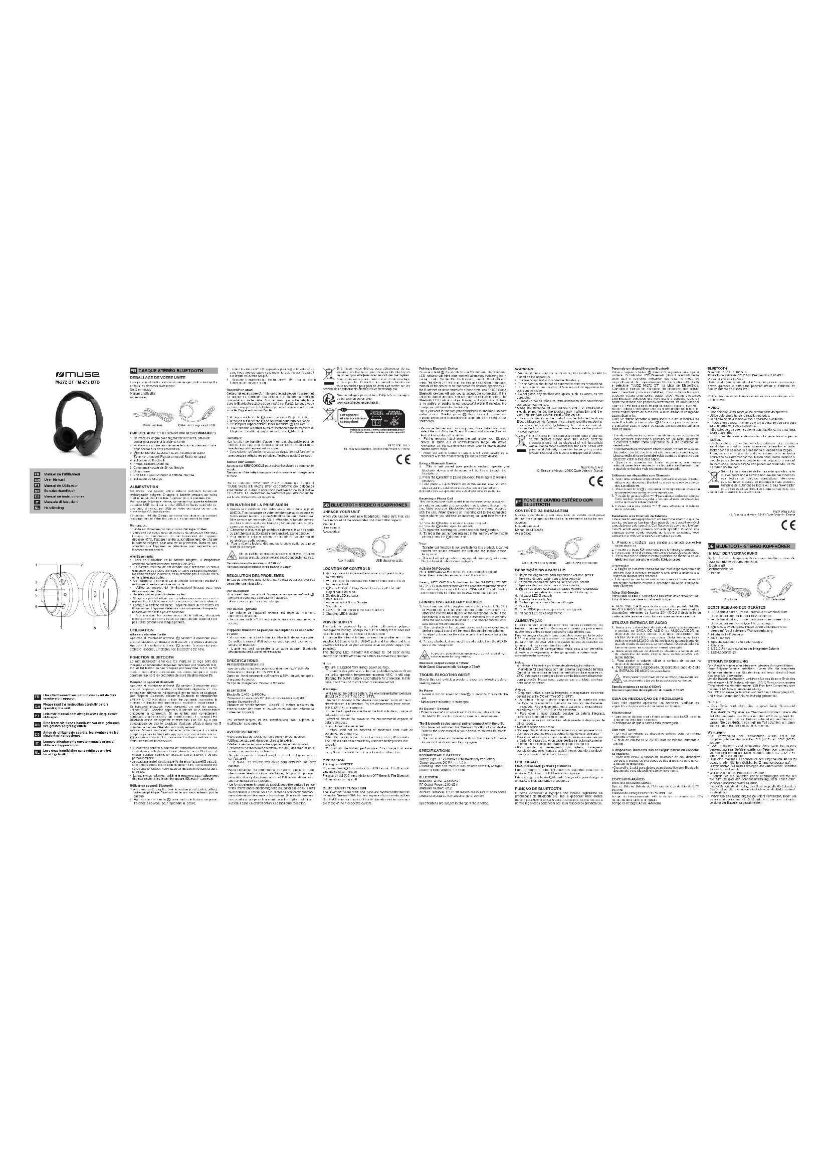 ainsi que les marques et logo sont des marques commerciales déposées détenues par Bluetooth SIG, Inc. et l'utilisation de ces marques par New One S.A.S se fait dans le cadre d'une autorisation. Les autres marques et noms commerciaux sont les propriétés de leurs titulaires respectifs. Coupler un appareil Bluetooth Appuyez et maintenez enfoncé pendant 3 secondes pour allumer l'appareil. L’indicateur de Bluetooth clignotera en bleu et rouge en alternance indiquant qu'il est en mode de couplage. Sur l'appareil Bluetooth, activez le Bluetooth et sélectionnez «MUSE M-272 BT» dans la liste des appareils. (consultez le manuel d'instruction de l'appareil pour les détails de connexion). Si l'appareil Bluetooth vous demande un mot de passe, utilisez '0000'. Certains appareils Bluetooth vous demanderont d'accepter la connexion. Si les unités sont correctement couplées, vous entendrez un signal sonore, Le voyant LED Bluetooth cesse de clignoter et reste bleu xe. S'il n'y a pas de couplage ou que le couplage n'est pas eectué dans les 5 minutes, le casque s'éteindra automatiquement. Astuce: Si vous souhaitez connecter votre casque à un autre périphérique audio Bluetooth, appuyez rapidement trois fois sur pour vous déconnecter, puis suivre les étapes ci-dessus pour établir une nouvelle connexion.