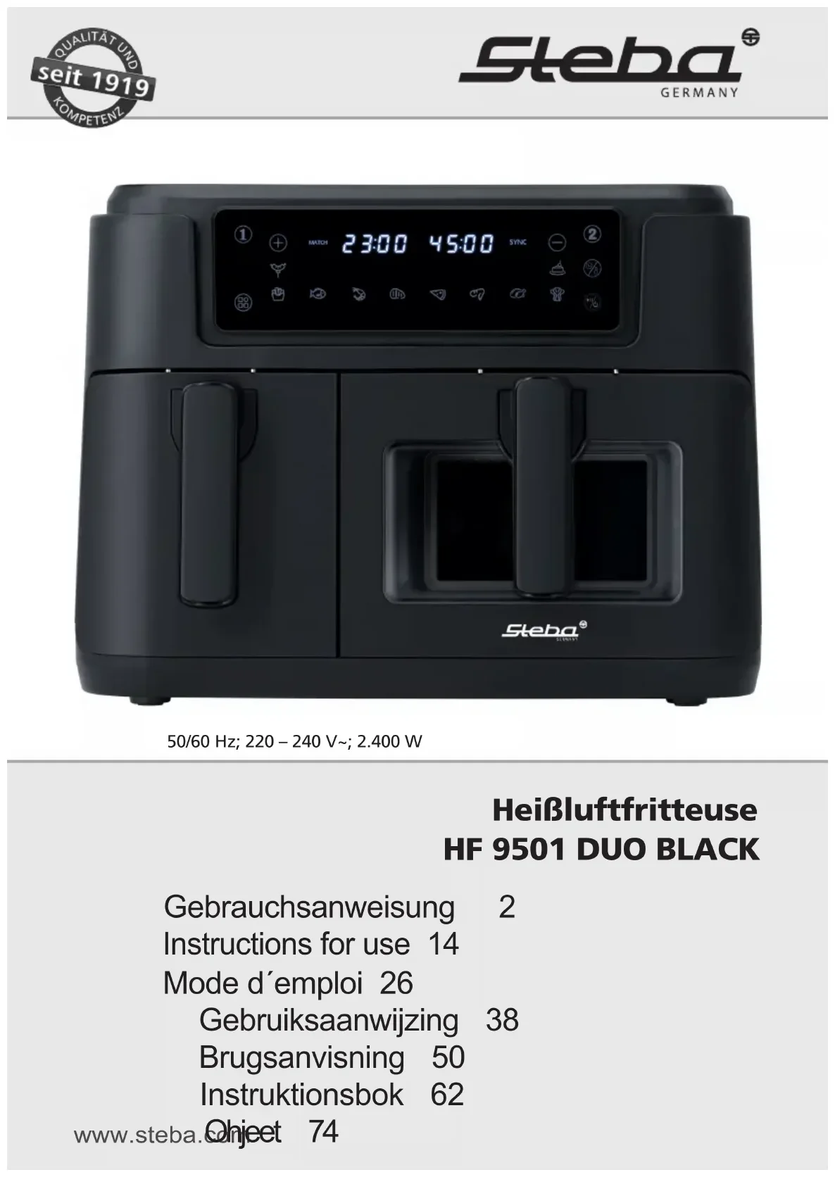 ∙ For example, flashes in the display, the basic values 180°C and 15:00 are shown as well as and . ∙ If you want to change the basic values, press the button . Now choose the time between 1 – 60 minutes. By pressing the button again, select the temperature between 60 – 200°C. ∙ OR you press the button to select a basic program 1 to 10. To do this, press the button repeatedly until the desired program flashes. ∙ Press the button and start the device with the start/stop button. ∙ HOLD lights up in the display for the basket with the shorter cooking time. As soon as the remaining cooking times are identical, both baskets work synchronously. If basket 1 or 2 is pulled out while the program is running, the cooking time will be extended accordingly.23 Attention ∙ Basic programs cannot be changed. ∙ The running program can be switched off during operation. To do this, hold down the start/stop button for 3 seconds. The set values are then deleted. Tips ∙ Ready meals that are prepared in the oven can also be cooked in this device to save energy. ∙ The device is suitable for roasting whole fresh chickens up to 1200g. ∙ Smaller quantities generally require shorter cooking times. ∙ The colder a food, the longer the cooking time. ∙ After half the cooking time, shake smaller foods vigorously and turn larger ones. ∙ Brush breaded foods or fries with a little oil to make them crispier. ∙ Do not prepare high-fat foods (e.g. sausages) at temperatures that are too high.24 Trouble shooting Problem Reason Suggestion Device does not work ∙ It is not connected ∙ Plug in the device ∙ The timer is not set ∙ Set the timer to the desired time The food is not cooked ∙ Too little temperature ∙ Too little time ∙ Too much food ∙ Increase temperature and time and use less food The food is cooked uneven ∙ Turn the food into the bas- ket after half of the time The snacks are not crispy ∙ You may used food which is suitable for deep frying ∙ Use snacks suitable for ovens or put some oil to the food The pot cannot be placed into the device ∙ Too much food in the basket ∙ The basket is not placed correctly into the pot ∙ The basket is jammed into the pot ∙ Place the basket correctly into the pot The device smol- ders ∙ You may used oily food ∙ Wipe out the pot or dab off the food Fresh fries are not crispy ∙ The crispness depends on how much water or oil is on the fries ∙ Dry the fries before adding some oil ∙ Cut the fries a little thinner ∙ Not enough oil25 Correct Disposal of this product This marking indicates that this product should not be disposed with other household wastes throughout the EU. To prevent possible harm to the envi- ronment or human health from uncontrolled waste disposal, recycle it re- sponsibly to promote the sustainable reuse of material resources. To return your used device, please use the return and collection systems or contact the retailer where the product was purchased. They can take this product for environmental safe recycling. Packaging disposal: Do not throw away the package materials. Please put it in the recycling bin. Gift box: Paper, should be put to the old paper collection point. Plastic packaging material and foils should be collected in the spe- cial collection containers. Service and Repair: If the appliance must be repaired, please get in touch with your trader or with the manufacturer: STEBA Elektrogeräte GmbH & Co KG Pointstr. 2, 96129 Strullendorf / Germany Distribution-Tel.: 09543 / 449-17 / -18, Service-Tel.: 09543 / 449-44, Fax: 09543 / 449-19 e-Mail: elektro@steba.com Internet: http://www.steba.com26 Généralement Cet appareil est conçu pour un usage privé et non commercial. Veuillez lire attentivement le mode d‘emploi et gardez-le soi- gneusement. En cas de remise de l‘appareil à une tierce personne, n’oubliez pas de joindre le mode d’emploi. N’utilisez l‘appareil que selon les indications et respectez les consignes de sécurité. Nous déclinons toute responsabilité en cas de dommages ou d’ac- cidents résultant du non-respect des indications du mode d’em- ploi. Enlever tout matériel d’emballage et tous les autocollants (sauf la plaque signalétique). Nettoyez toutes les pièces (voir net- toyage). Consignes de sécurité ∙ Surface chaude ! Il y a un risque de brûlure en tou- chant la surface pendant le fonctionnement. Placez l‘appareil avec le dos avec une distance de 10cm au mur de la cuisine. ∙ L‘appareil doit être branché et utilisé conformément aux indica- tions de la plaque signalétique. ∙ Un dérochage du plaque signalétique n‘est pas autorisé pour des raisons de sécurité. ∙ Contrôler avant chaque utilisation, que l’appareil ou le câble d’alimentation en courant n’est pas endommagé. ∙ Ne touchez jamais la fiche d’alimentation avec des mains mouil- lées. ∙ Connectez la fiche d’alimentation seulement à une prise de courant correctement installée et facilement accessible. ∙ Pour débranchez la fiche d’alimentation, tirez toujours la fiche – pas le câble. ∙ Retirer la prise après chaque utilisation ou en cas de disfonc- tionnement. ∙ N’arracher pas la prise et ne l’endommager pas. Ne coincer pas le câble d’alimentation. ∙ Tenir le câble d’alimentation éloigné des parties chaudes.27 ∙ L‘appareil peut être utilisé par des enfants à partir de 8 ans ainsi que par des personnes atteintes de déficiences phy- siques, sensorielles ou mentales, ou manquant d‘expérience et/ ou de connaissances, si elles sont surveillées ou ont été instruites de la manière d‘utiliser l‘appareil en toute sécurité et qu‘elles en ont compris les dangers potentiels. Le nettoyage et l‘entretien de l‘appareil ne doivent pas être réalisés par des enfants, sauf s‘ils sont âgés de plus de 8 ans et exécutent ces opérations sous surveillance. ∙ Tenir l‘appareil et le cordon d‘alimentation hors de