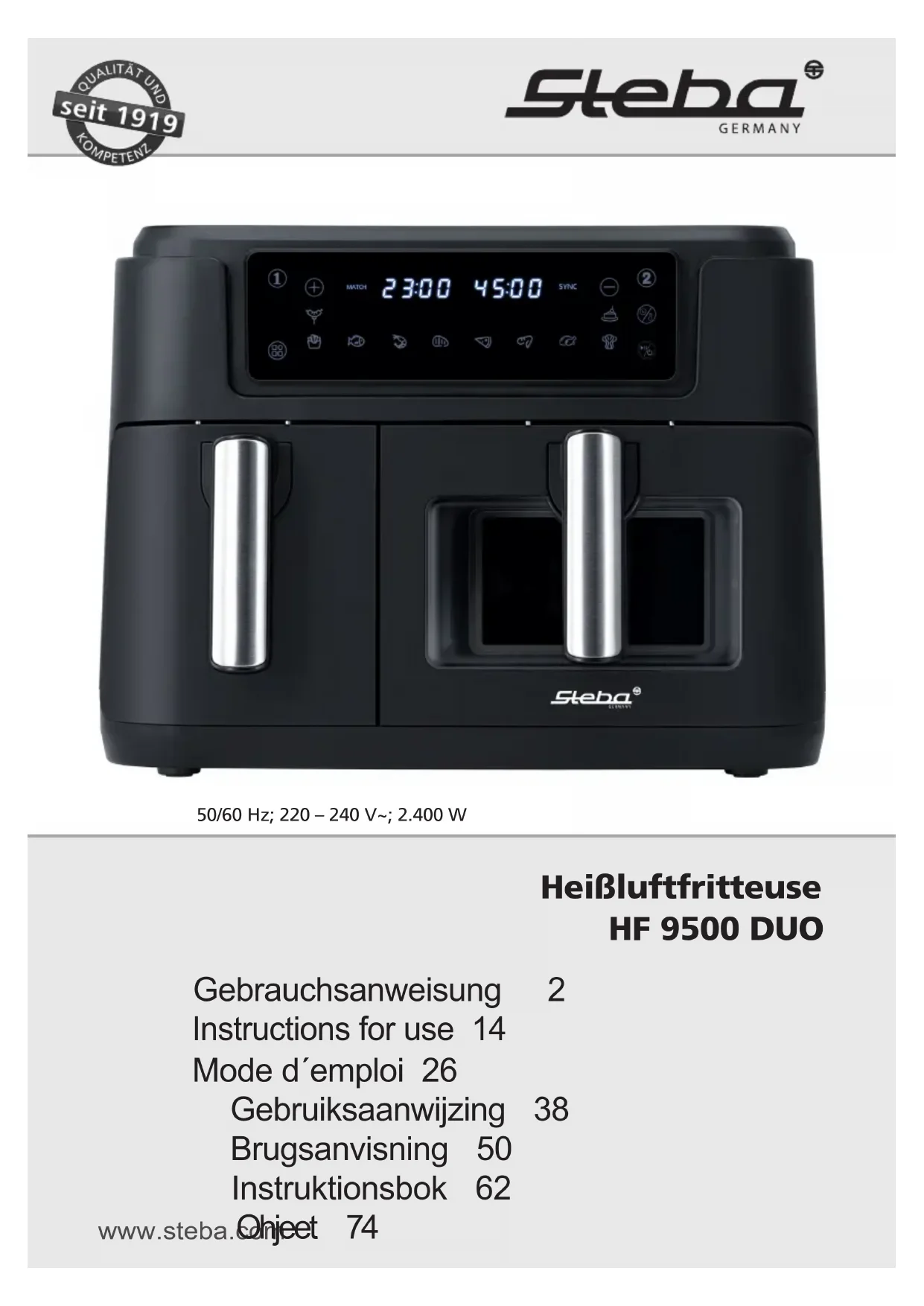 ∙ For example, flashes in the display, the basic values 180°C and 15:00 are shown as well as and . ∙ If you want to change the basic values, press the button . Now choose the time between 1 – 60 minutes. By pressing the button again, select the temperature between 60 – 200°C. ∙ OR you press the button to select a basic program 1 to 10. To do this, press the button repeatedly until the desired program flashes. ∙ Press the button and start the device with the start/stop button. ∙ HOLD lights up in the display for the basket with the shorter cooking time. As soon as the remaining cooking times are identical, both baskets work synchronously. If basket 1 or 2 is pulled out while the program is running, the cooking time will be extended accordingly.23 Attention ∙ Basic programs cannot be changed. ∙ The running program can be switched off during operation. To do this, hold down the start/stop button for 3 seconds. The set values are then deleted. Tips ∙ Ready meals that are prepared in the oven can also be cooked in this device to save energy. ∙ The device is suitable for roasting whole fresh chickens up to 1200g. ∙ Smaller quantities generally require shorter cooking times. ∙ The colder a food, the longer the cooking time. ∙ After half the cooking time, shake smaller foods vigorously and turn larger ones. ∙ Brush breaded foods or fries with a little oil to make them crispier. ∙ Do not prepare high-fat foods (e.g. sausages) at temperatures that are too high.24 Trouble shooting Problem Reason Suggestion Device does not work ∙ It is not connected ∙ Plug in the device ∙ The timer is not set ∙ Set the timer to the desired time The food is not cooked ∙ Too little temperature ∙ Too little time ∙ Too much food ∙ Increase temperature and time and use less food The food is cooked uneven ∙ Turn the food into the bas- ket after half of the time The snacks are not crispy ∙ You may used food which is suitable for deep frying ∙ Use snacks suitable for ovens or put some oil to the food The pot cannot be placed into the device ∙ Too much food in the basket ∙ The basket is not placed correctly into the pot ∙ The basket is jammed into the pot ∙ Place the basket correctly into the pot The device smol- ders ∙ You may used oily food ∙ Wipe out the pot or dab off the food Fresh fries are not crispy ∙ The crispness depends on how much water or oil is on the fries ∙ Dry the fries before adding some oil ∙ Cut the fries a little thinner ∙ Not enough oil25 Correct Disposal of this product This marking indicates that this product should not be disposed with other household wastes throughout the EU. To prevent possible harm to the envi- ronment or human health from uncontrolled waste disposal, recycle it re- sponsibly to promote the sustainable reuse of material resources. To return your used device, please use the return and collection systems or contact the retailer where the product was purchased. They can take this product for environmental safe recycling. Packaging disposal: Do not throw away the package materials. Please put it in the recycling bin. Gift box: Paper, should be put to the old paper collection point. Plastic packaging material and foils should be collected in the spe- cial collection containers. Service and Repair: If the appliance must be repaired, please get in touch with your trader or with the manufacturer: STEBA Elektrogeräte GmbH & Co KG Pointstr. 2, 96129 Strullendorf / Germany Distribution-Tel.: 09543 / 449-17 / -18, Service-Tel.: 09543 / 449-44, Fax: 09543 / 449-19 e-Mail: elektro@steba.com Internet: http://www.steba.com26 Généralement Cet appareil est conçu pour un usage privé et non commercial. Veuillez lire attentivement le mode d‘emploi et gardez-le soi- gneusement. En cas de remise de l‘appareil à une tierce personne, n’oubliez pas de joindre le mode d’emploi. N’utilisez l‘appareil que selon les indications et respectez les consignes de sécurité. Nous déclinons toute responsabilité en cas de dommages ou d’ac- cidents résultant du non-respect des indications du mode d’em- ploi. Enlever tout matériel d’emballage et tous les autocollants (sauf la plaque signalétique). Nettoyez toutes les pièces (voir net- toyage). Consignes de sécurité ∙ Surface chaude ! Il y a un risque de brûlure en tou- chant la surface pendant le fonctionnement. Placez l‘appareil avec le dos avec une distance de 10cm au mur de la cuisine. ∙ L‘appareil doit être branché et utilisé conformément aux indica- tions de la plaque signalétique. ∙ Un dérochage du plaque signalétique n‘est pas autorisé pour des raisons de sécurité. ∙ Contrôler avant chaque utilisation, que l’appareil ou le câble d’alimentation en courant n’est pas endommagé. ∙ Ne touchez jamais la fiche d’alimentation avec des mains mouil- lées. ∙ Connectez la fiche d’alimentation seulement à une prise de courant correctement installée et facilement accessible. ∙ Pour débranchez la fiche d’alimentation, tirez toujours la fiche – pas le câble. ∙ Retirer la prise après chaque utilisation ou en cas de disfonc- tionnement. ∙ N’arracher pas la prise et ne l’endommager pas. Ne coincer pas le câble d’alimentation. ∙ Tenir le câble d’alimentation éloigné des parties chaudes.27 ∙ L‘appareil peut être utilisé par des enfants à partir de 8 ans ainsi que par des personnes atteintes de déficiences phy- siques, sensorielles ou mentales, ou manquant d‘expérience et/ ou de connaissances, si elles sont surveillées ou ont été instruites de la manière d‘utiliser l‘appareil en toute sécurité et qu‘elles en ont compris les dangers potentiels. Le nettoyage et l‘entretien de l‘appareil ne doivent pas être réalisés par des enfants, sauf s‘ils sont âgés de plus de 8 ans et exécutent ces opérations sous surveillance. ∙ Tenir l‘appareil et le cordon d‘alimentation hors de