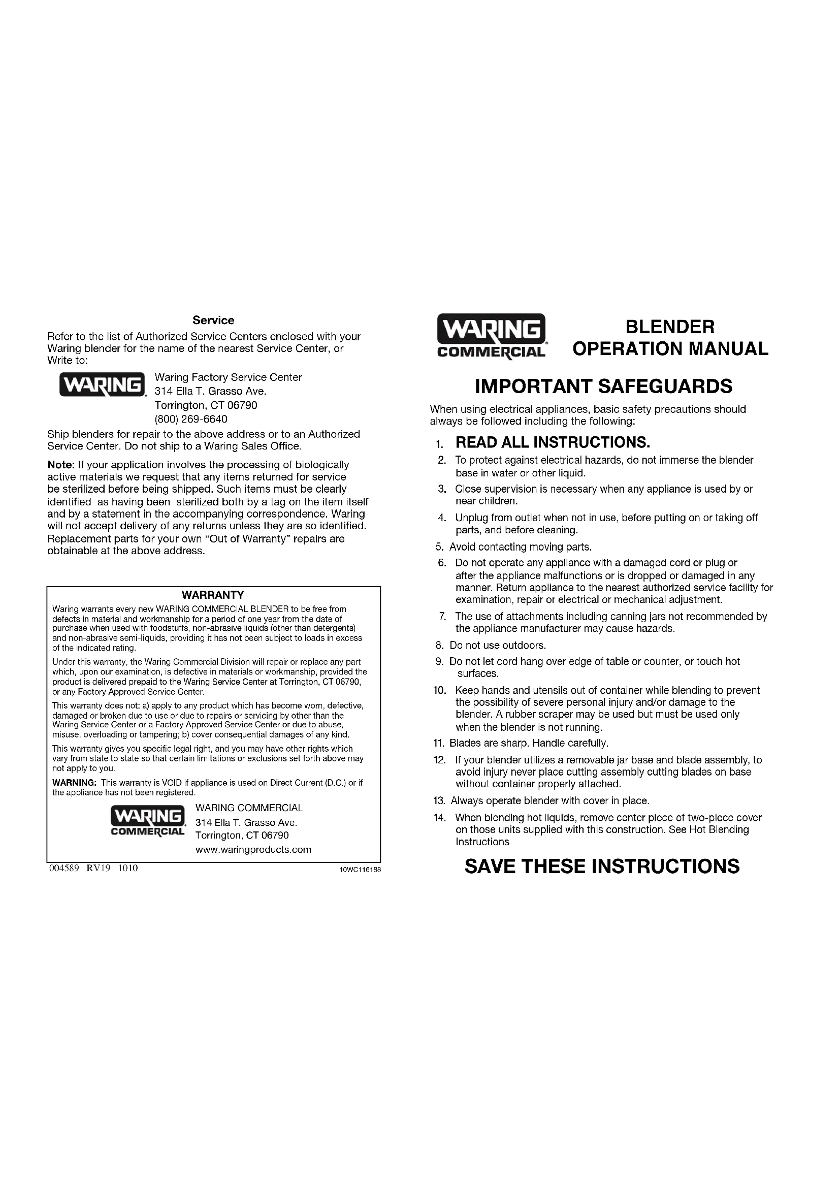 SERVICE Reportez-vous à la liste de centres de service autorisés incluse avec votre mélangeur Waring pour le nom du centre de service le plus près, ou Écrivez à : Waring Factory Service Center 314 Ella T. Grasso Ave. Torrington, CT 06790 (800) 269-6640 Expédiez les mélangeurs pour réparation à l’adresse ci-haut ou à un centre de service autorisé. N’expédiez pas au bureau des ventes Waring. Remarque : Si votre application inclut le traitement de matériaux biologiquement actifs, nous demandons que tous les articles retournés pour leur entretien soient stérilisés avant leur expédition. Ces articles doivent être clairement identiés comme stérilisés par une étiquette sur l’article même et par une déclaration dans la correspondance d’accompagnement. Waring n’acceptera pas de livraison d’articles retournés à moins qu’ils ne soient identiés de cette manière. Vous pouvez obtenir des pièces de rechange pour vos propres réparations « hors garantie » à l’adresse précédente. GARANTIE Waring garantit tout nouveau MÉLANGEUR WARING COMMERCIAL libre de tous défauts de matériau et de main d’œuvre pendant une période d’un an à partir de la date d’achat lorsqu’il est utilisé avec des aliments, des liquides non-abrasifs (autres que des détergents) et des semi-liquides non-abrasifs, pourvu qu’il ne soit pas soumis à des charges dépassant la valeur nominale indiquée.Sous cette garantie, la division commerciale Waring réparera ou remplacera toute pièce qui, suite à notre examen, est défectueuse en termes de matériaux ou de main d’œuvre si le produit est livré prépayé au centre de service Waring à Torrington, CT 06790, ou à tout centre de service approuvé en usine.Cette garantie ne : a) s’applique pas à tout produit qui est devenu usé, défectueux, endommagé ou brisé suite à une utilisation ou à cause de réparations ou de réparations par d’autres que le centre de service Waring ou un centre de service approuvé en usine ou à cause d’abus, de mauvaise utilisation, de surcharge ou d’altération, b) couvre pas les dommages consécutifs de quelque sorte que ce soit.Cette garantie vous donne des droits légaux précis, et vous pouvez aussi avoir d’autres droits qui varient d’un état à l’autre. Il se peut donc que certaines limitations ou exclusions indiquées ne s’appliquent pas dans votre cas.